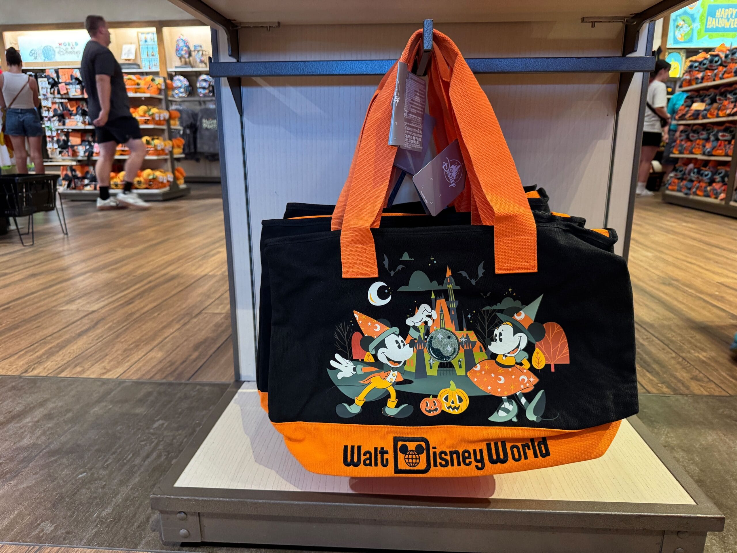 The sturdier canvas tote can be added for $29.99 to any merchandise purchase of $40 or more. It’s black with an orange base and handles. Screen art of Wizard Mickey, Witch Minnie, and the Halloween castle is on the front. Mickey makes an embroidered crystal ball float. “Walt Disney World” is embroidered on the base. Some elements glow under a black light.