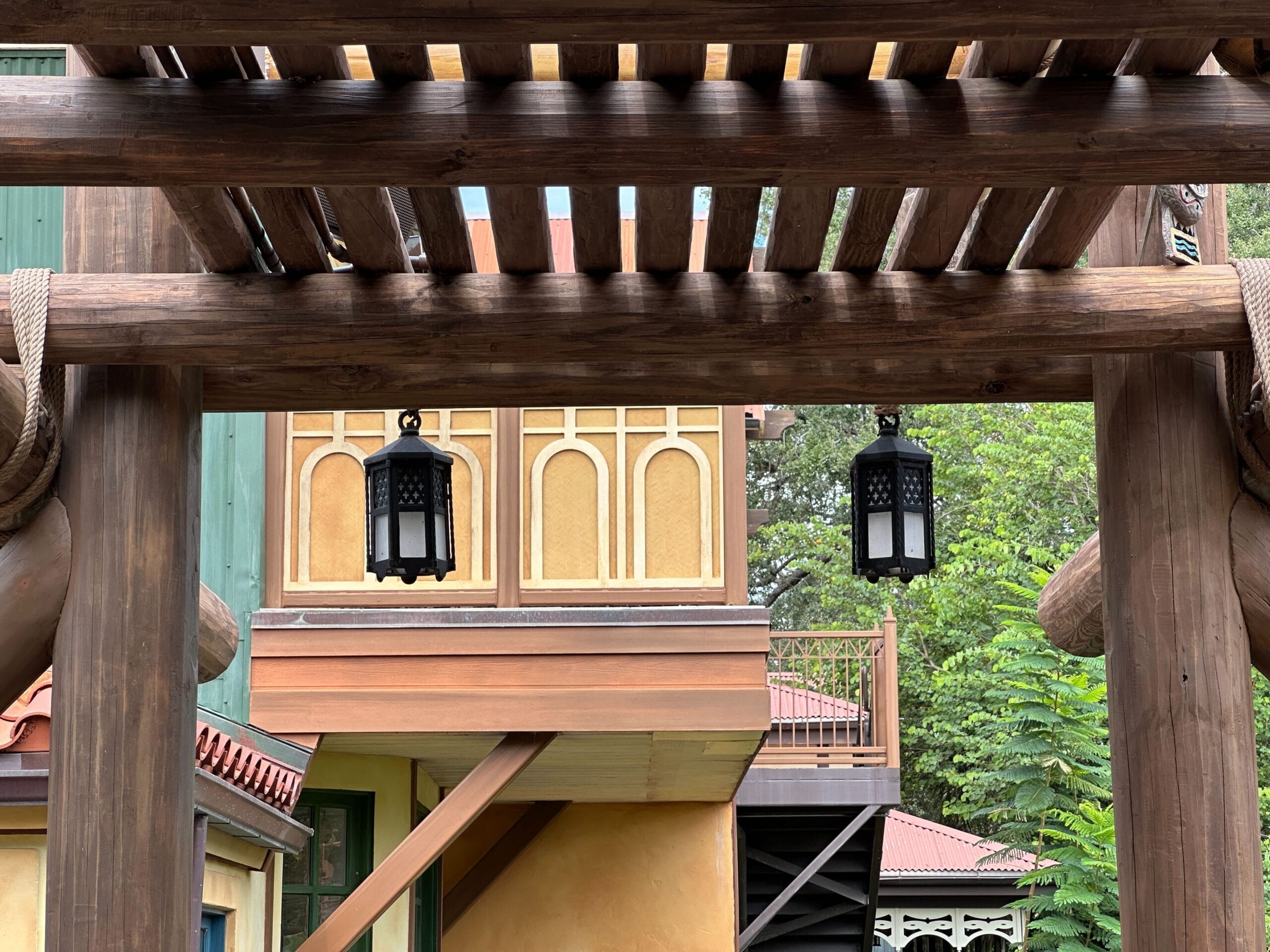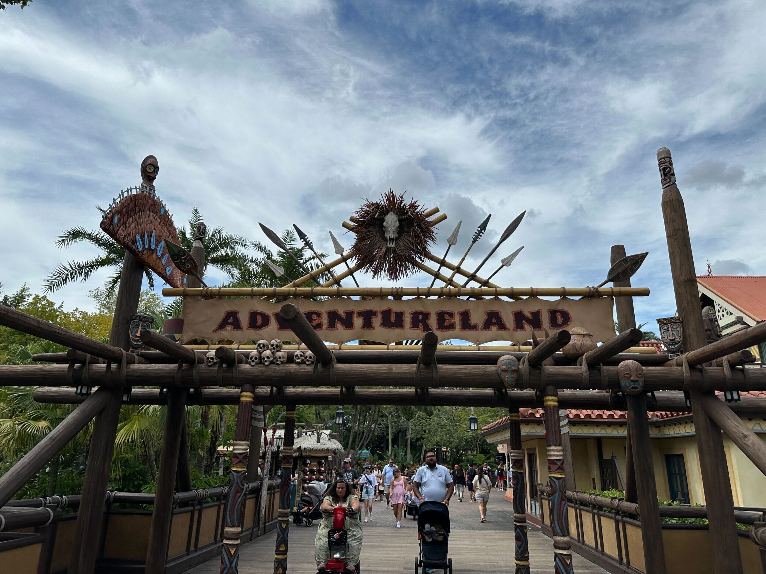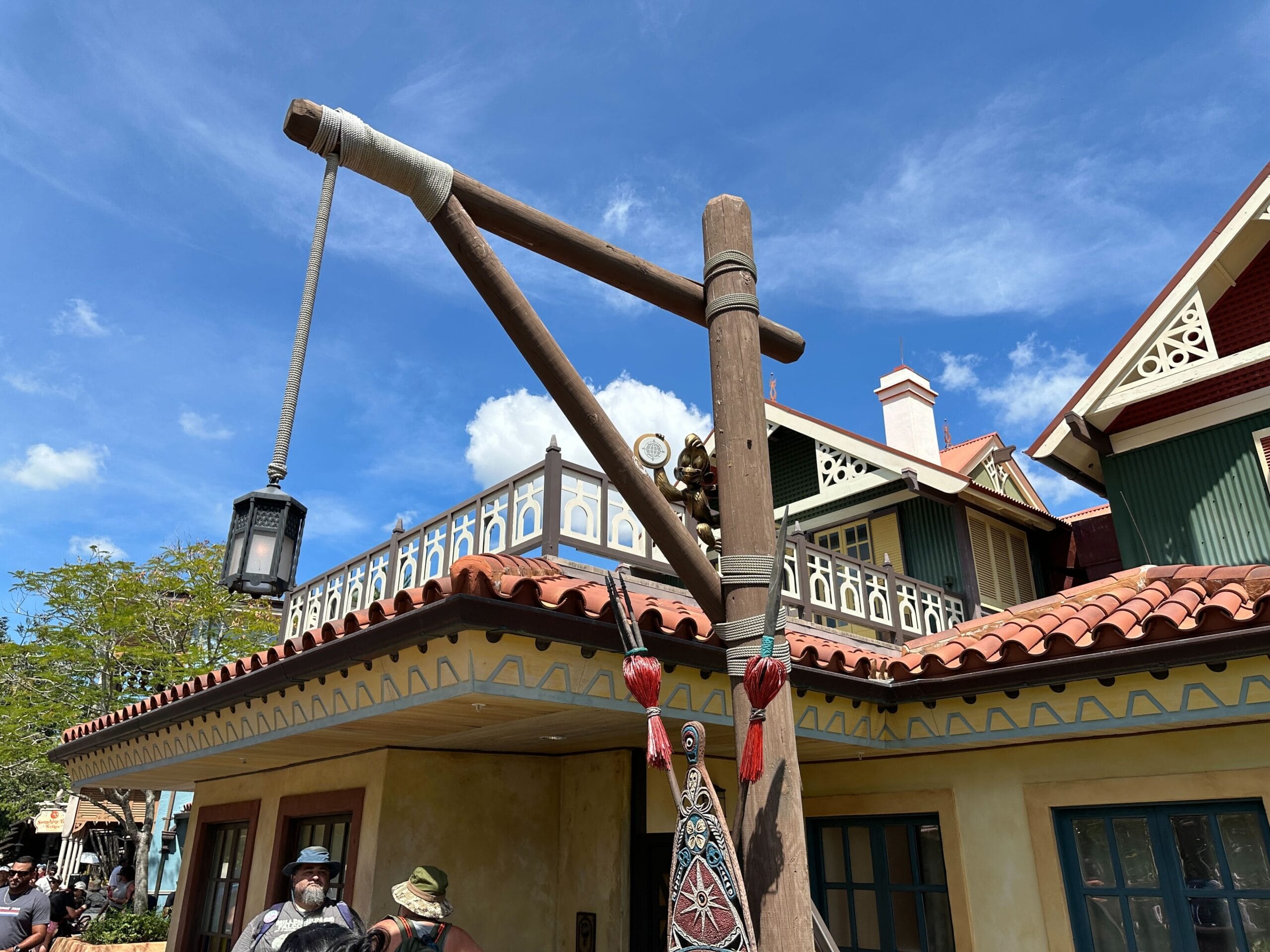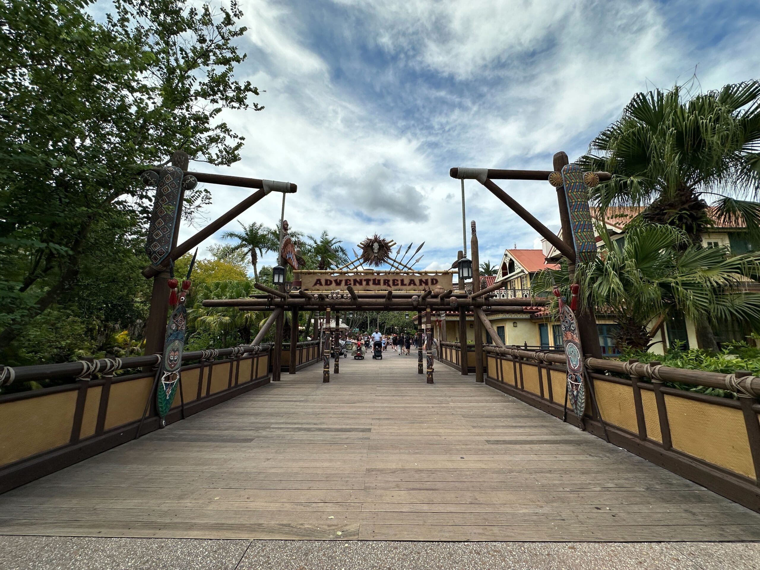 The refurbishment of the Adventureland sign at Magic Kingdom is complete with all props back on the land’s bridge.