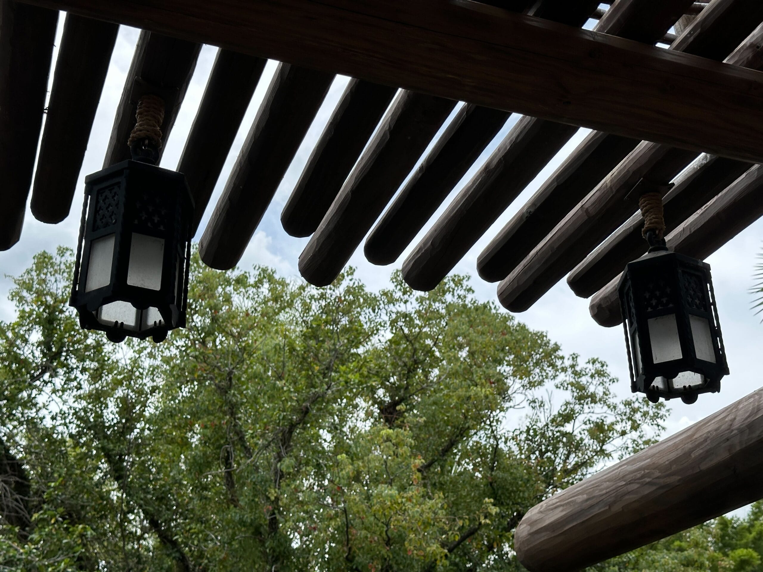 The new fabric banner has hand-stitched lettering. It’s supported by faux bamboo on faux wood posts. The only other significant differences to the sign are the rope elements being darker than before and the straw around the animal skull being straighter.