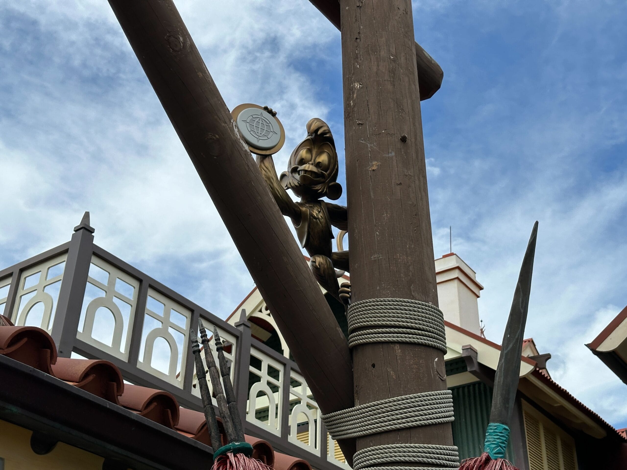 When the sign was removed, the golden Abu Fab 50 statue was moved to this post closer to the Club 33 entrance at the end of the bridge. He remains there and it might be his new permanent home.