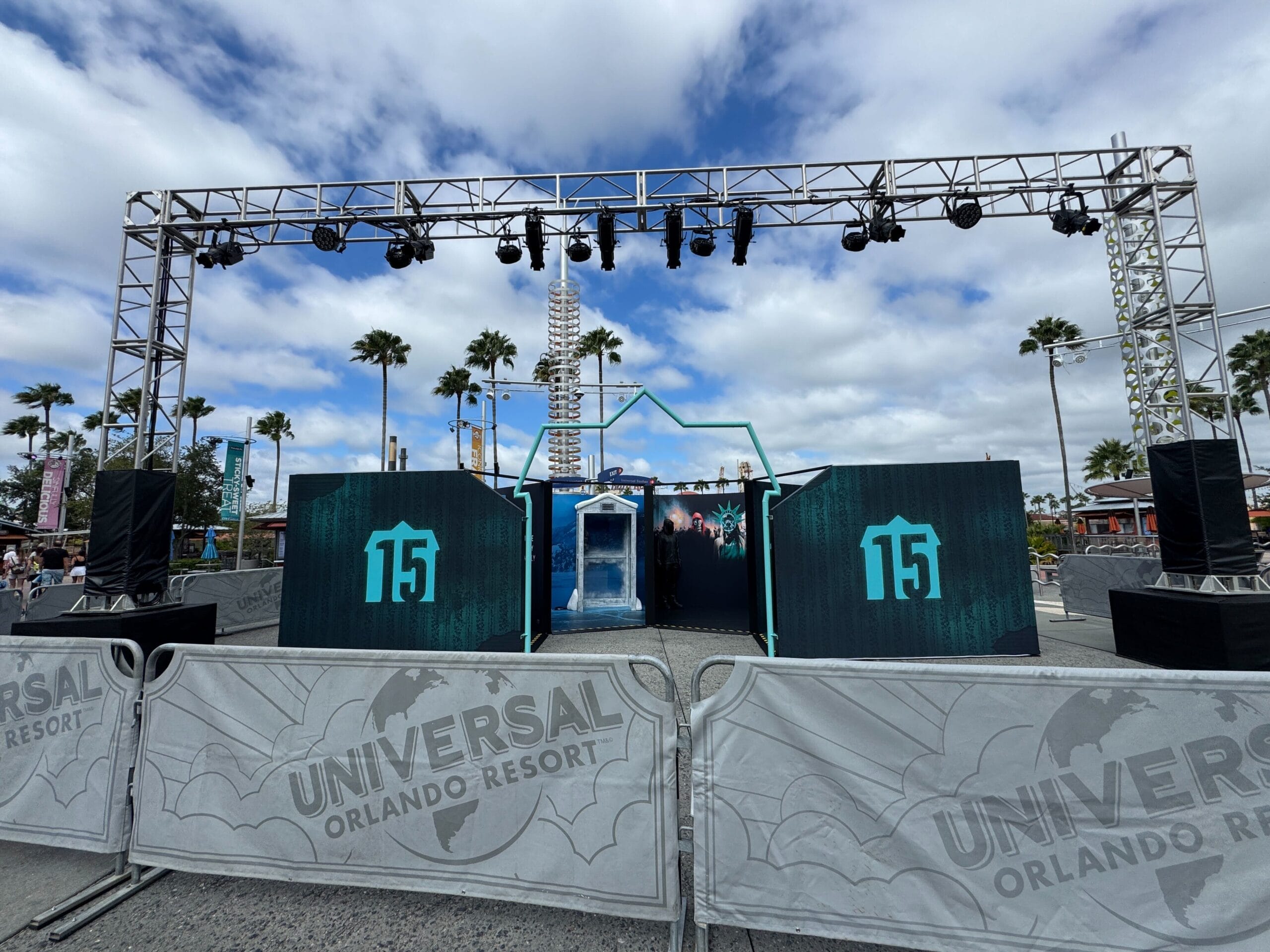 The experience is behind barriers near the lagoon stage. A set of trusses with stage lights is over the experience. It features a Blumhouse 15th anniversary logo on the walls and an entryway shaped like the Blumhouse logo.