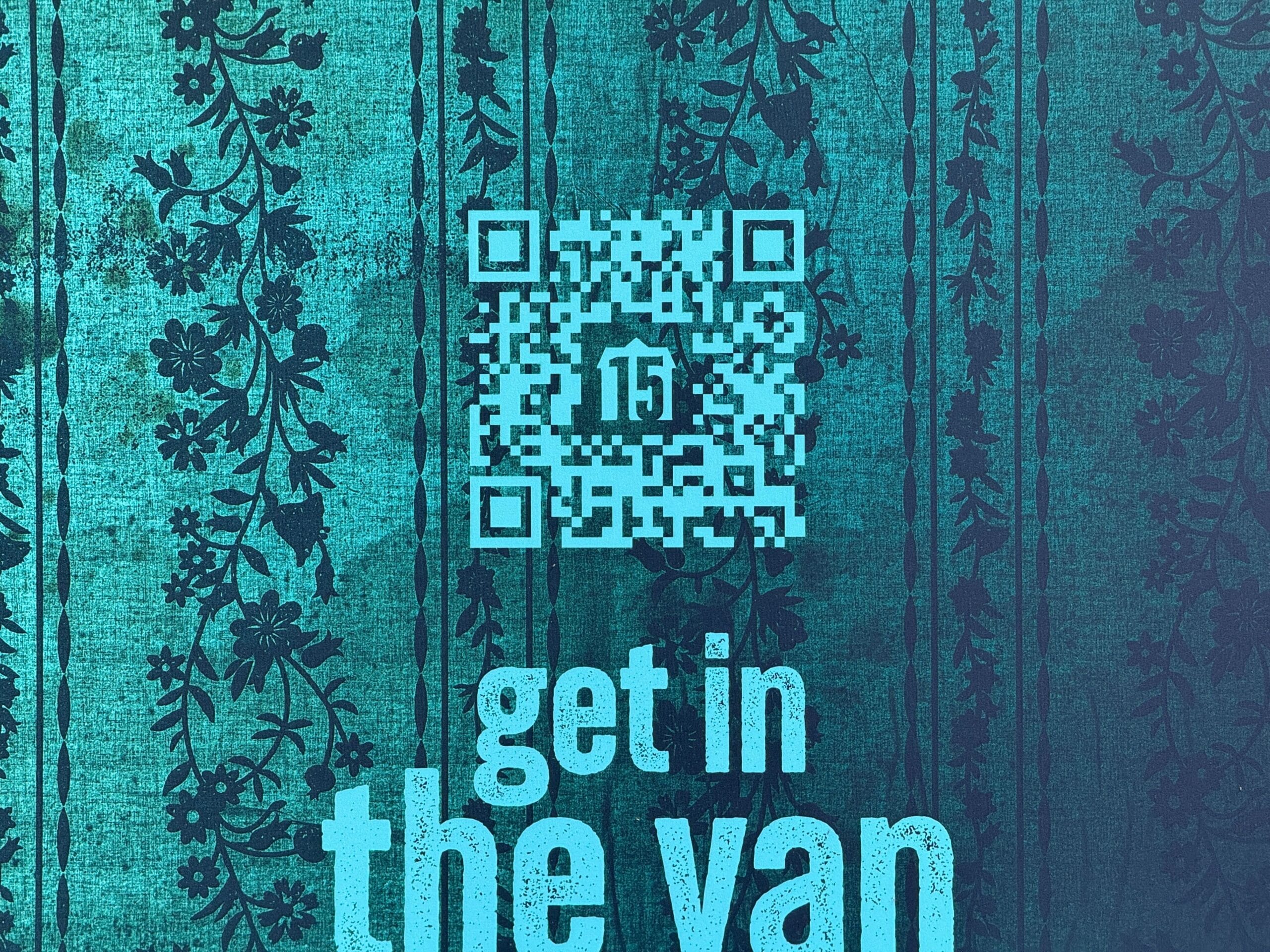 The QR code leads to a subscription page for The Van newsletter from Blumhouse: “Ride shotgun with hardcore fans as we off-road into horror’s furthest reaches with exclusives, first looks, and cool surprises.”