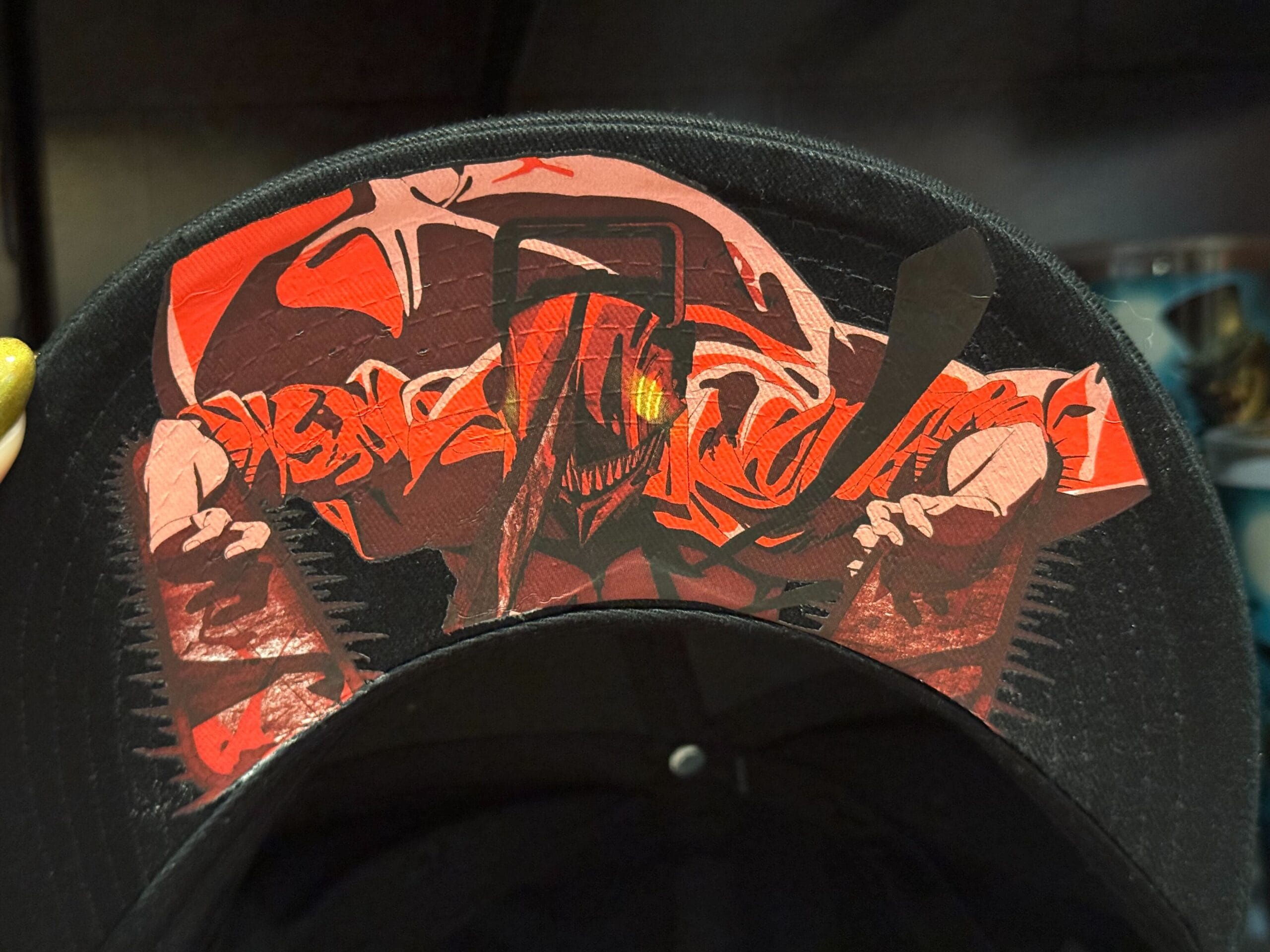 The top and brim are black with red stitching and blood splatter. The other side of the hat is similarly black with blood splatter, plus “Art Was Here” in red.
