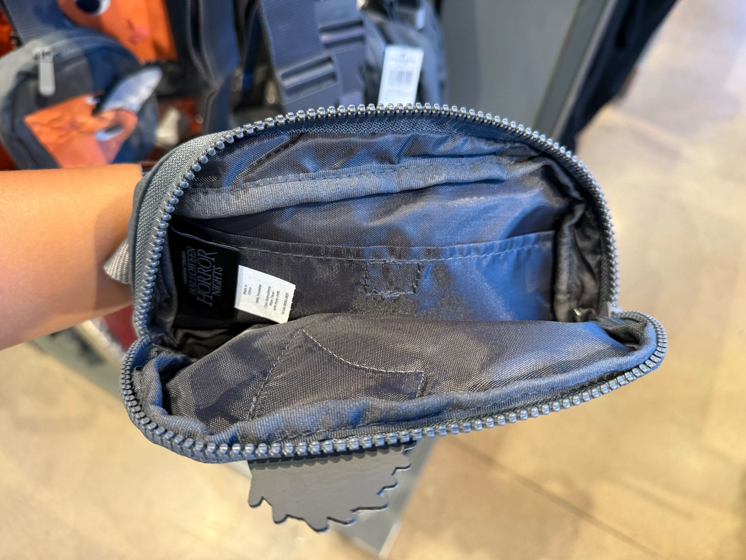 The back is black with a slip pocket and a HHN label. The black adjustable strap features more blood splatter. The interior lining is also black and red.