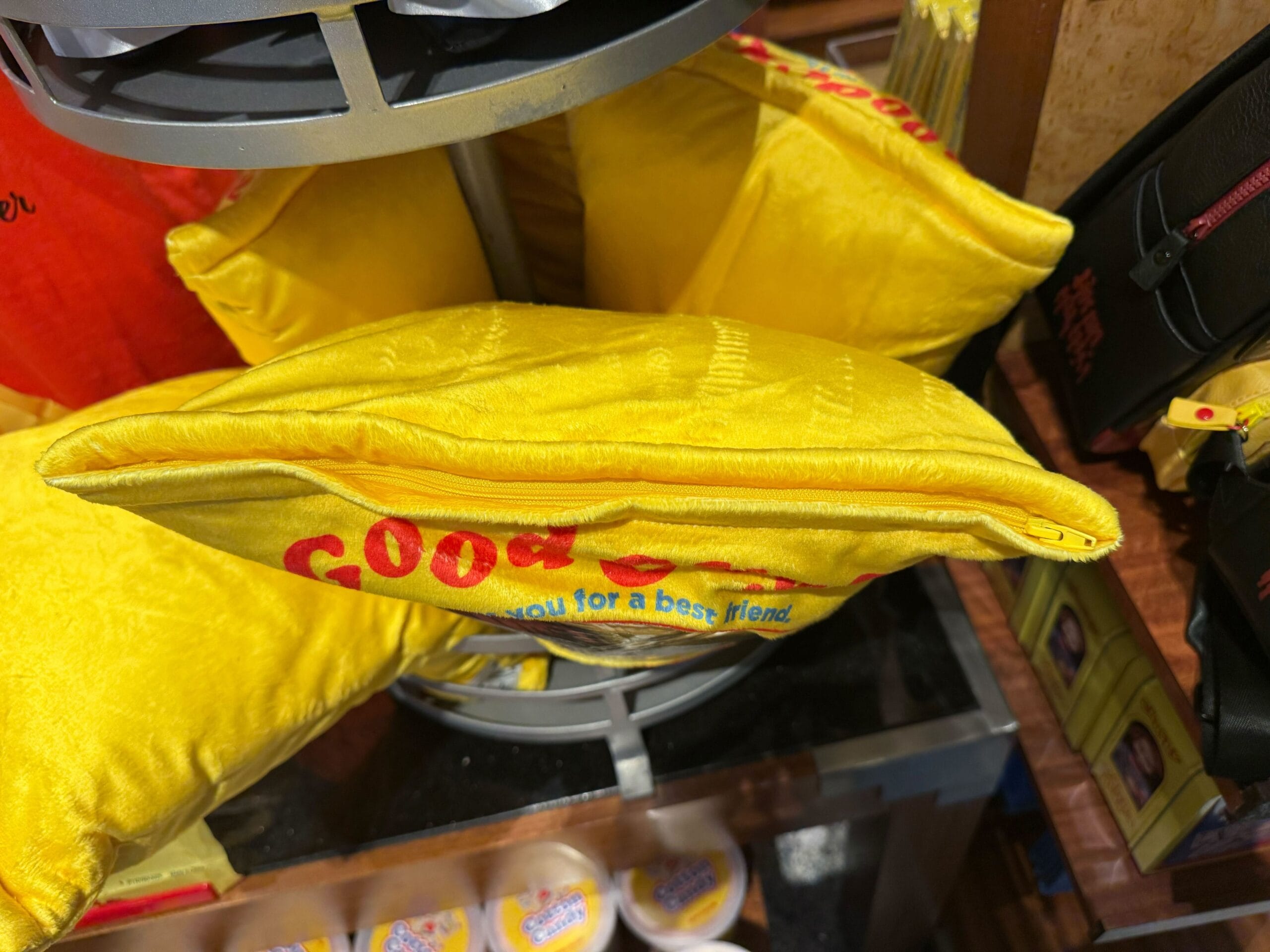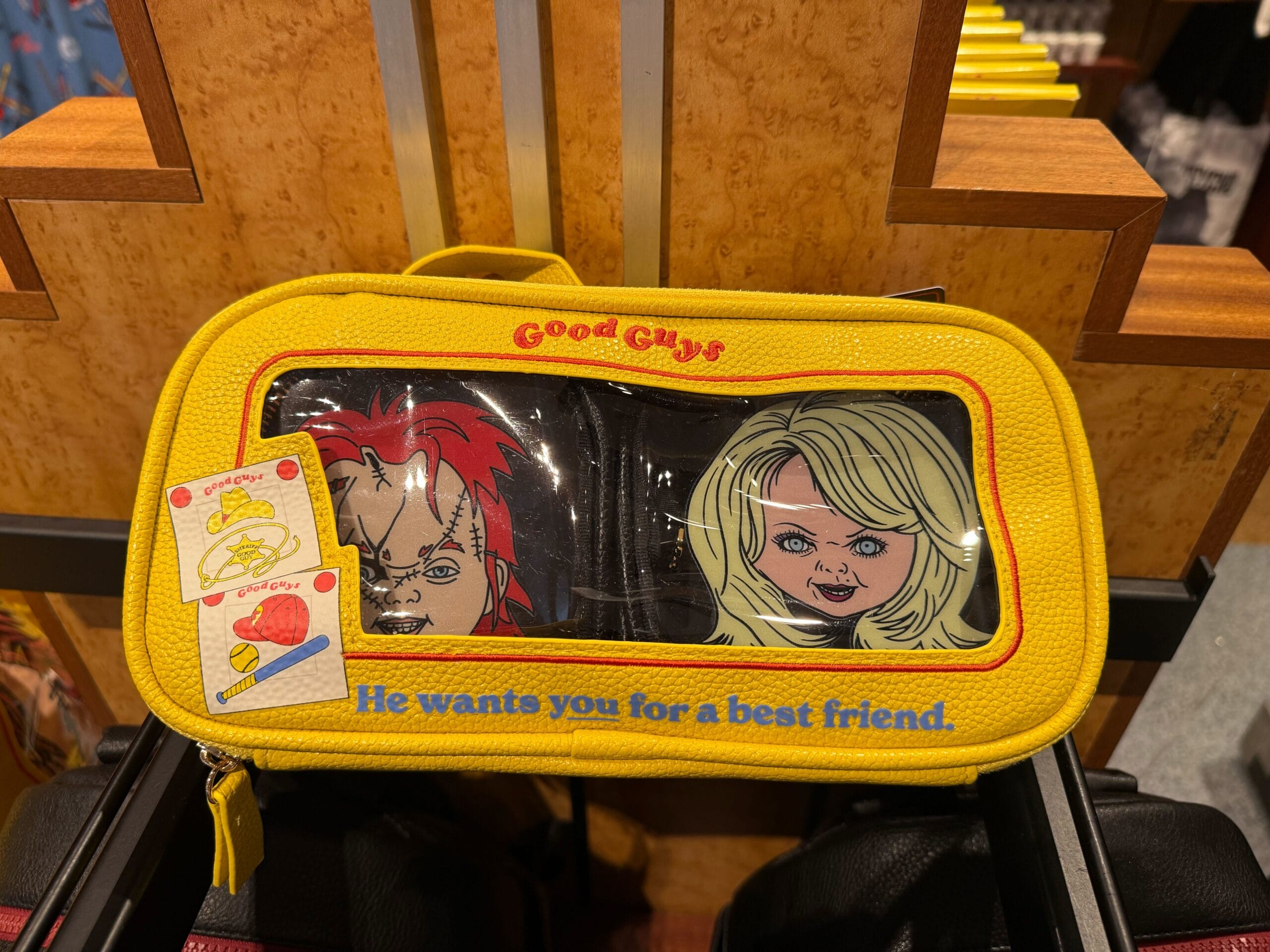 This simulated leather bag is rectangular with a clear window on one side, made to resemble a Good Guys doll box. It’s yellow with images of Good Guys accessories below the window. Above is “He wants you for a best friend.”