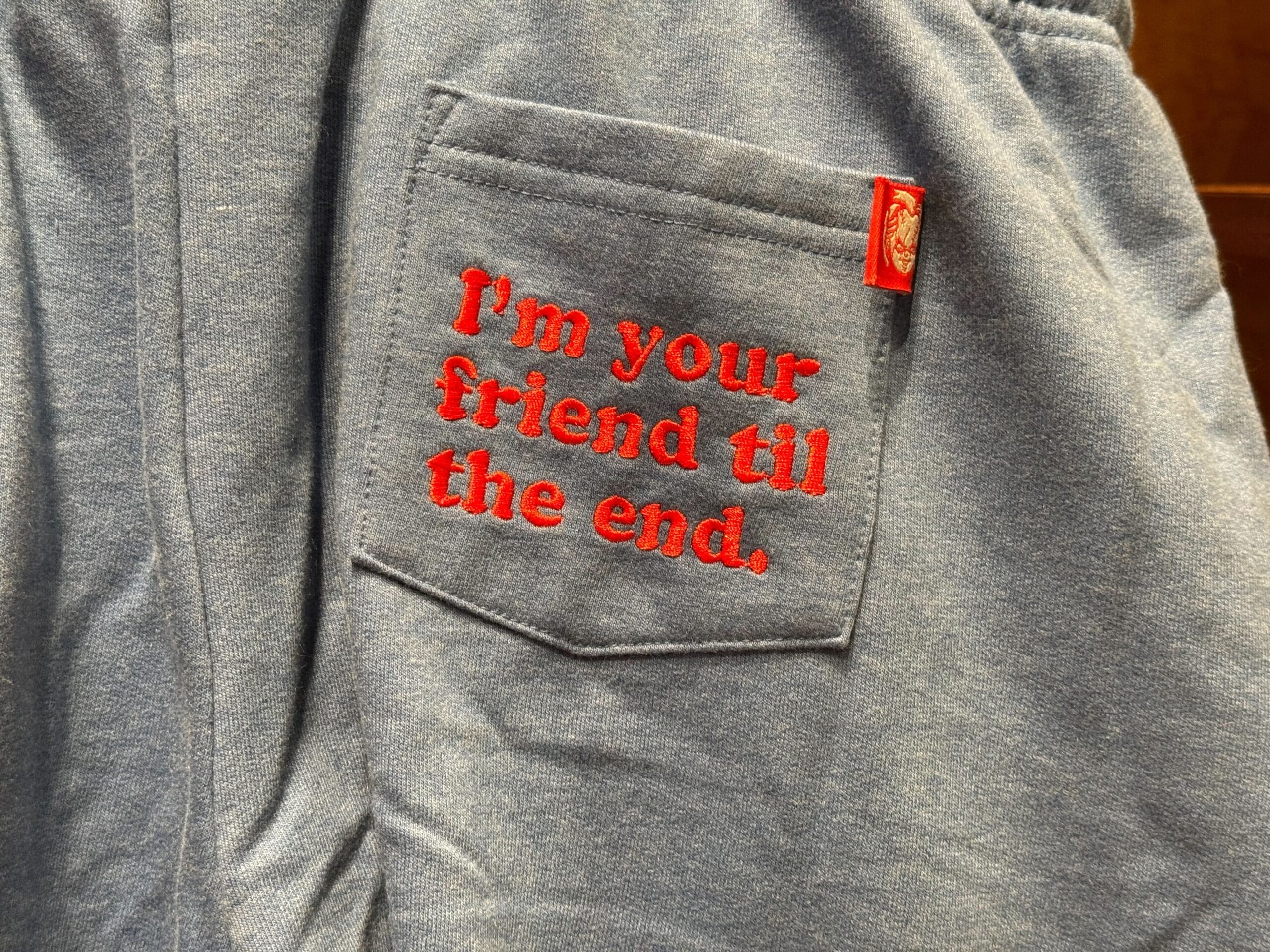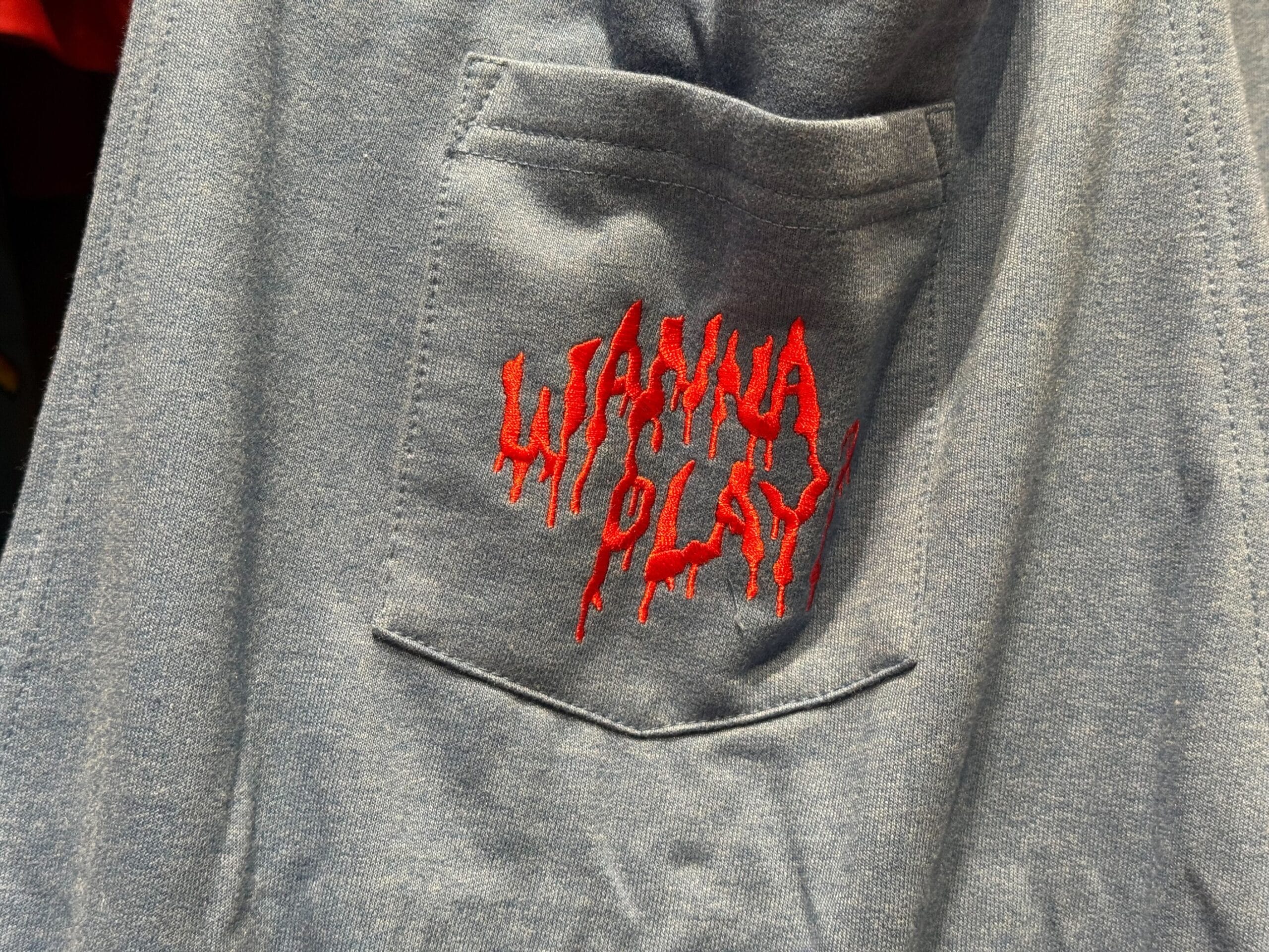 The artwork on this merch line honors this year’s Terror Tram with an image of a tram overflowing with blood, surrounded by M3GAN, the Grabber, the Blissfield Butcher, and Purgers. The artwork is found on the back of this pullover hoodie. On the front is the Halloween Horror Nights 2025 logo in red.