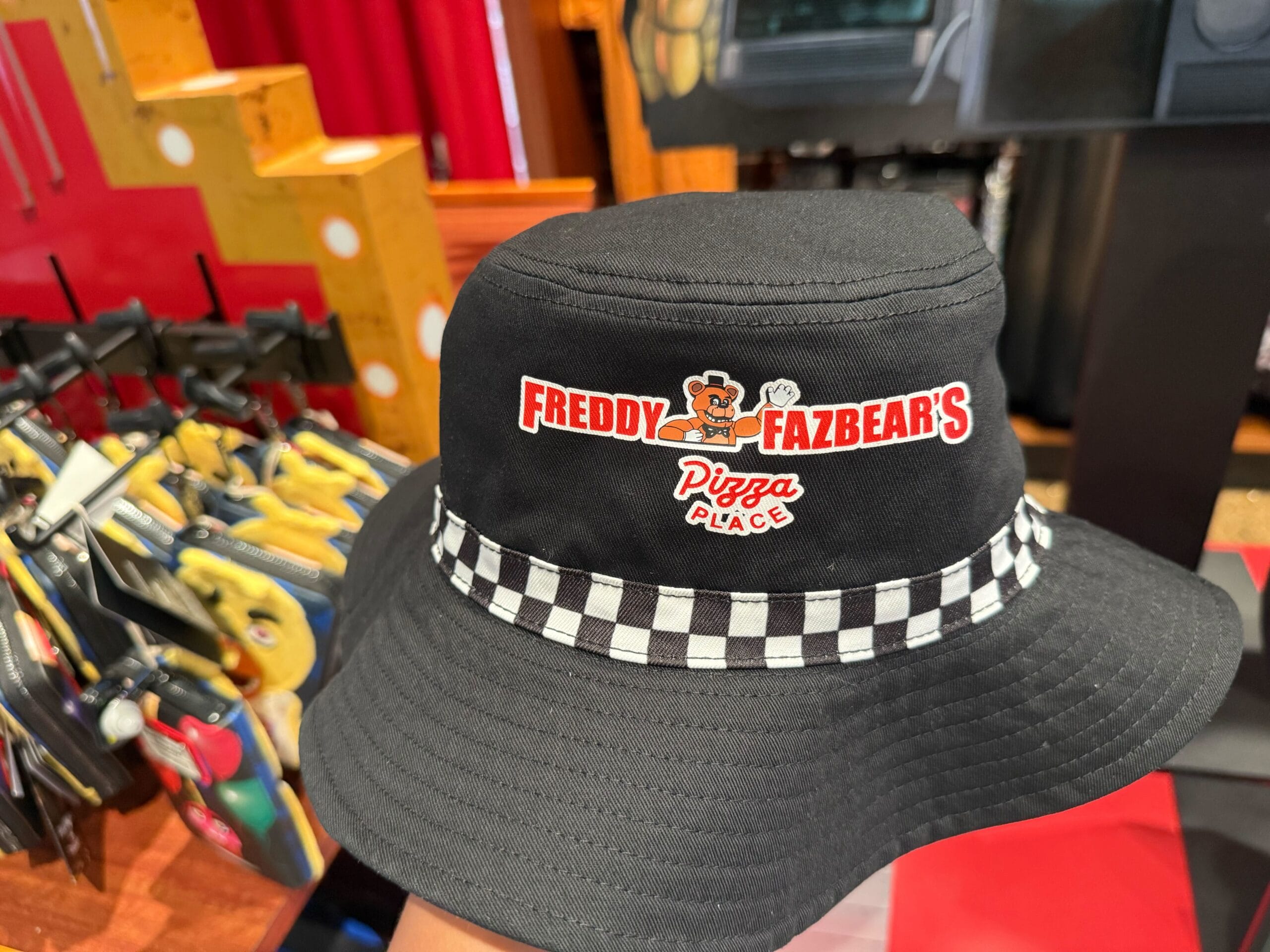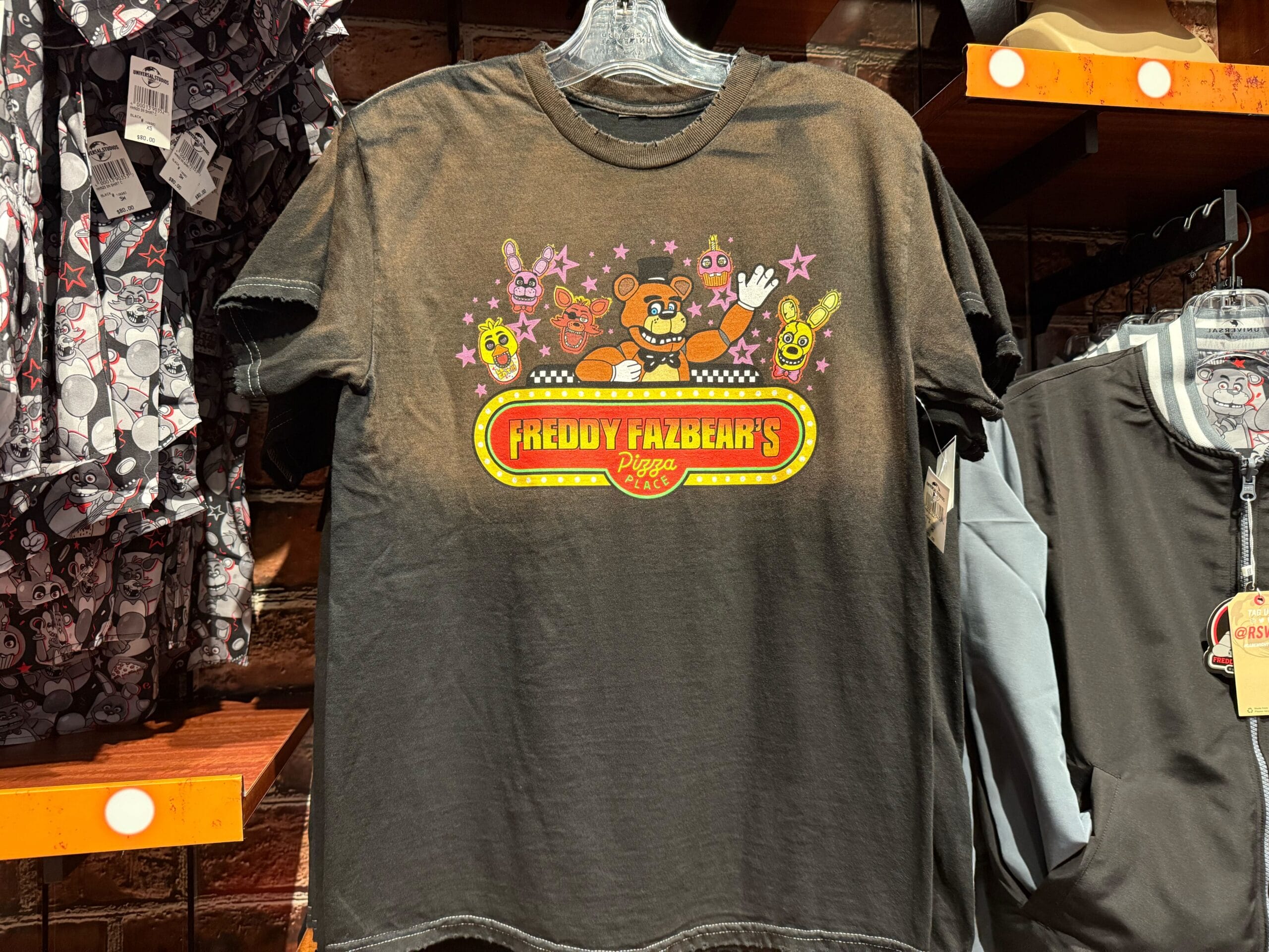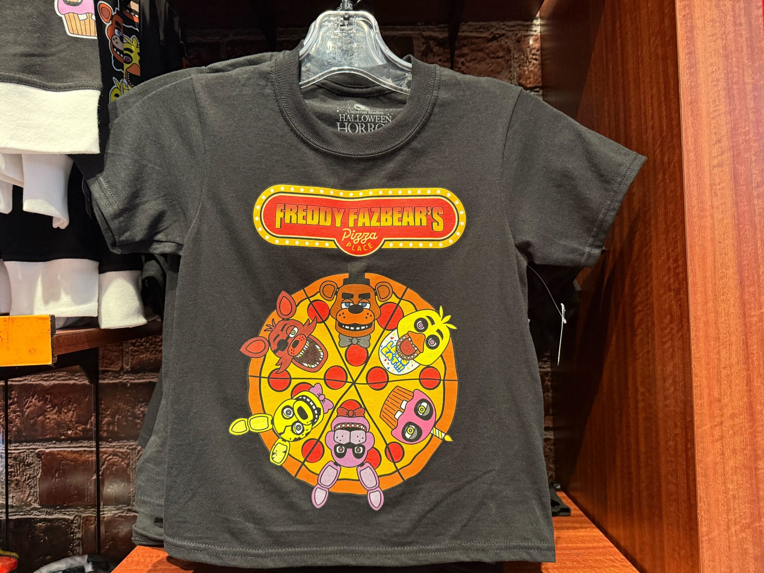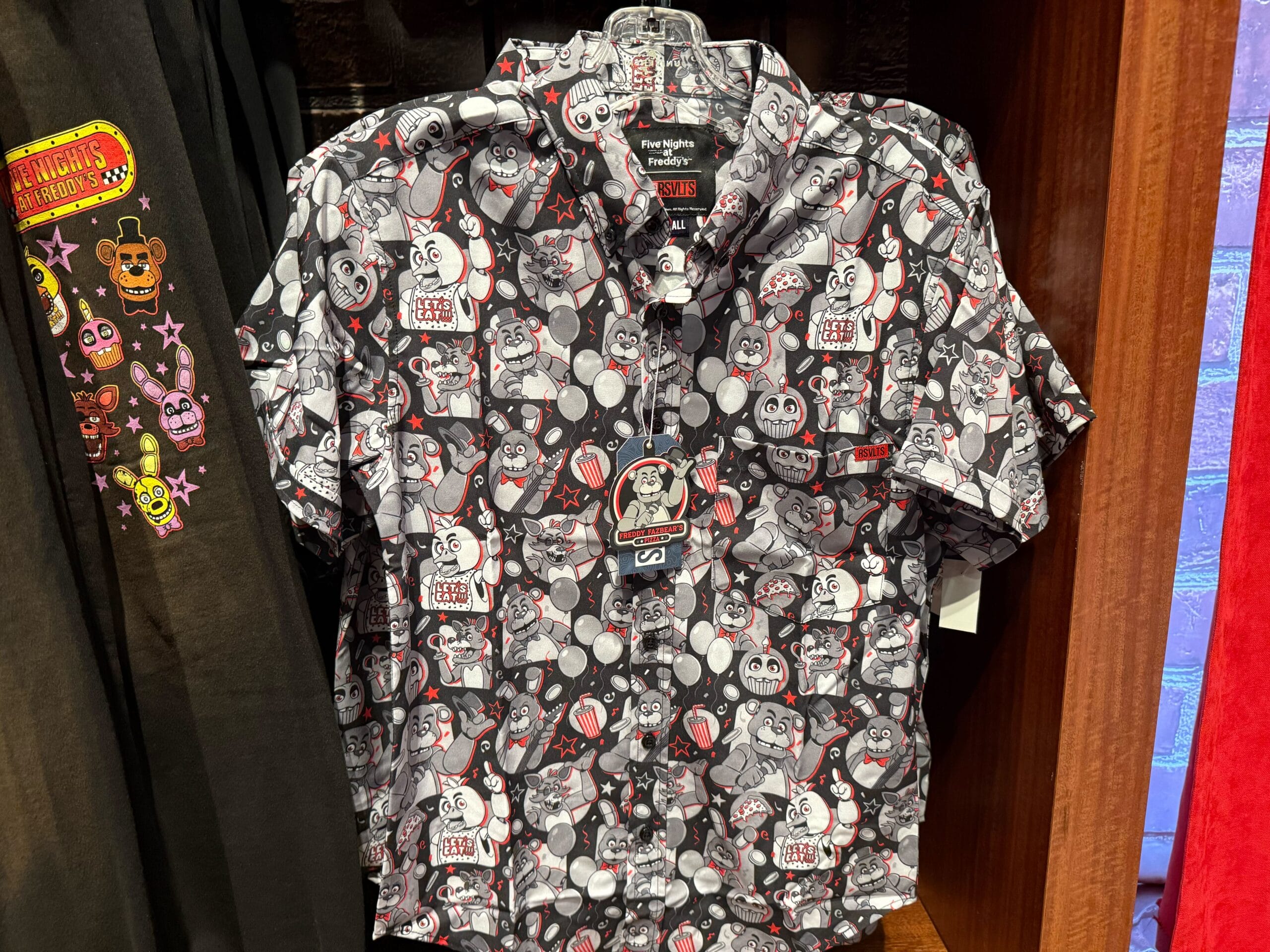 Freddy Fazbear’s Pizza logos are printed on both the front and back, with the name in red embroidery. The back has Freddy tipping his hat, and the extra tagline, “Where fantasy and fun come to life!”
