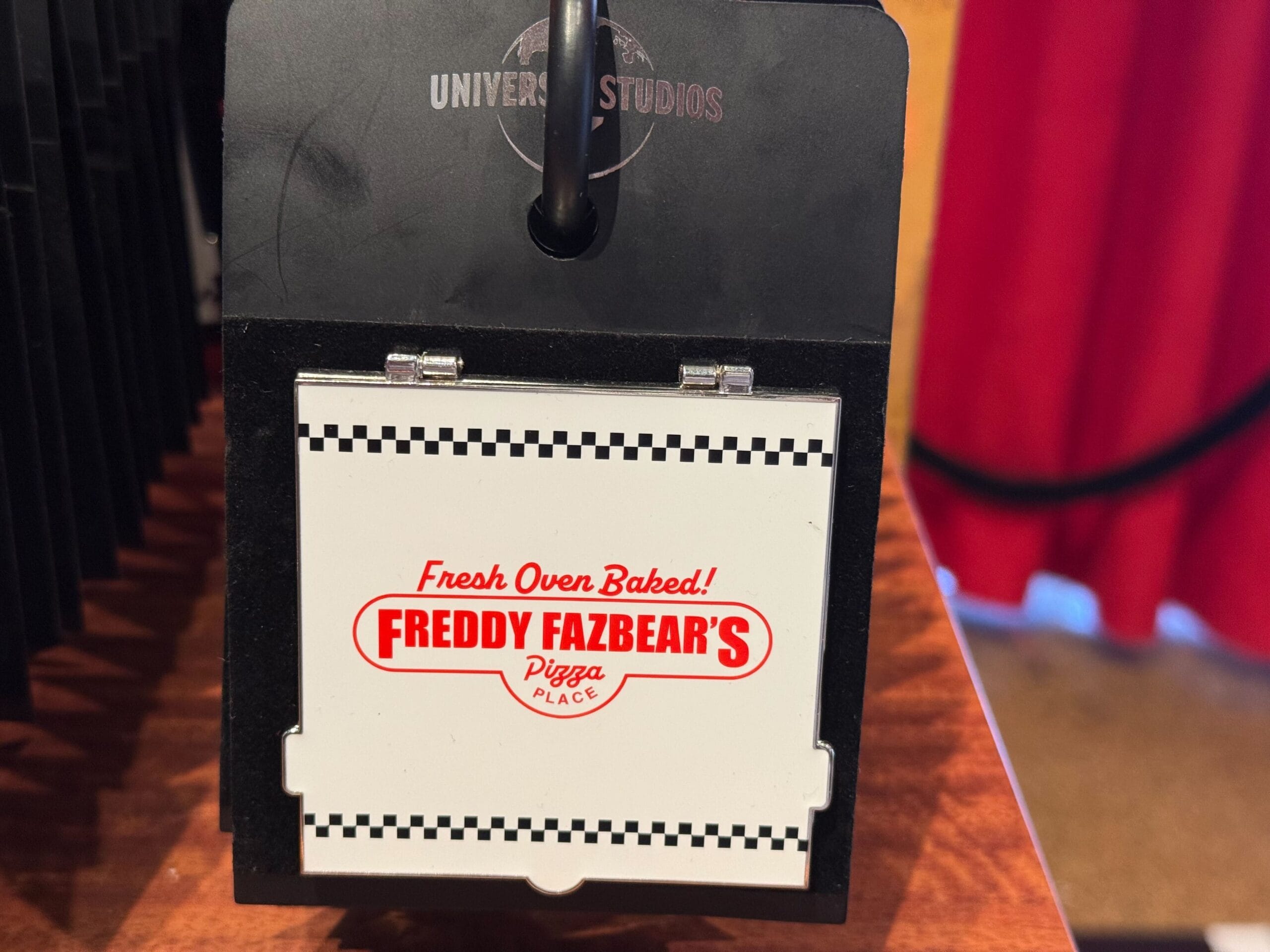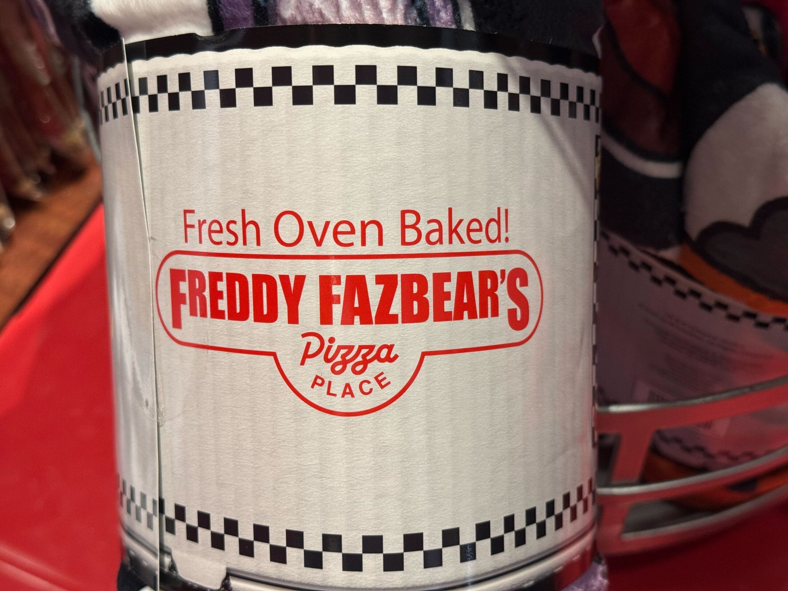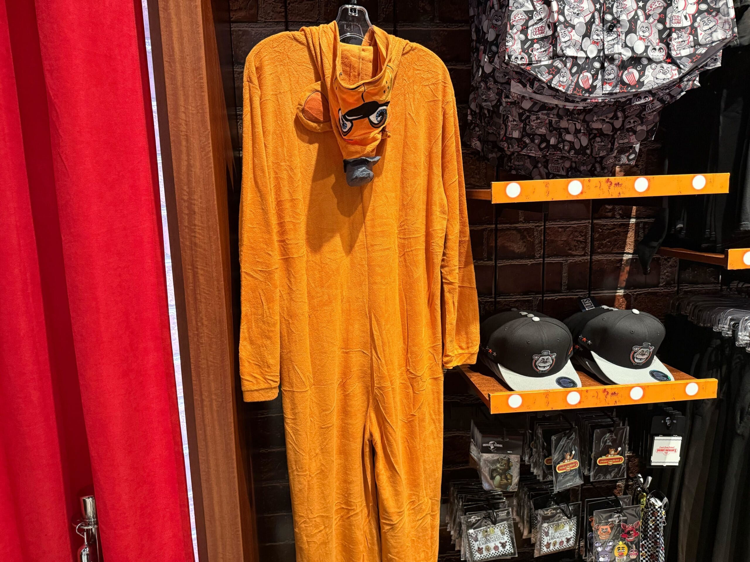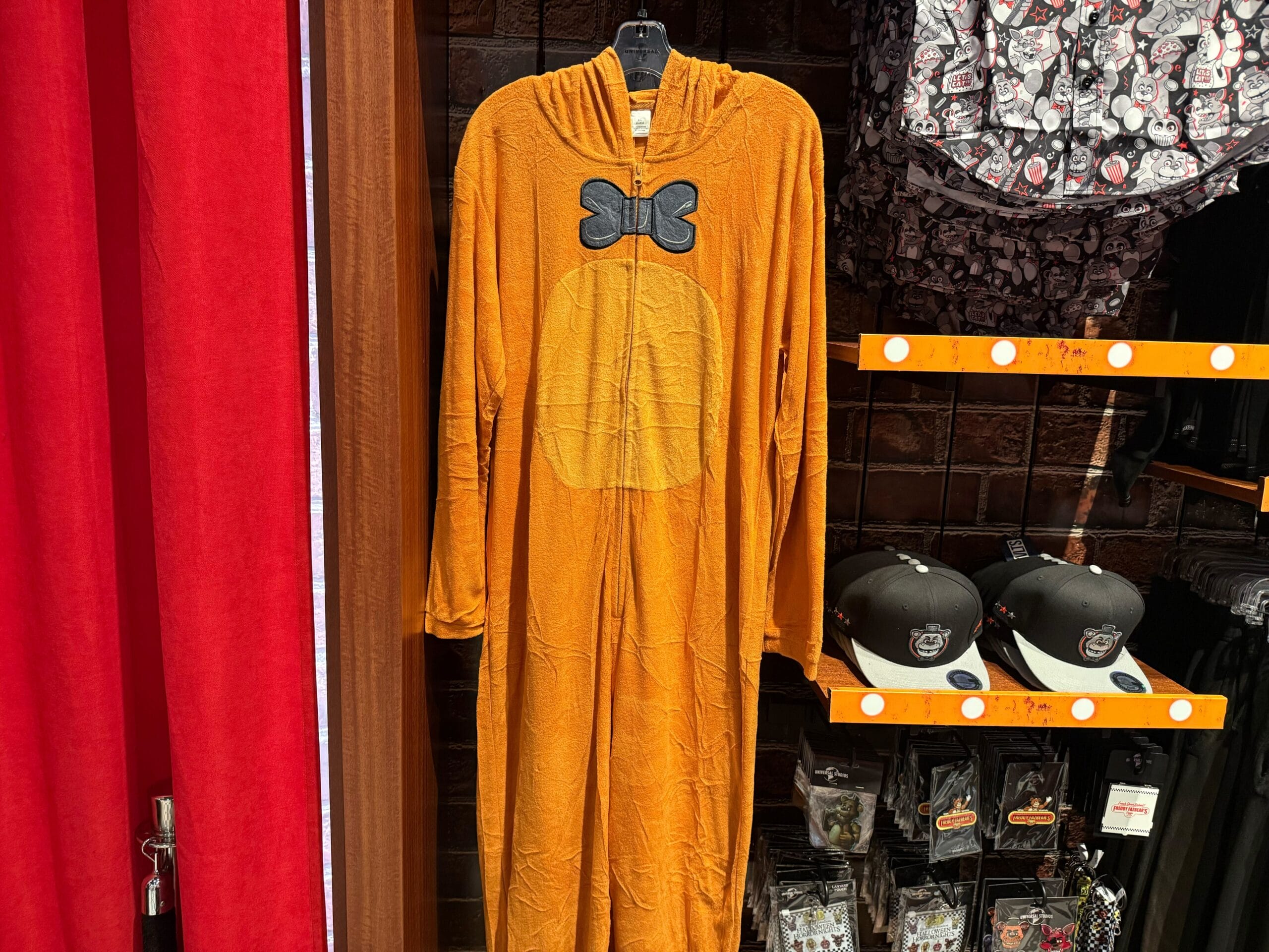 Freddy Fazbear’s Pizza logos are printed on both the front and back, with the name in red embroidery. The back has Freddy tipping his hat, and the extra tagline, “Where fantasy and fun come to life!”