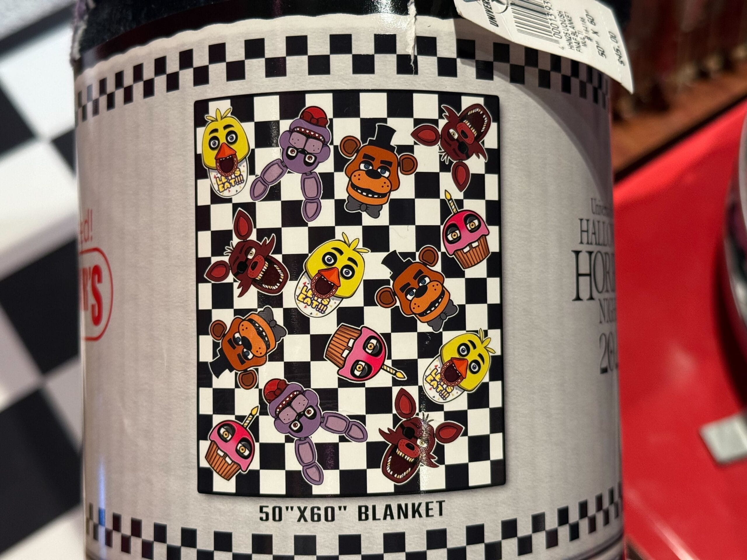 Down the sleeves are the faces of the various animatronic creatures of Five Nights at Freddy’s.
