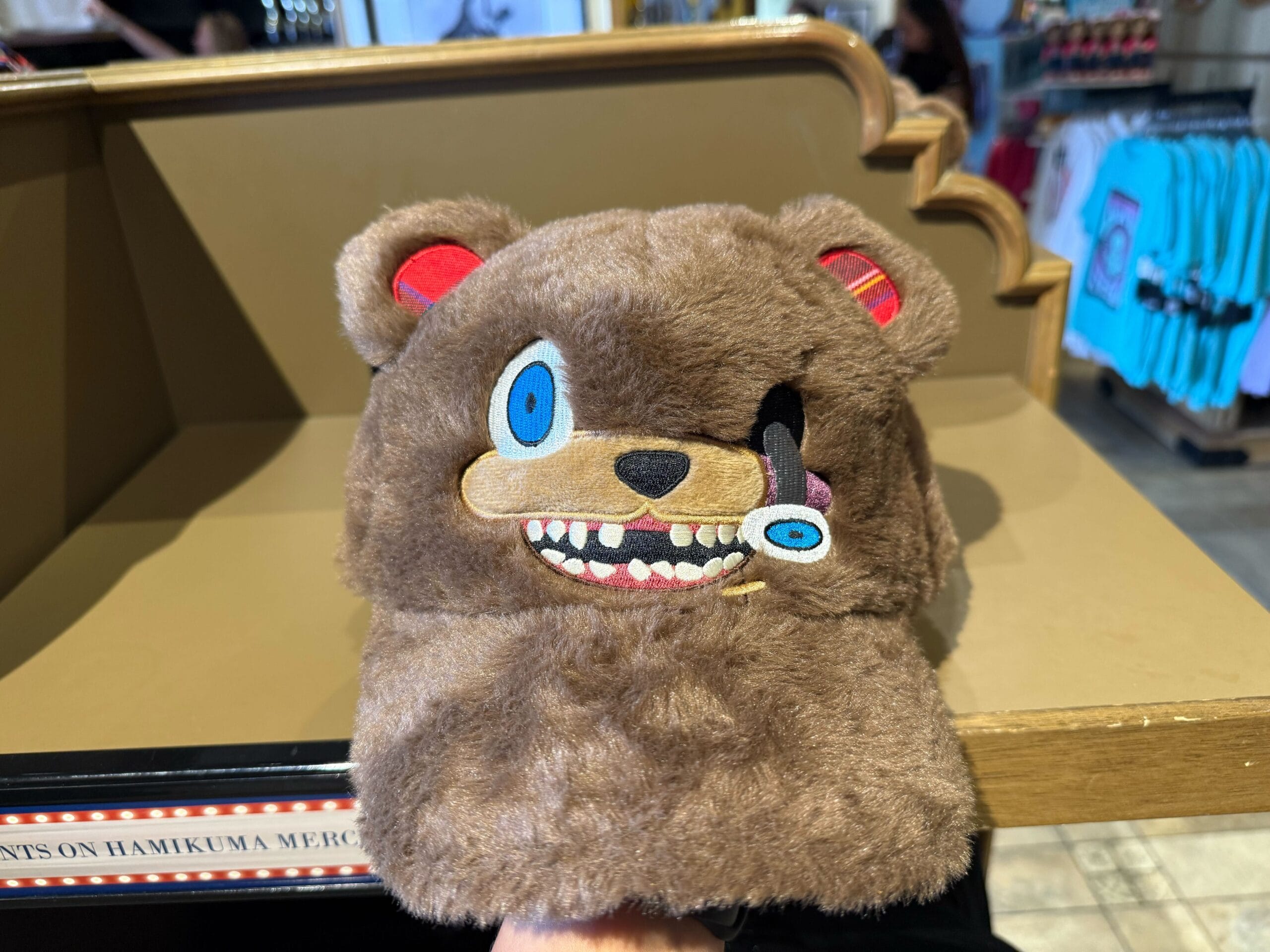 The popcorn bucket is a sculpted plastic figure of HamiKuma complete with his dangling eye, claws, collar, and candy. Guests who purchase the bucket can get free refills for the day.