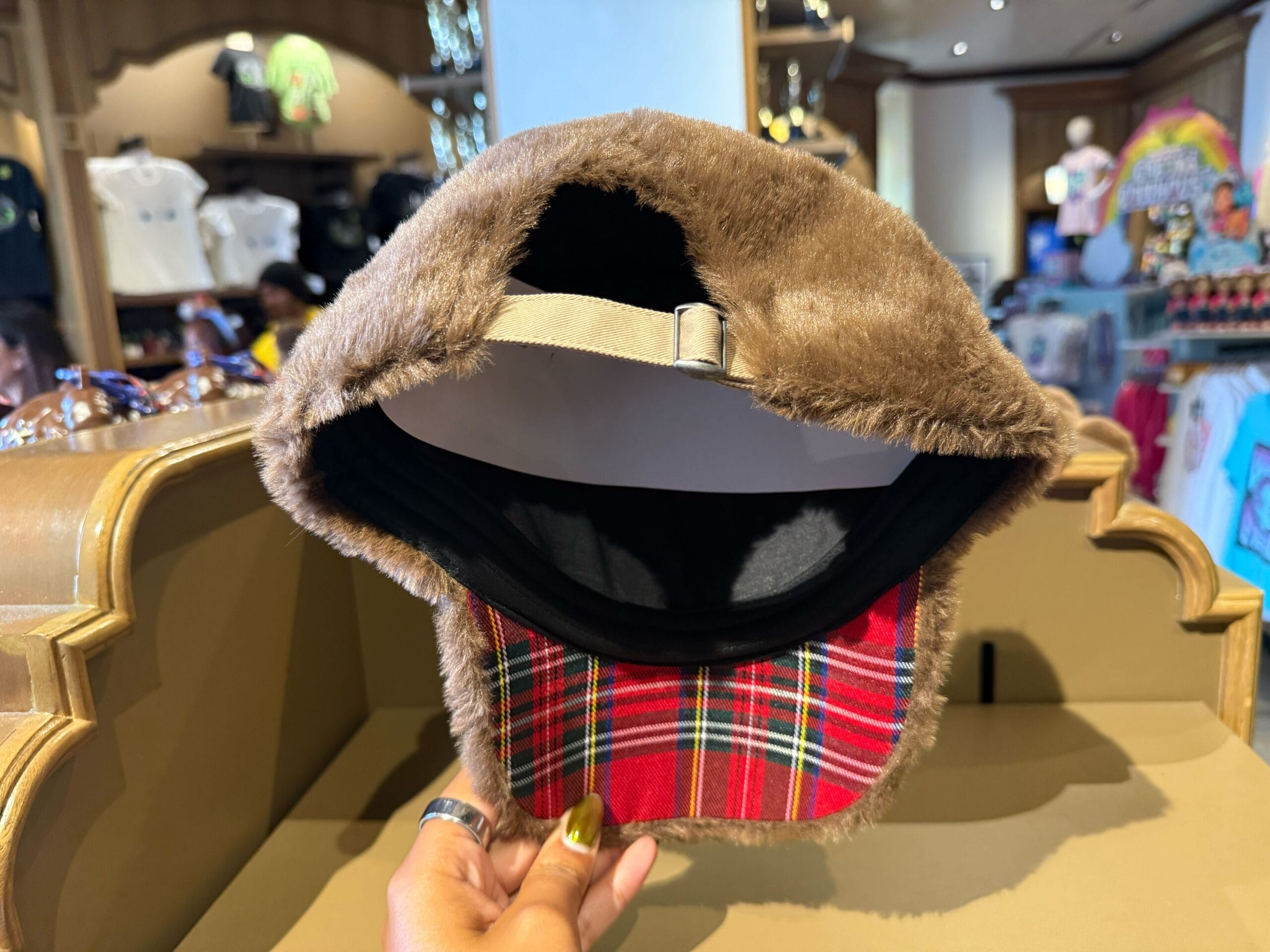 This premium plush has soft brown fur and felt claws. His eyes are three-dimensional, including the left eye popping out of its socket. Around his neck is a plaid collar and blue ribbon.