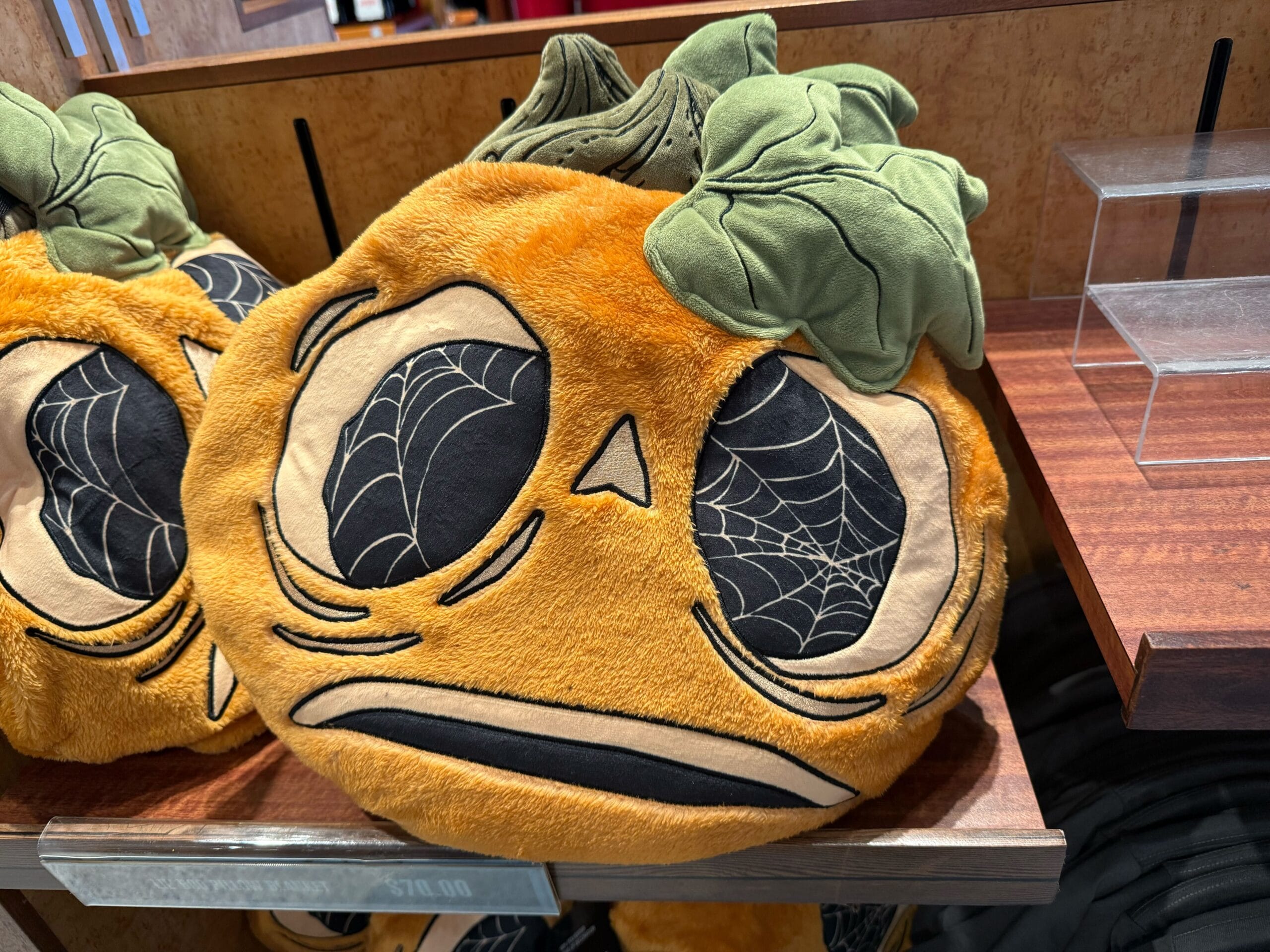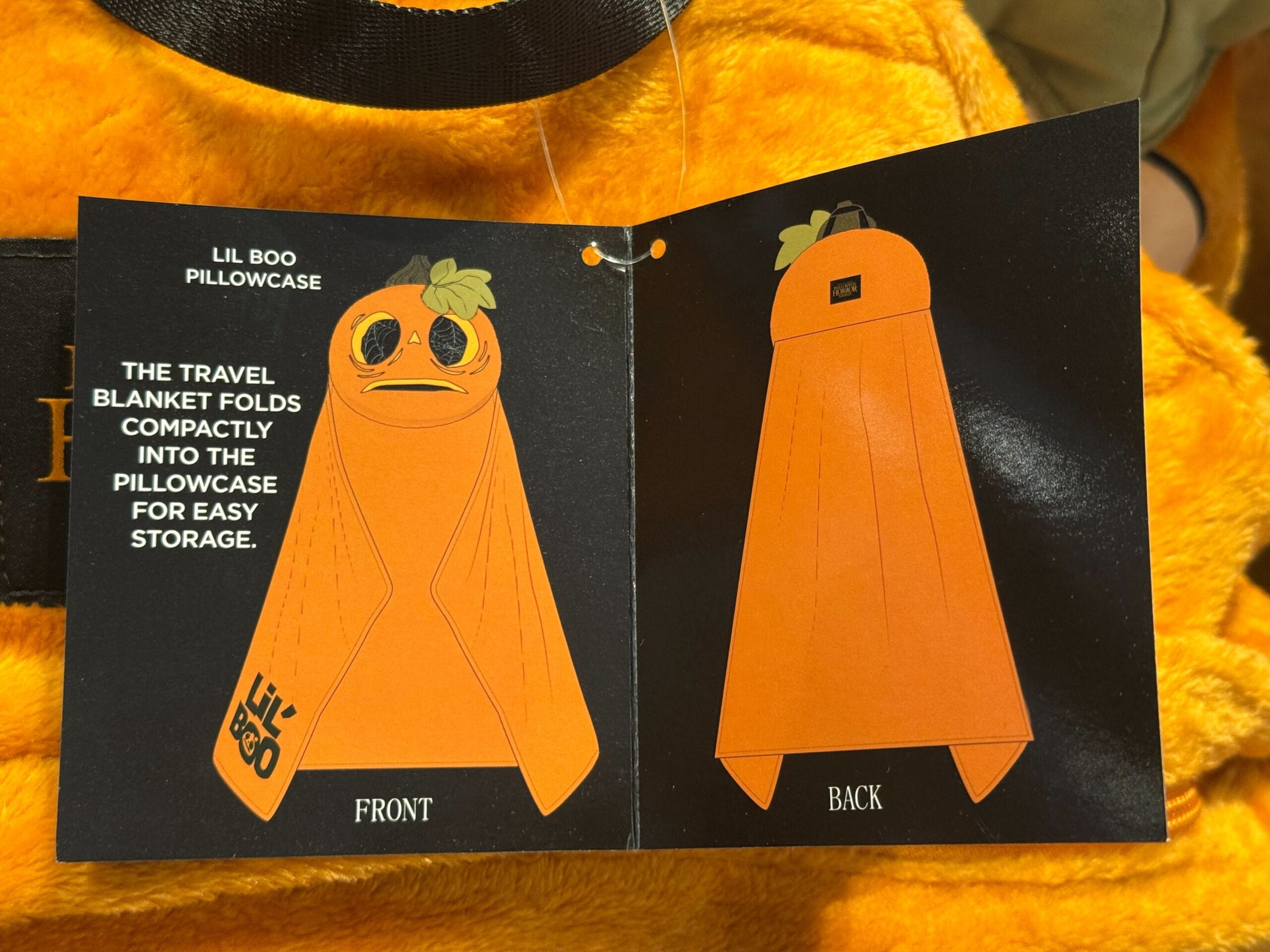 This backpack is made of soft orange fabric with embroidered appliqué facial features. A plush green stem and leaf are attached on top. There are black straps featuring green vine images. A “Lil’ Boo” logo patch is stuck on the back. The interior lining is black with a gray pattern of Lil’ Boo among spiderwebs.