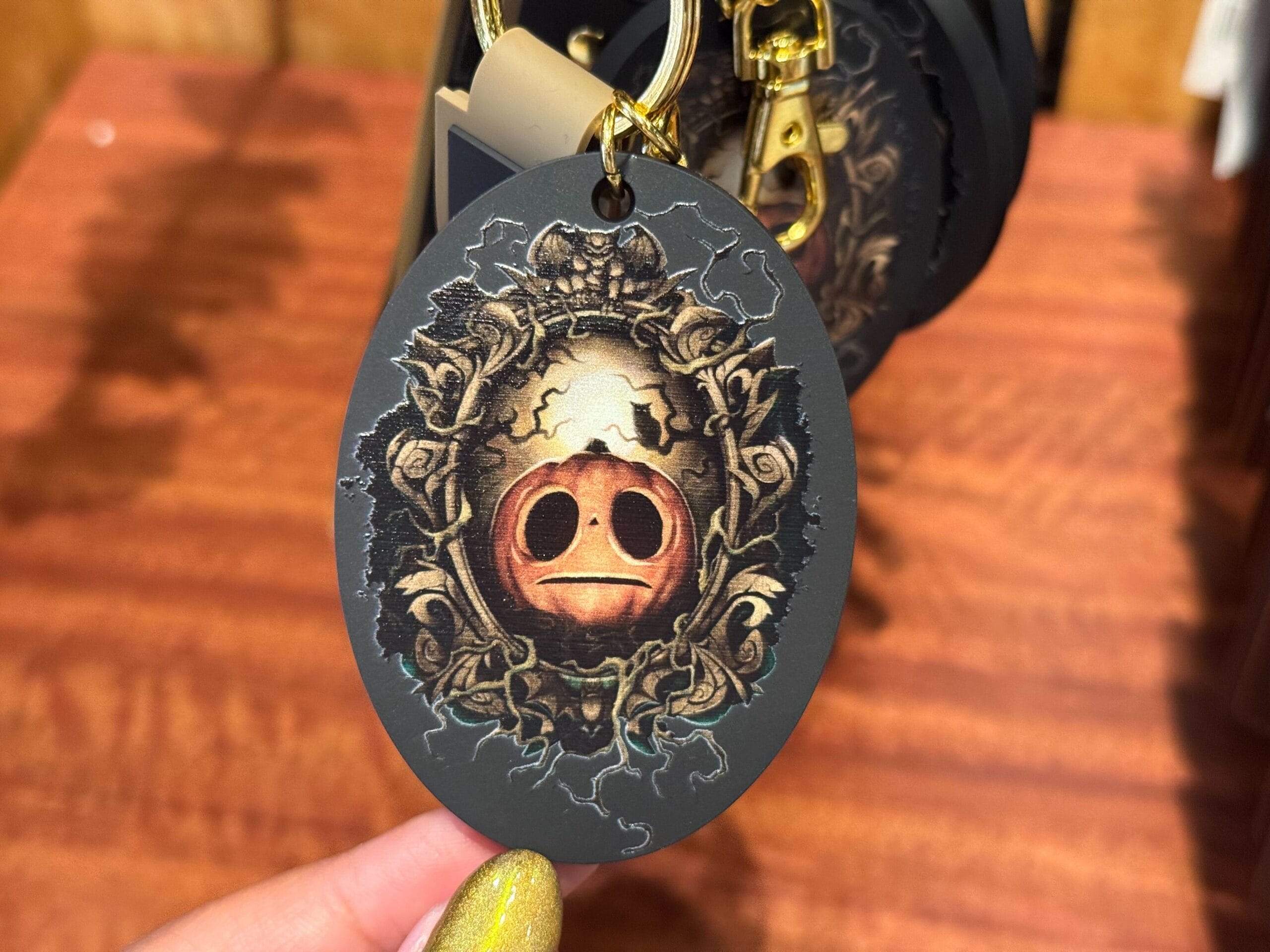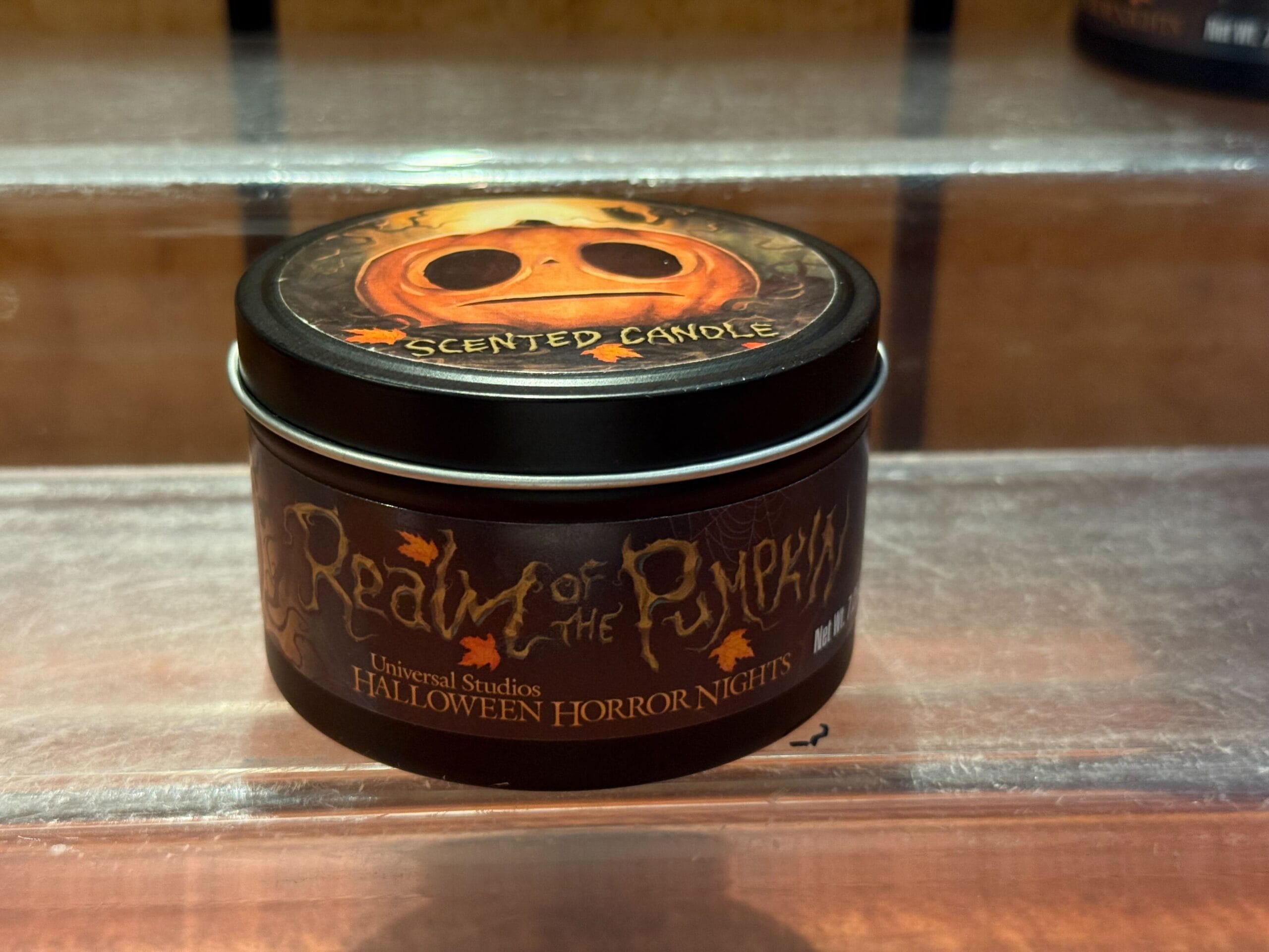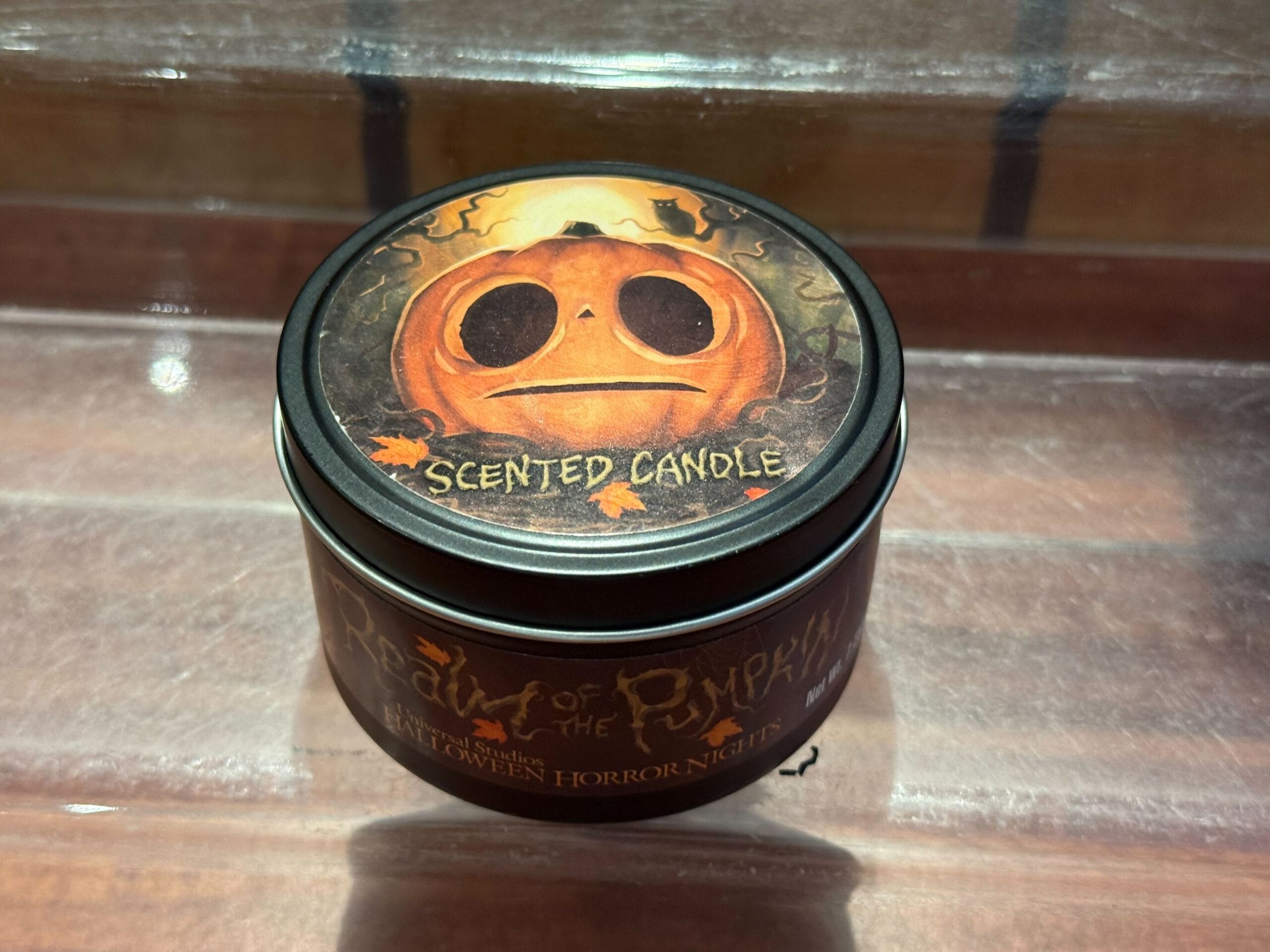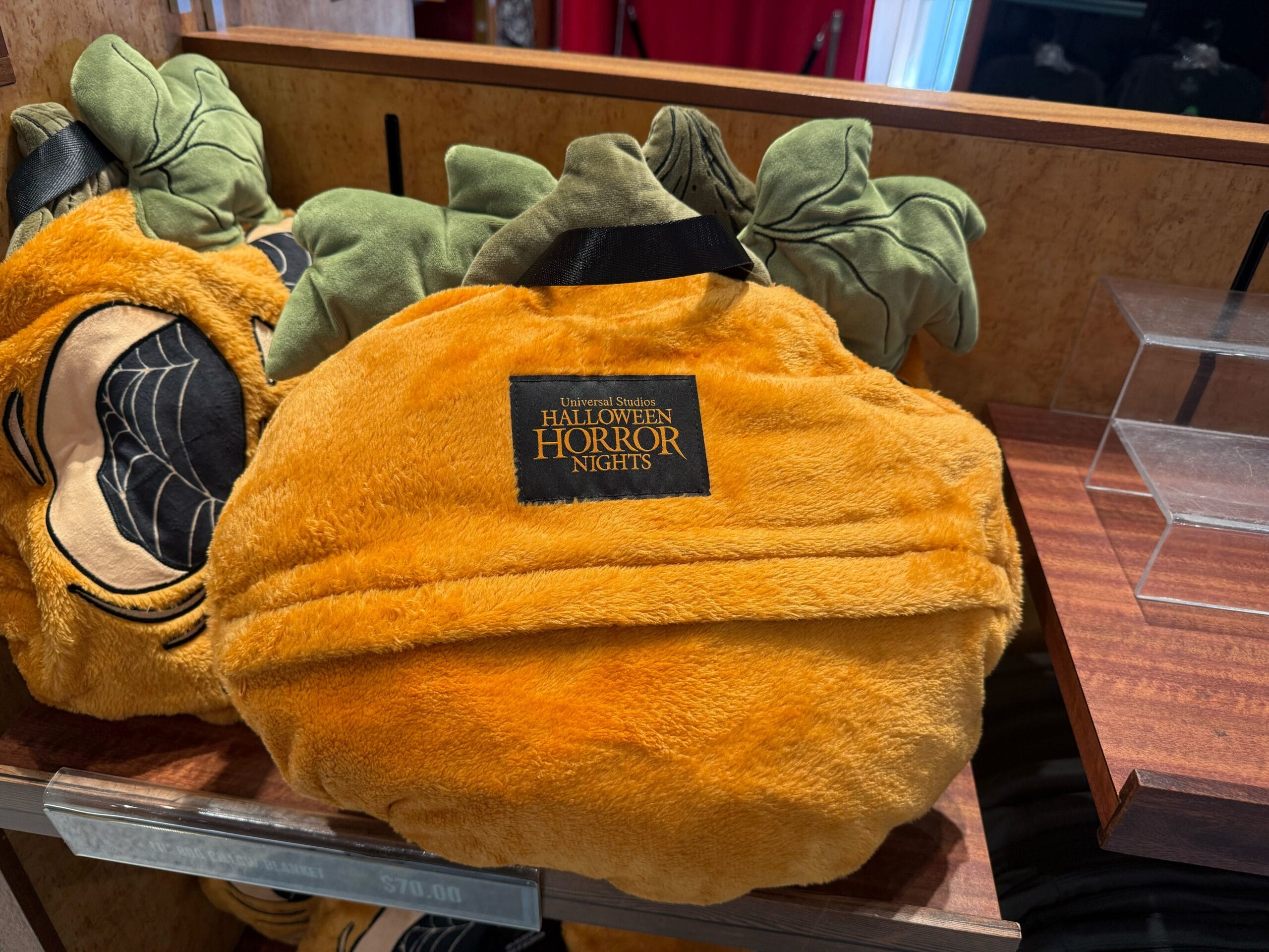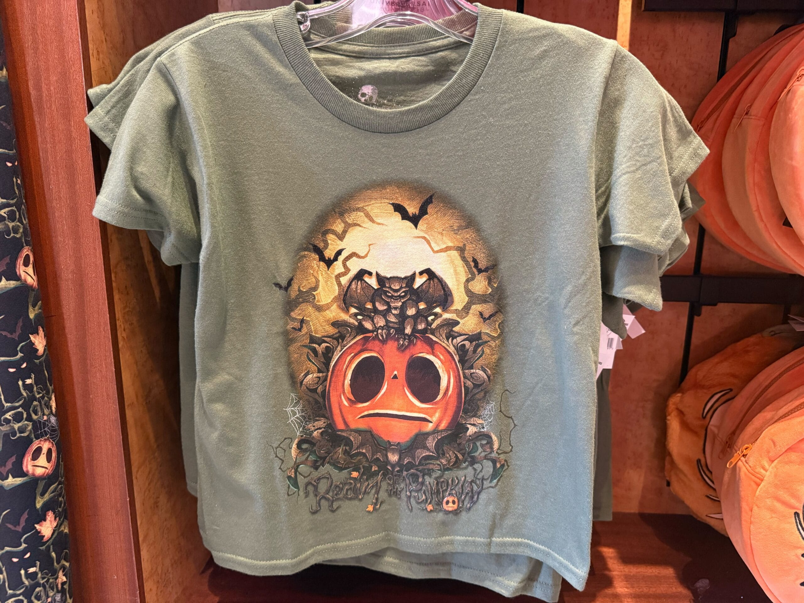 Though Lil’ Boo has his origins at Universal Orlando Resort, his merchandise is available at Universal Studios Hollywood. This gray T-shirt features the scared-looking jack-o’-lantern set against a golden sky with crooked tree branches. An owl is perched on one branch. “Realm of the Pumpkin,” a reference to the haunted house that made Lil’ Boo famous, is made out of vines at the bottom of the design. The Halloween Horror Nights logo is printed on the back.