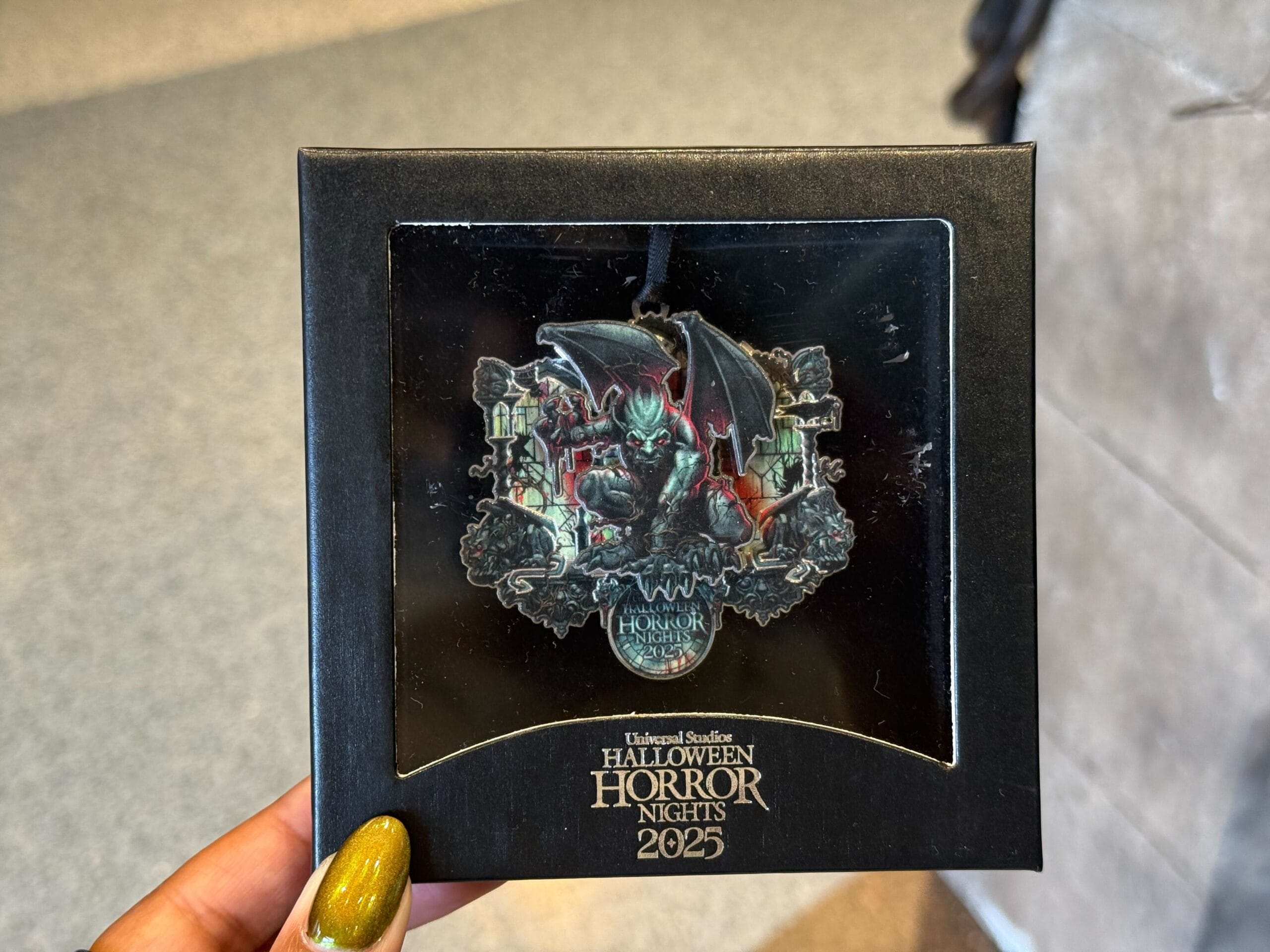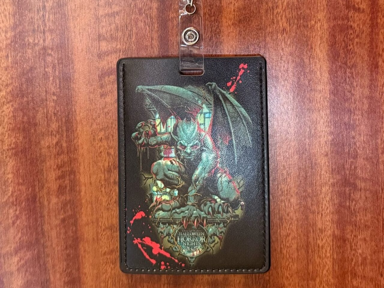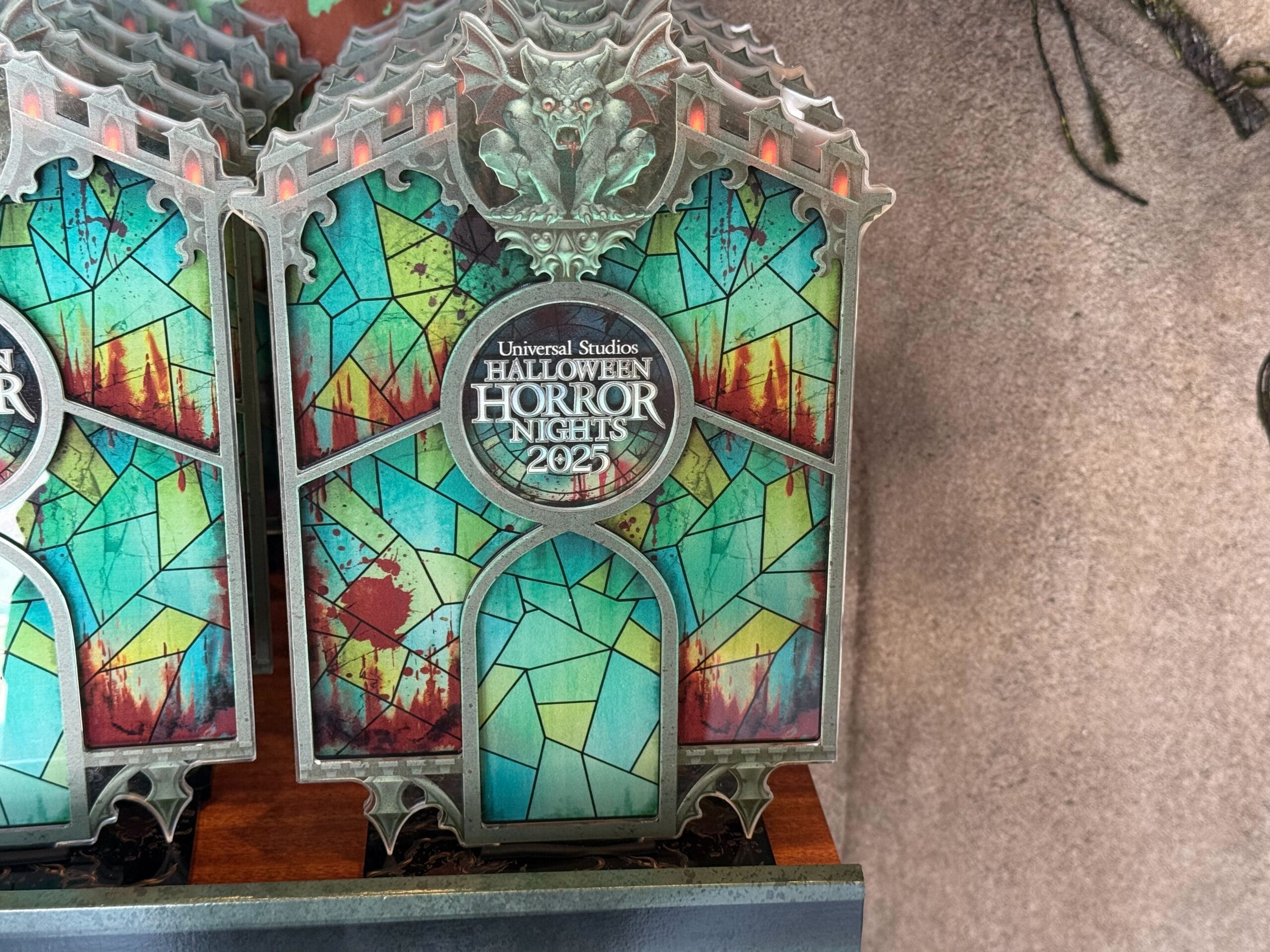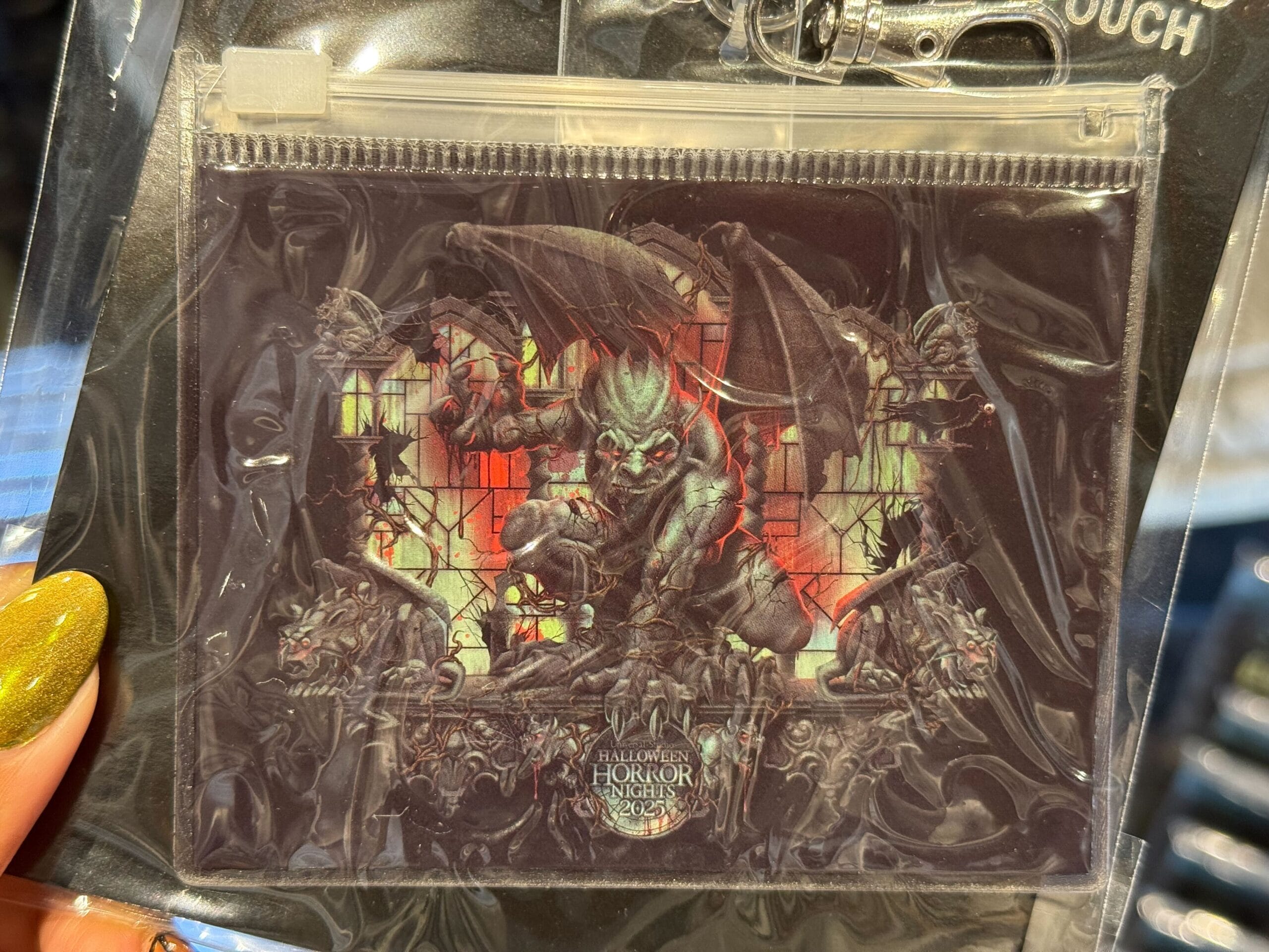 There are gargoyles on top and in the corners of the art. “Universal Studios Hollywood” is written across the bottom. There’s also a crow with an eyeball.