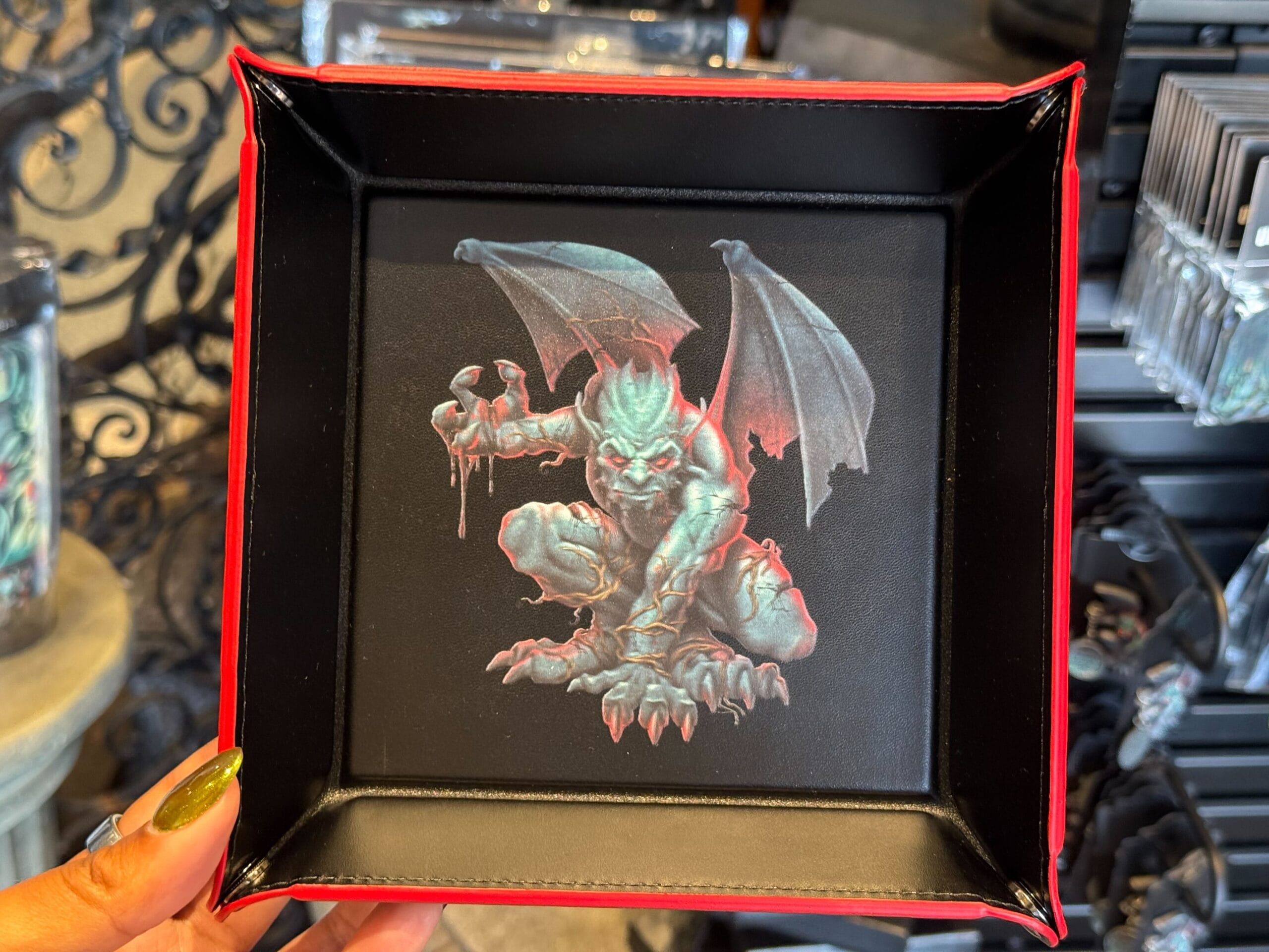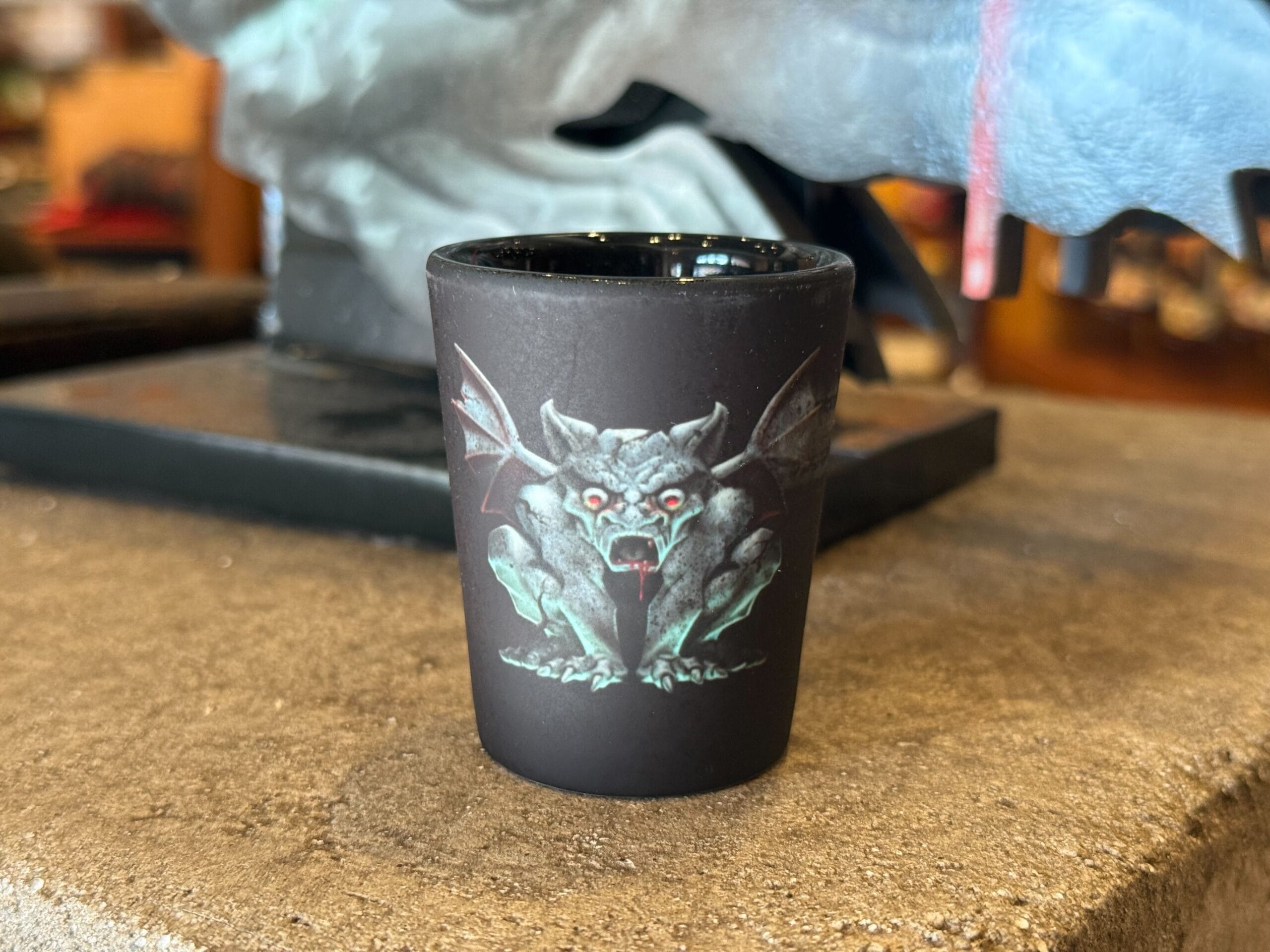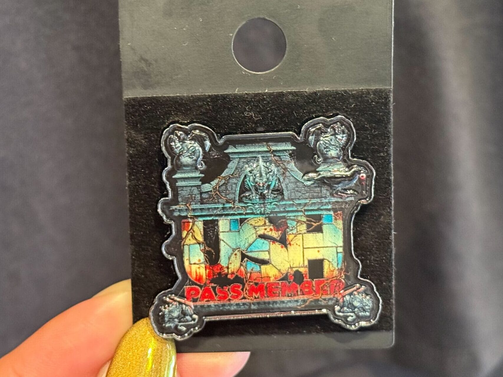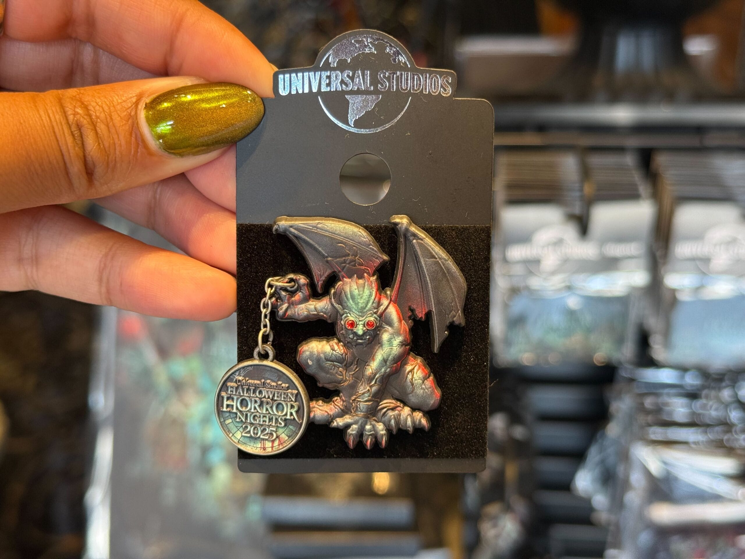 There are gargoyles on top and in the corners of the art. “Universal Studios Hollywood” is written across the bottom. There’s also a crow with an eyeball.