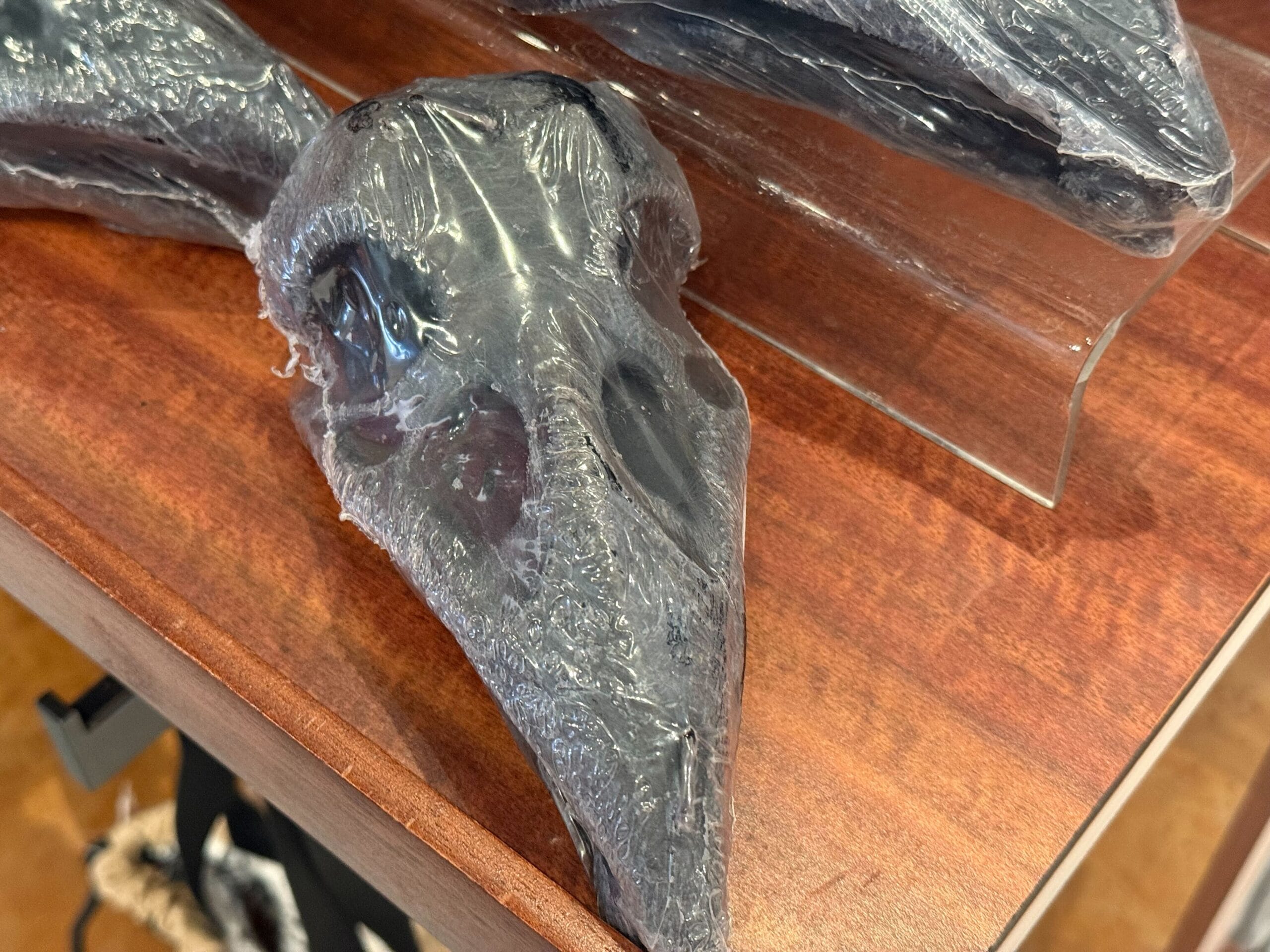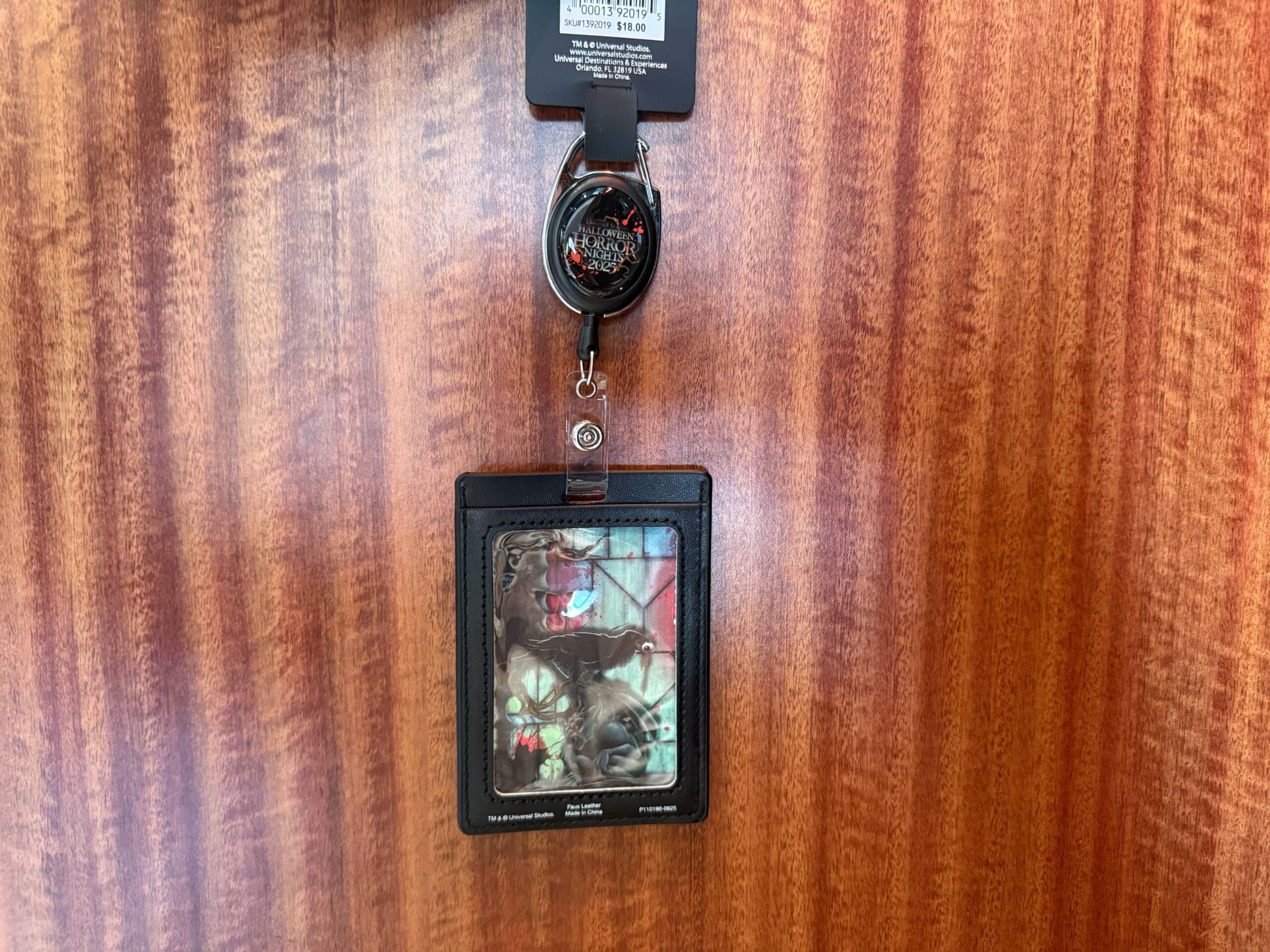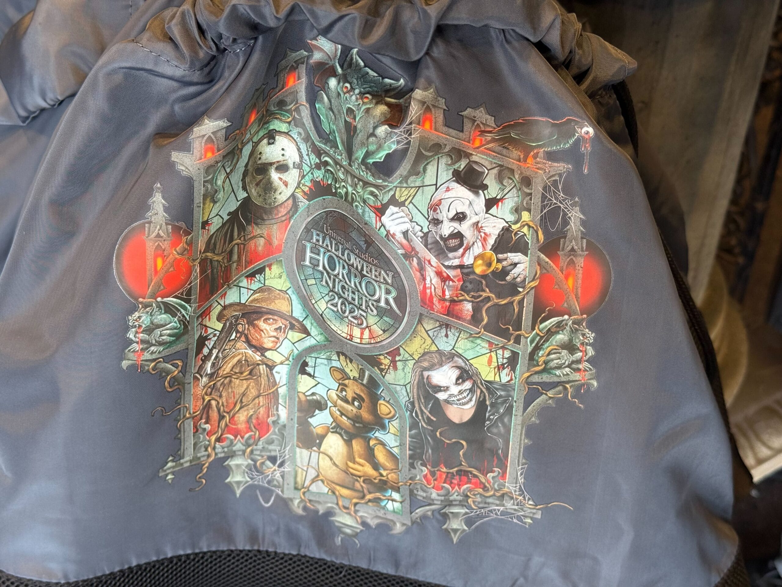 On the back is large printed artwork of the crow and eyeball in front of a red window. The Halloween Horror Nights 2025 logo is included at the top. It’s set against a cloudy background.