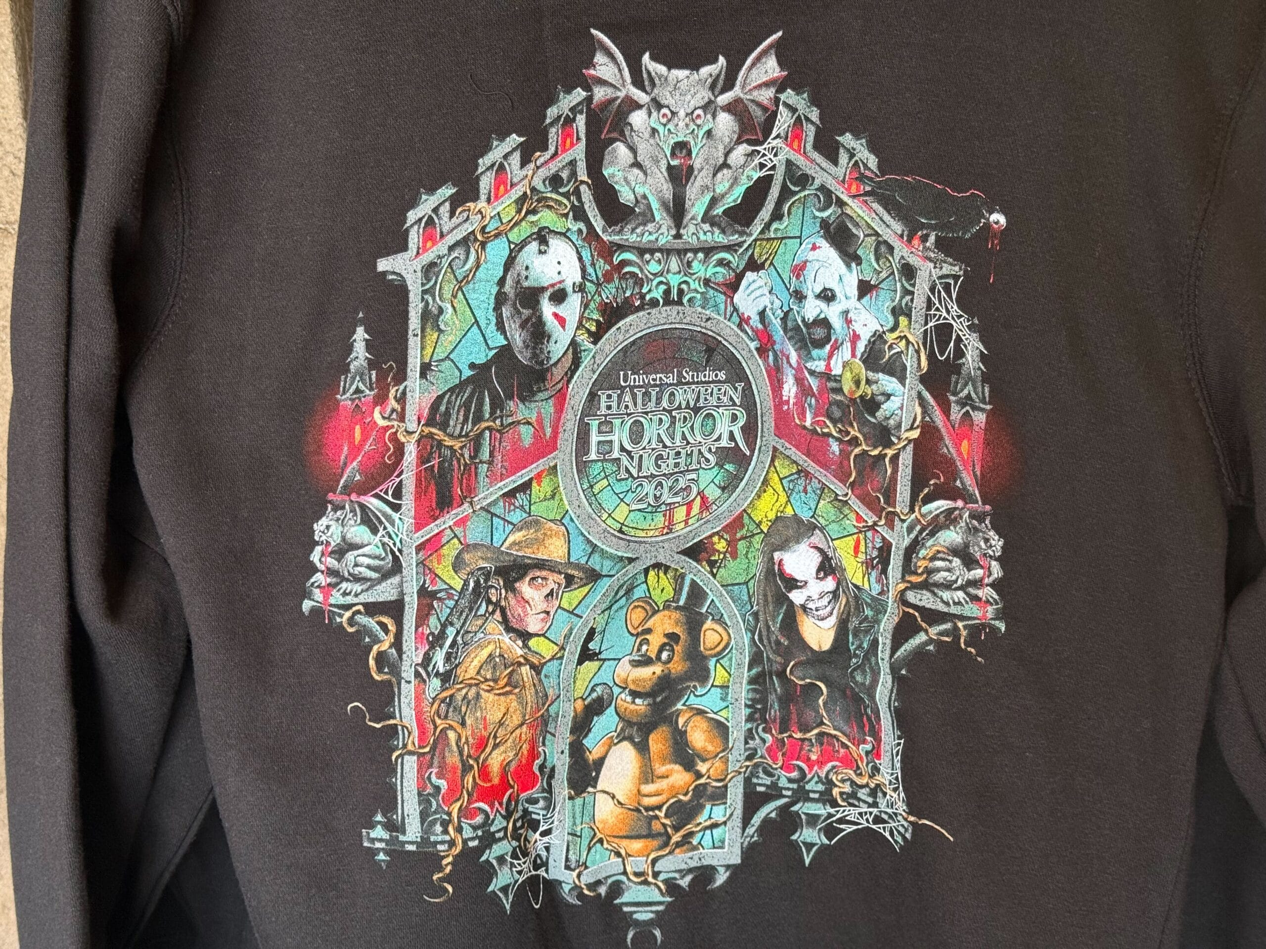 This black T-shirt has key art representing Halloween Horror Nights 2025. The logo is included in the center of a stained glass design. In each window is a character from one of the IP houses: Jason, Art the Clown, The Ghoul, Freddy Fazbear, and The Fiend. A gargoyle and crow are perched on top of the windows.