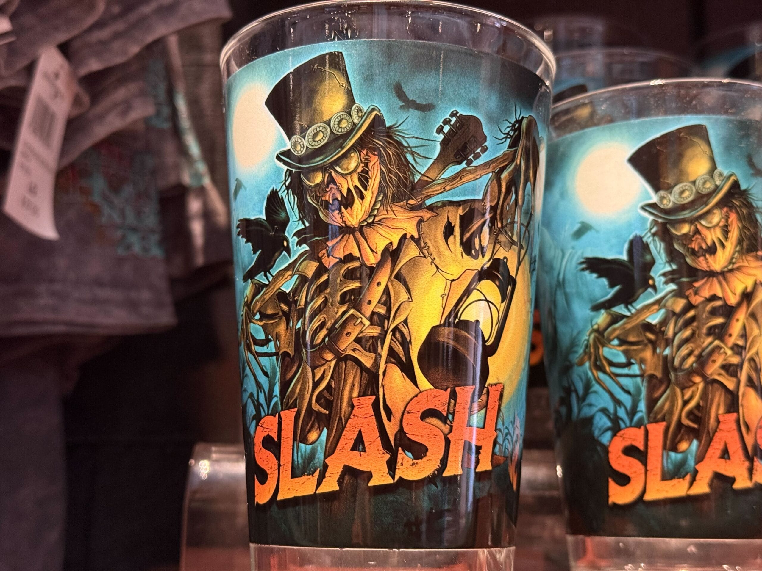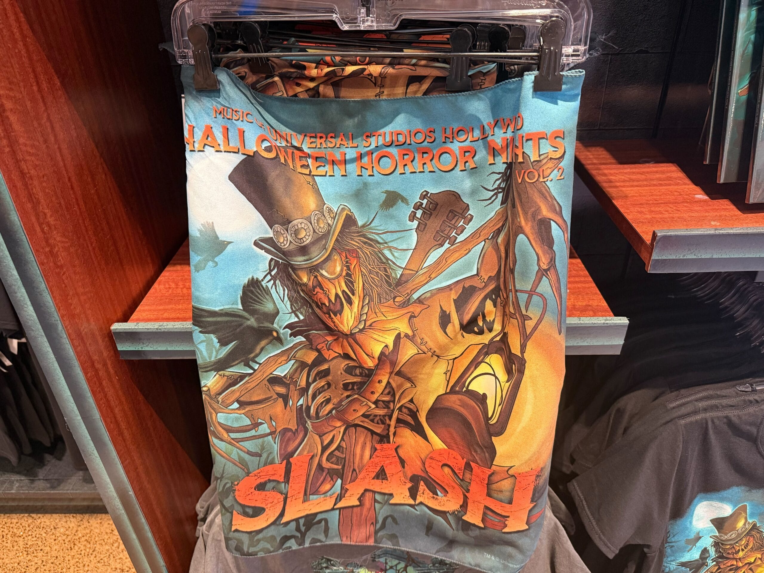 This black shirt features artwork of a Slash-inspired skeleton scarecrow wearing a top hat and guitar on his back. He’s holding a glowing lantern and crows fly around. “Slash” is written across the bottom. Slash provides music for the Scarecrow house.