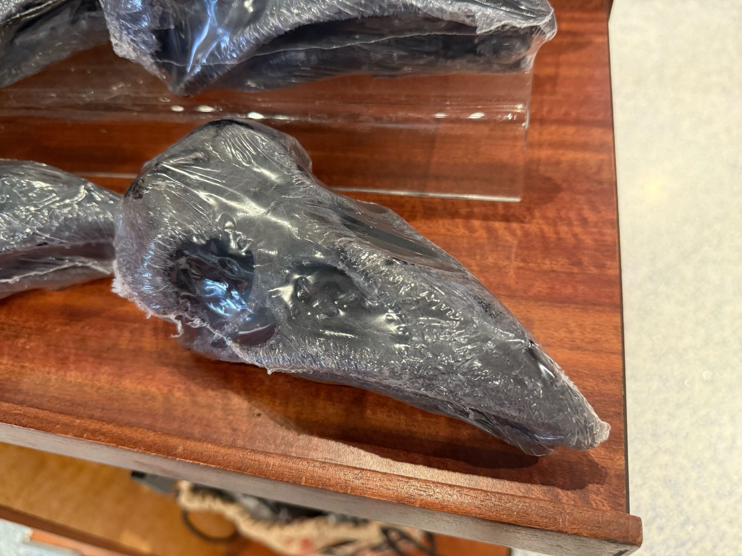 Another string of beads is on his back. He has 3D stitches on his face and arm.