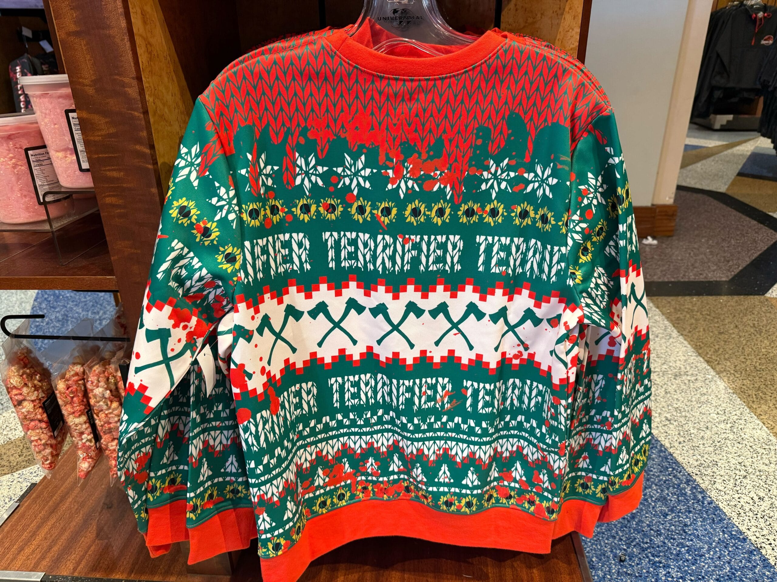This is a black hockey jersey with red and white stripes. Jason’s mask is printed on the front with blood splatter around it. The HHN logo is seen on the right sleeve. Bloody crossed blades are pictured on the other sleeve. The JASON UN1V3RSE logo is written on the back, mostly in white with the numbers in red.