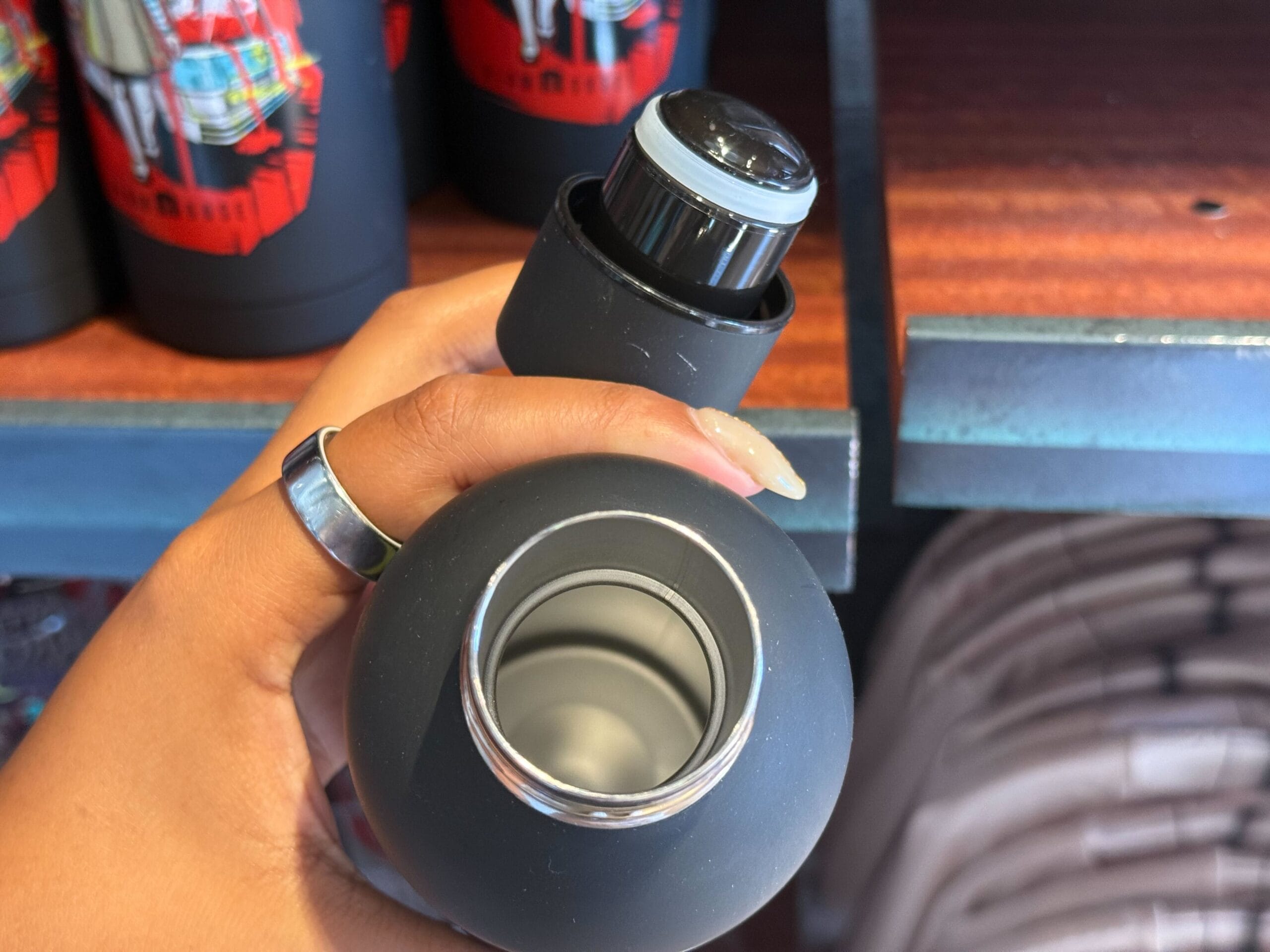 The IP house artwork is featured on one side of this black bottle. The other side has the HHN logo among vines. It’s stainless steel and holds 32 oz.