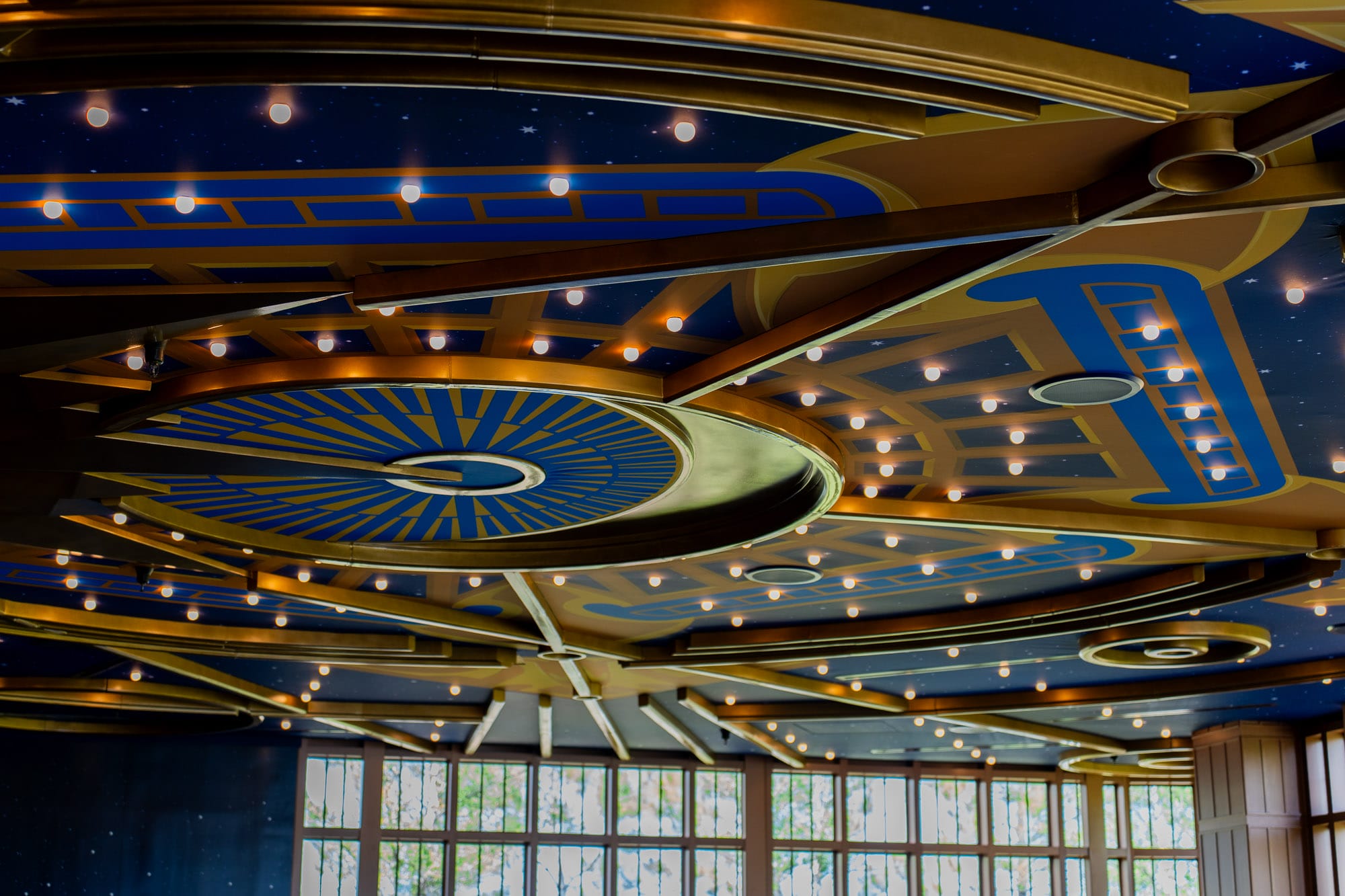 Above this area is a gorgeous decorated ceiling with gold detailing over a deep blue background.