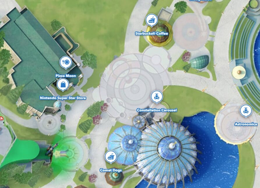 Pizza Moon is located in Celestial Park, to the right of the Nintendo Super Star Store and across from Comet Dogs and Constellation Carousel.