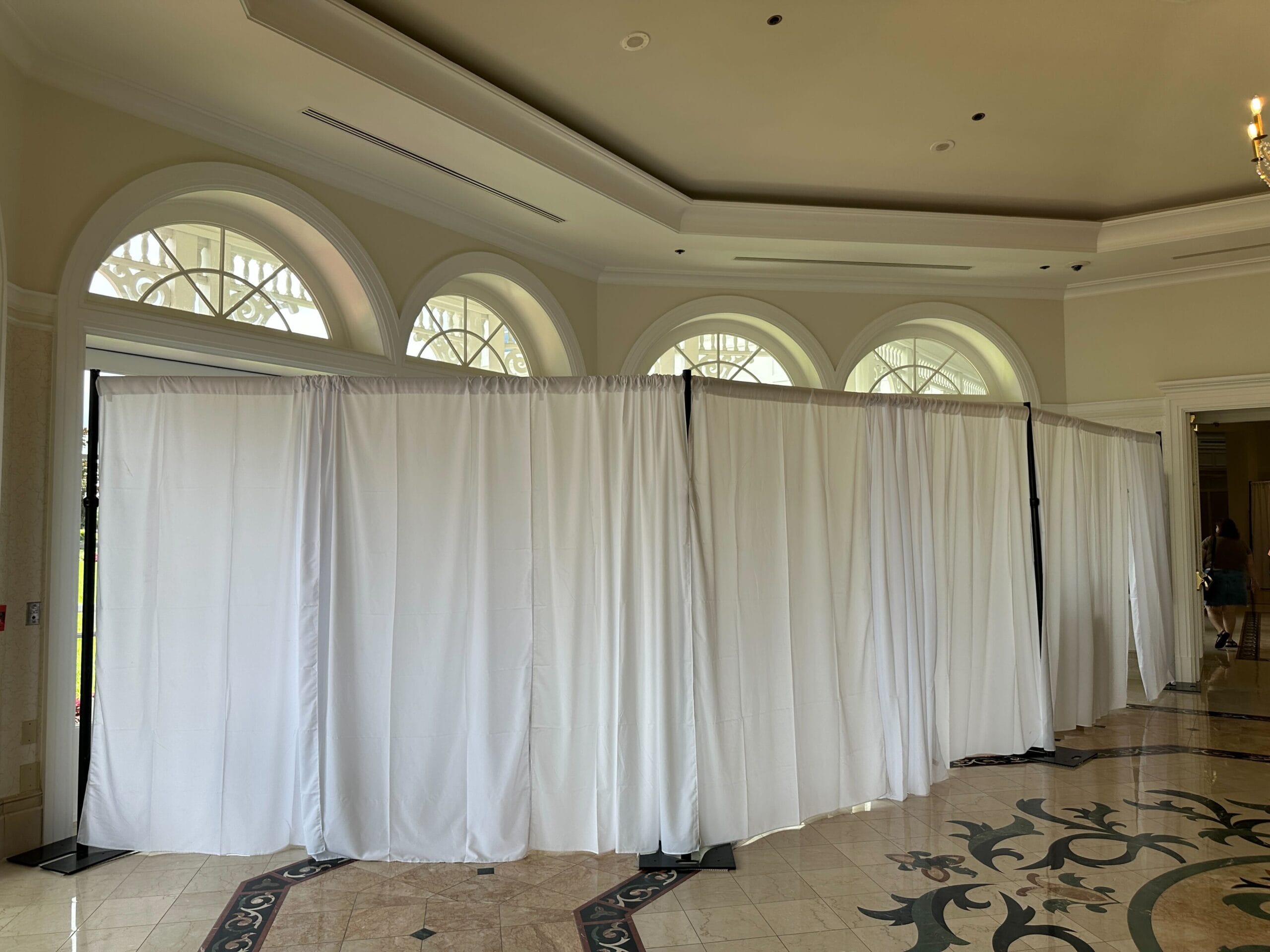 The Disney Vacation Club desk near the entrance to Grand Floridian Cafe has been temporarily moved into the lobby near Sandy Cove Gifts and Sundries. The usual location is currently blocked by white curtains, indicating crews are likely doing work on the windows or walls.