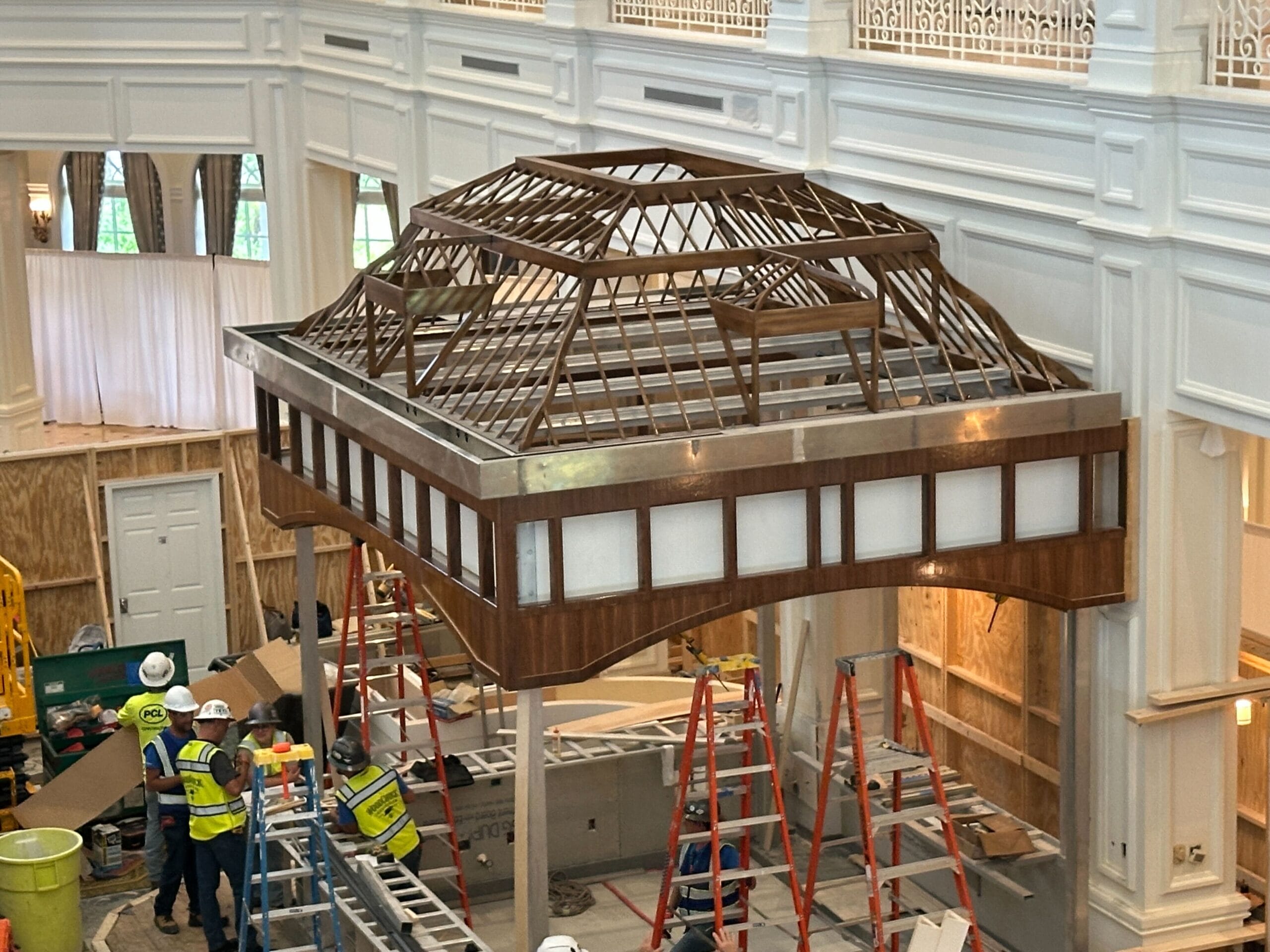 The semi-circle where a decorative seashell element used to hang above the Garden View Tea room has been further sanded down and smoothed. A brand-new element featuring the GF logo will be installed before the lobby remodel is complete.