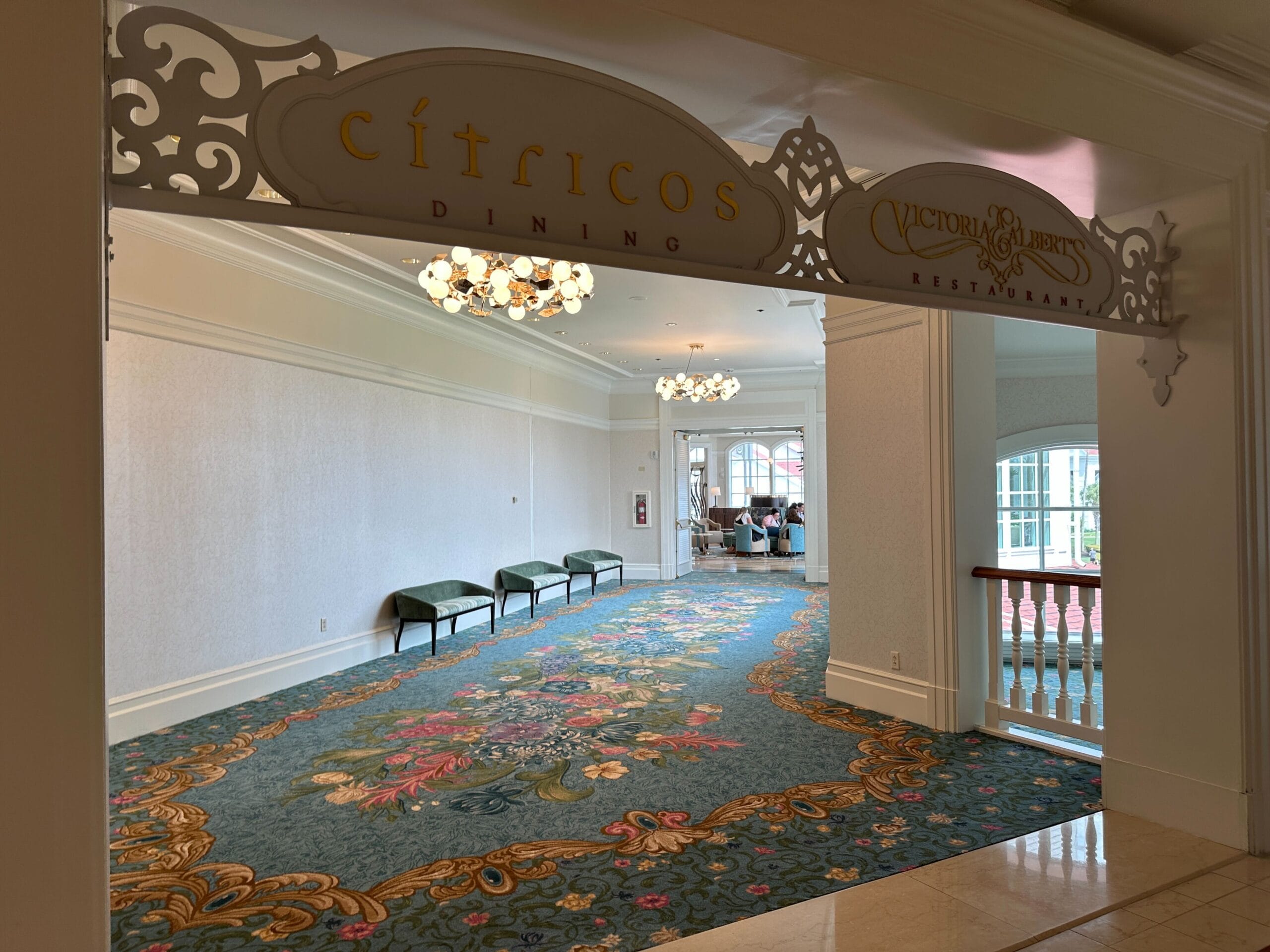 Curtains were also down from the hallway leading to Cítricos and Victoria & Albert’s. Curtains have been on and off blocking the hallway during the day while the restaurants opened at night. The new carpeting is just like that on the staircase landings while the new wallaper has a more subtle vine-like pattern.