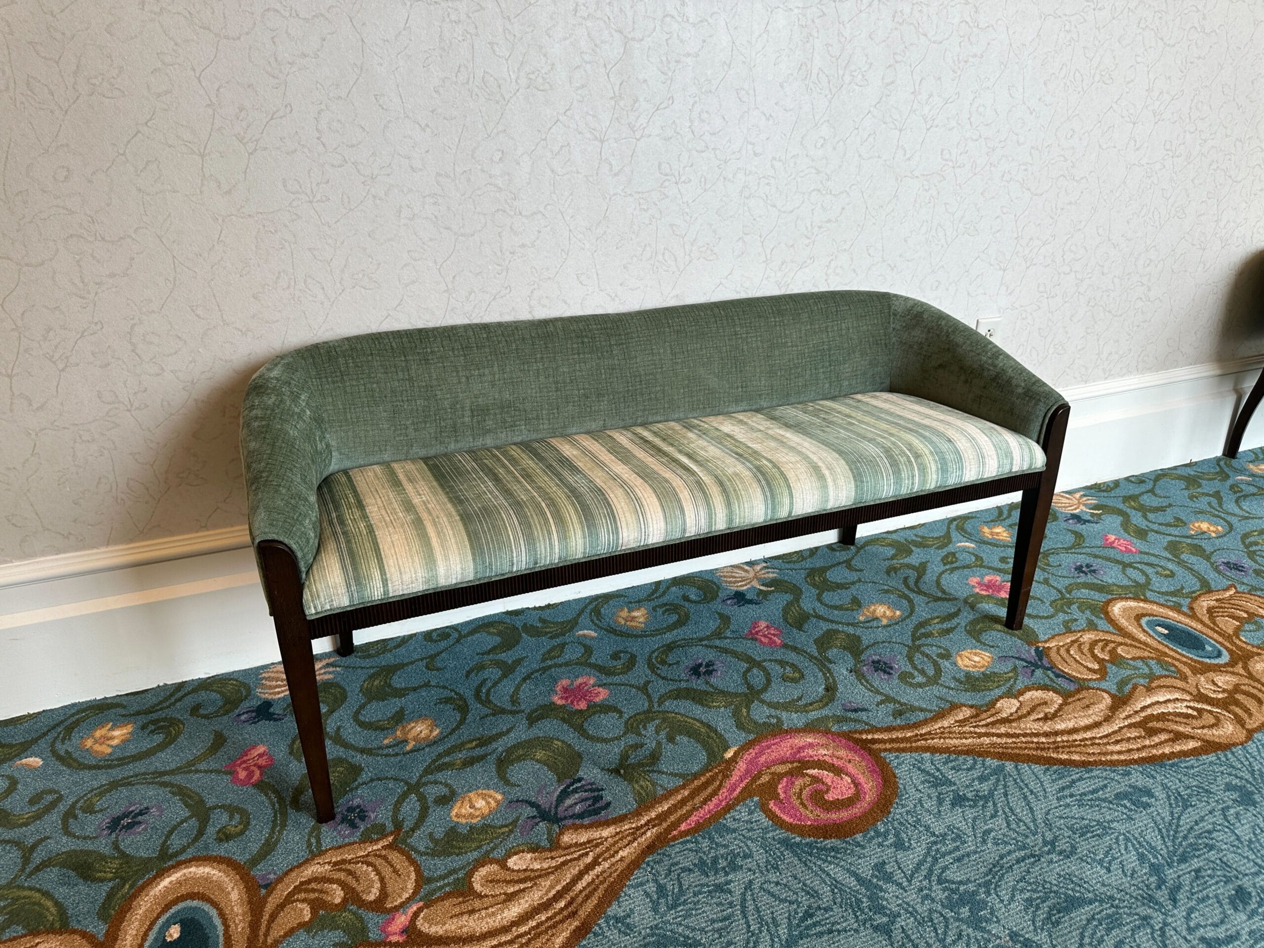 Above is what the space used to look like. The wallpaper had a beige striped pattern, which is being replaced all throughout the lobby. The carpeting was green, blue, and pink with gold filigree. There were also maps on the walls, which are currently missing, but that may be temporary. The ceiling fan has been replaced by two golden chandeliers.
