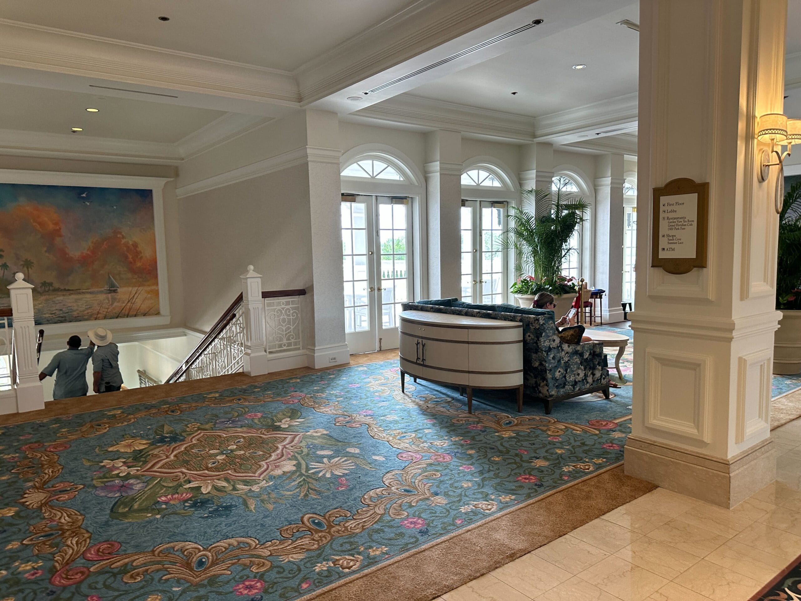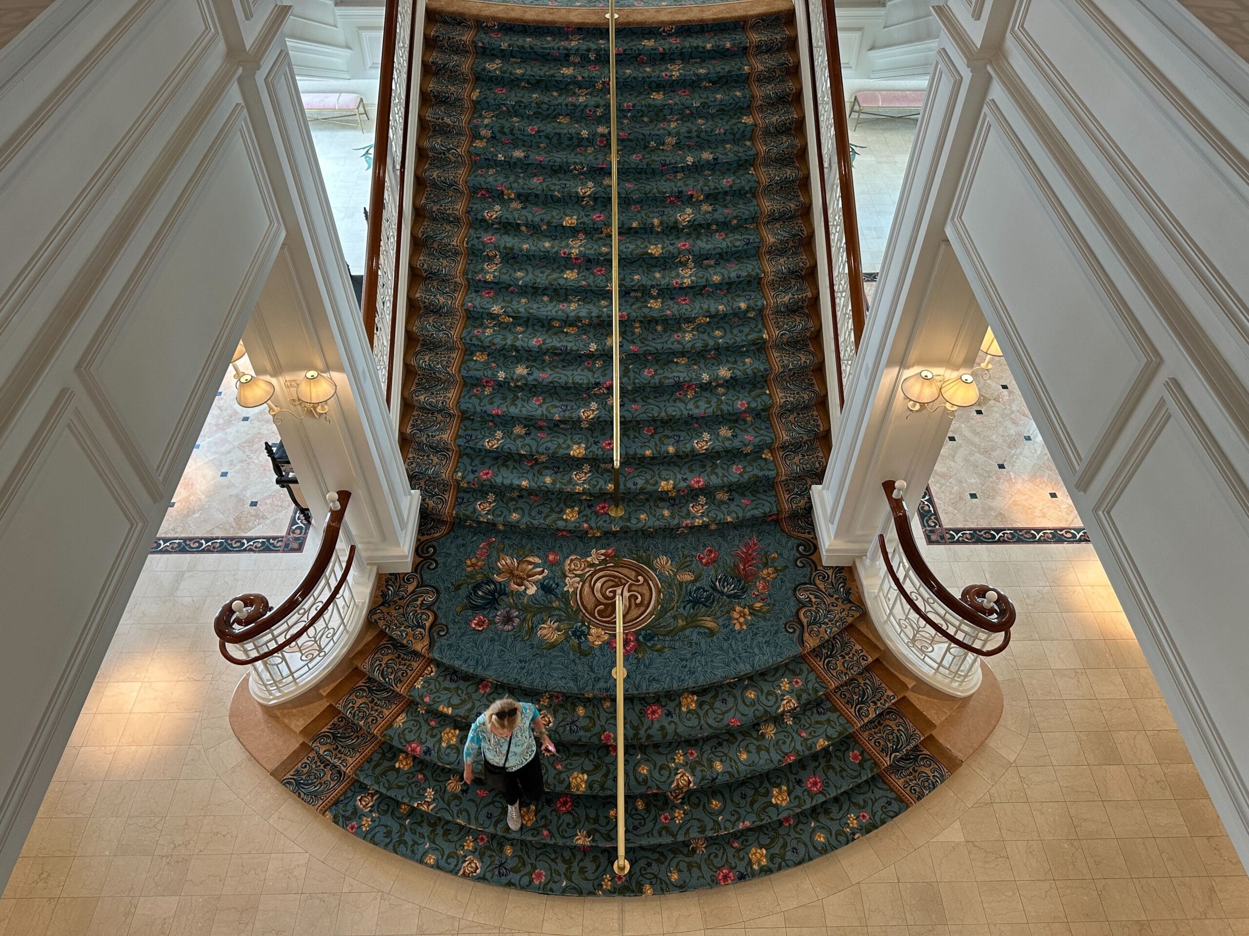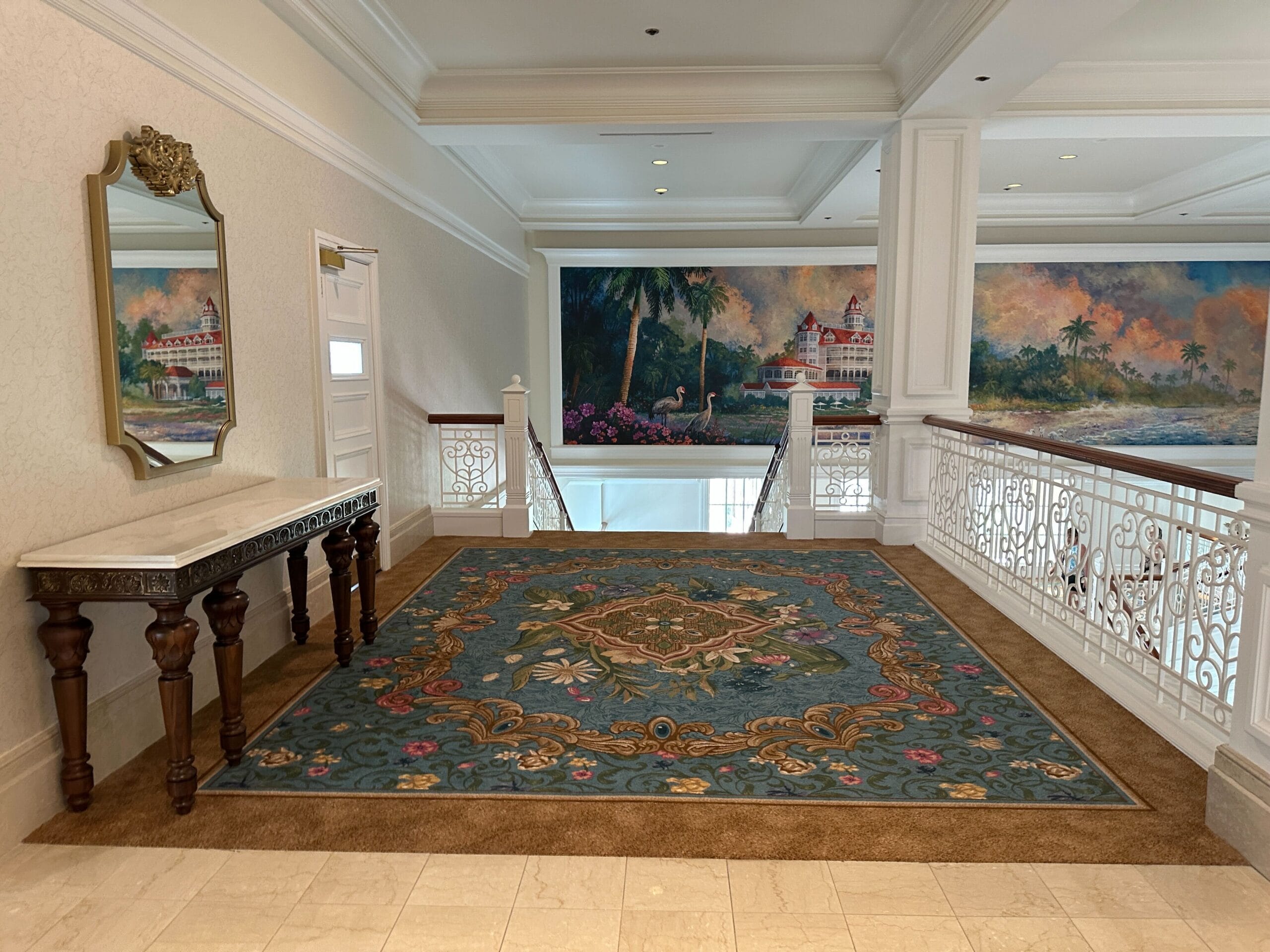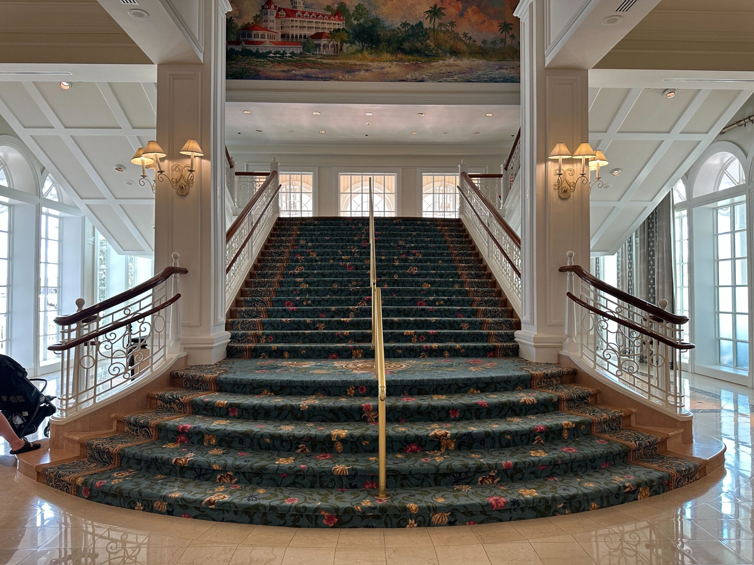 The grand staircase in the lobby of Disney’s Grand Floridian Resort has reopened after six weeks, fully revealing a new carpet and mural.