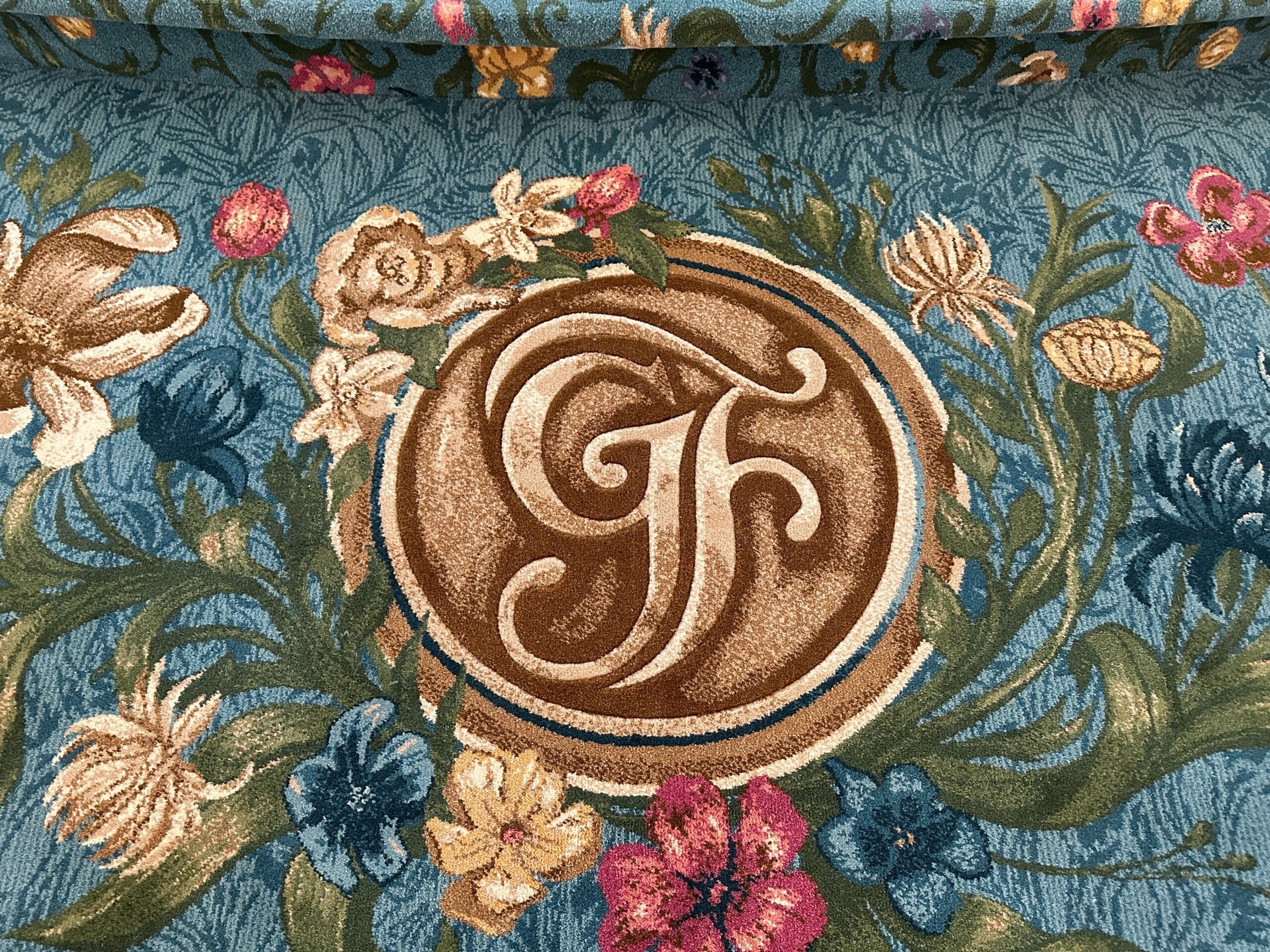 The new carpet is a teal blue color with a floral pattern of mostly pink and yellow flowers on green vines. Blue-green filigree is on beige stripes down the sides of the staircase. For comparison, below is the old carpet.