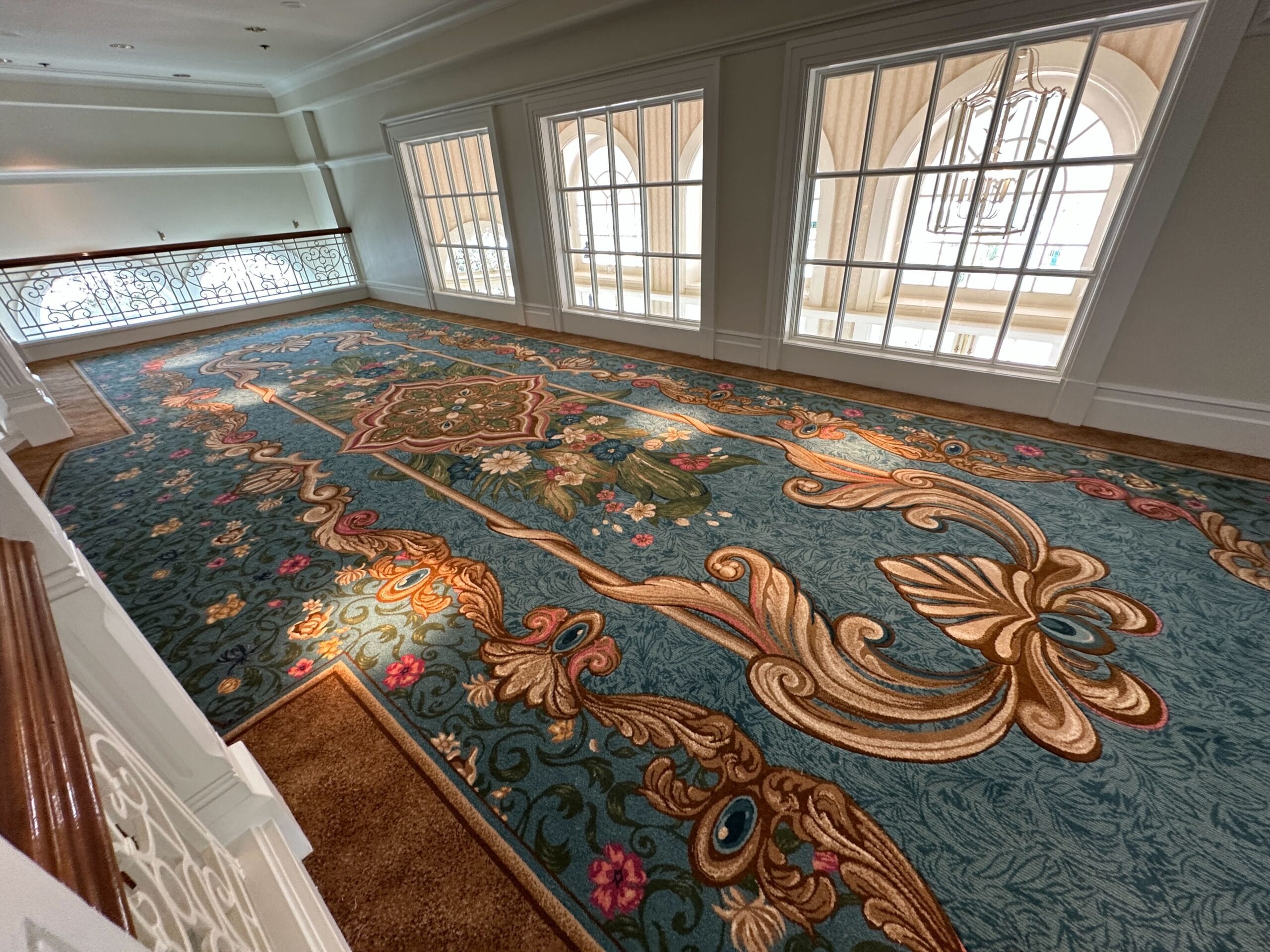 On the landings are matching carpets with larger designs. On the second floor, this carpet extends into the refurbished seating and PhotoPass area.
