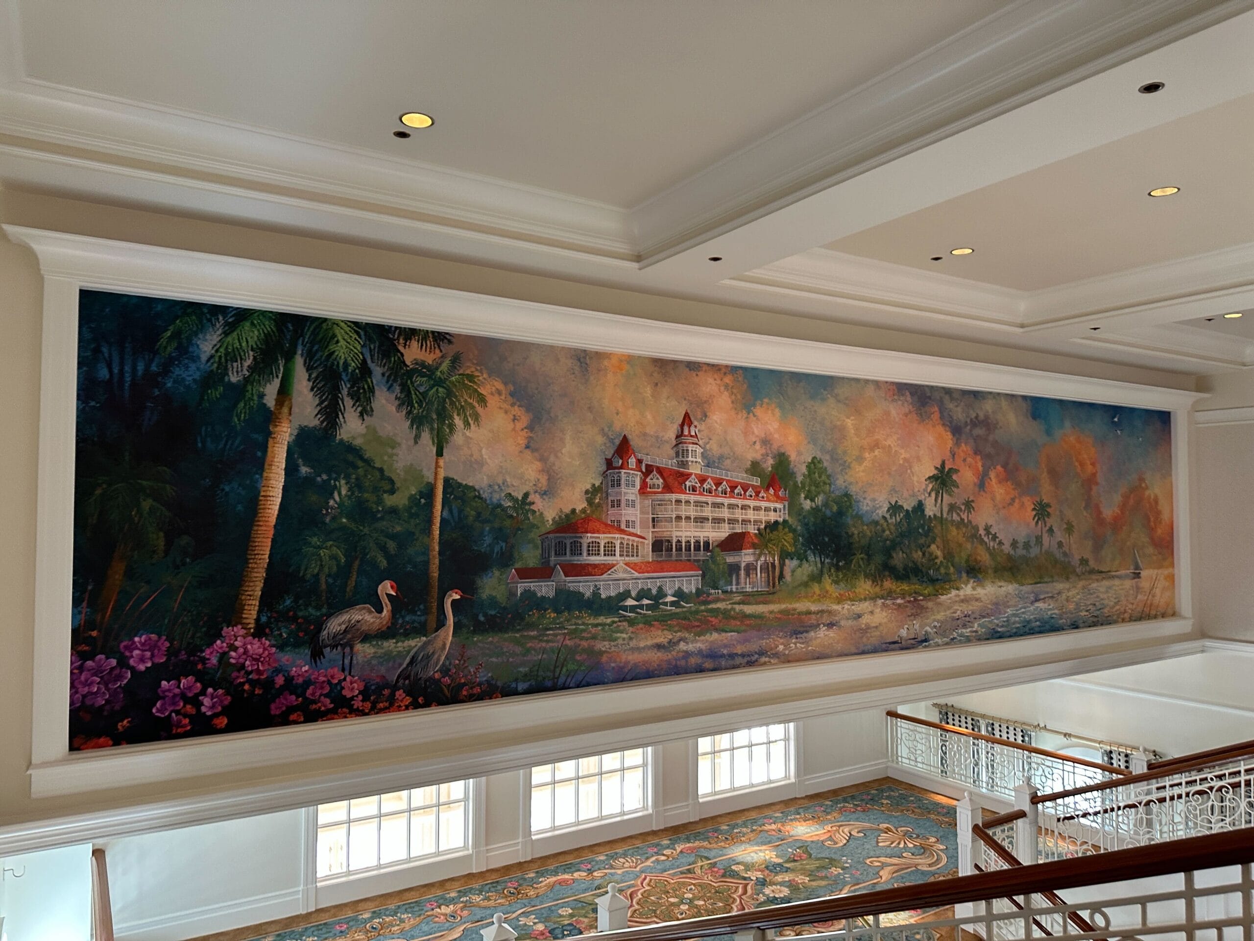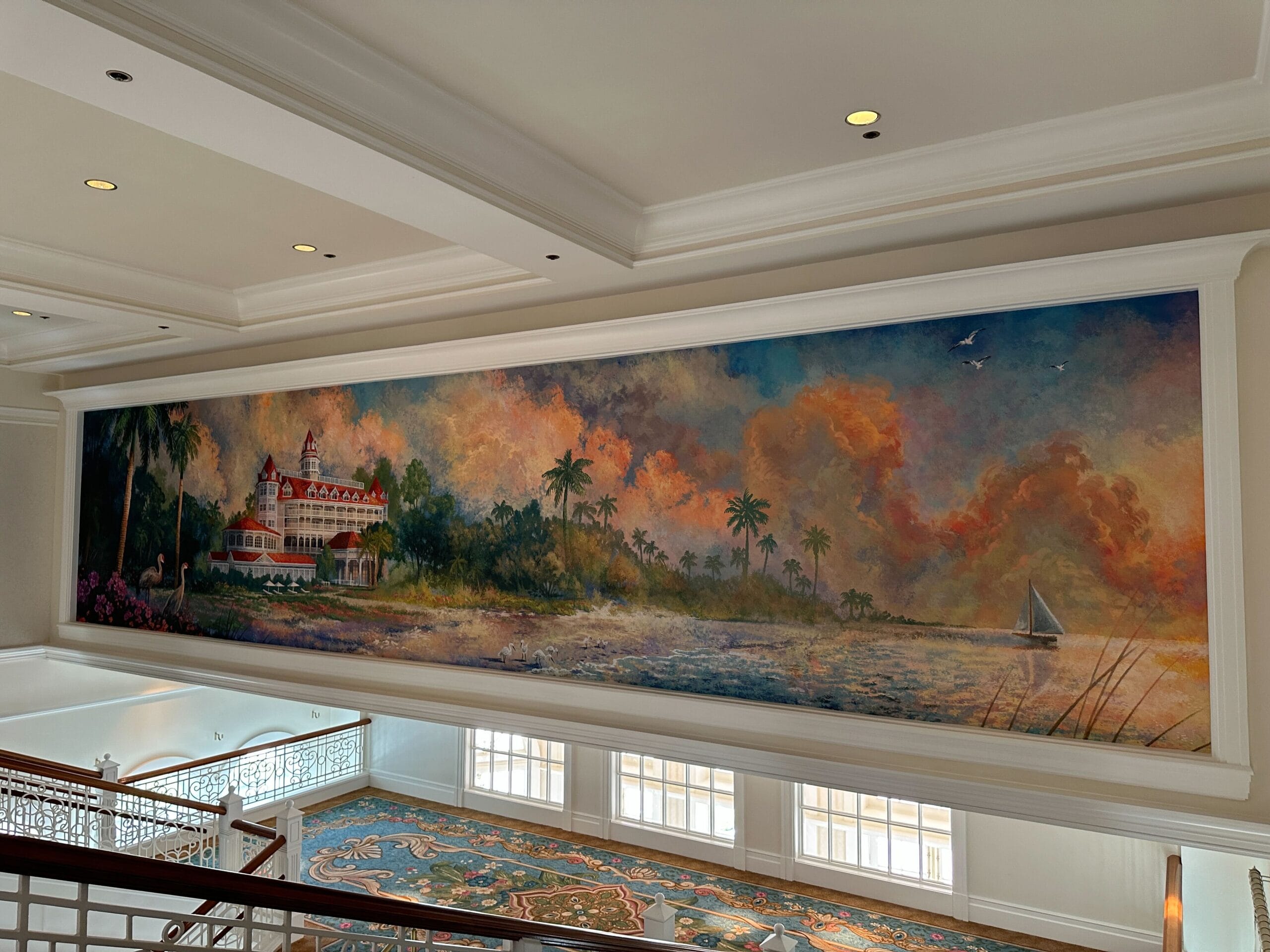 On the wall above the staircase is a mural depicting the Grand Floridian. We first glimpsed this two weeks ago. The resort is pictured on the edge of the lagoon with several sea birds around. A sailboat is in the water.