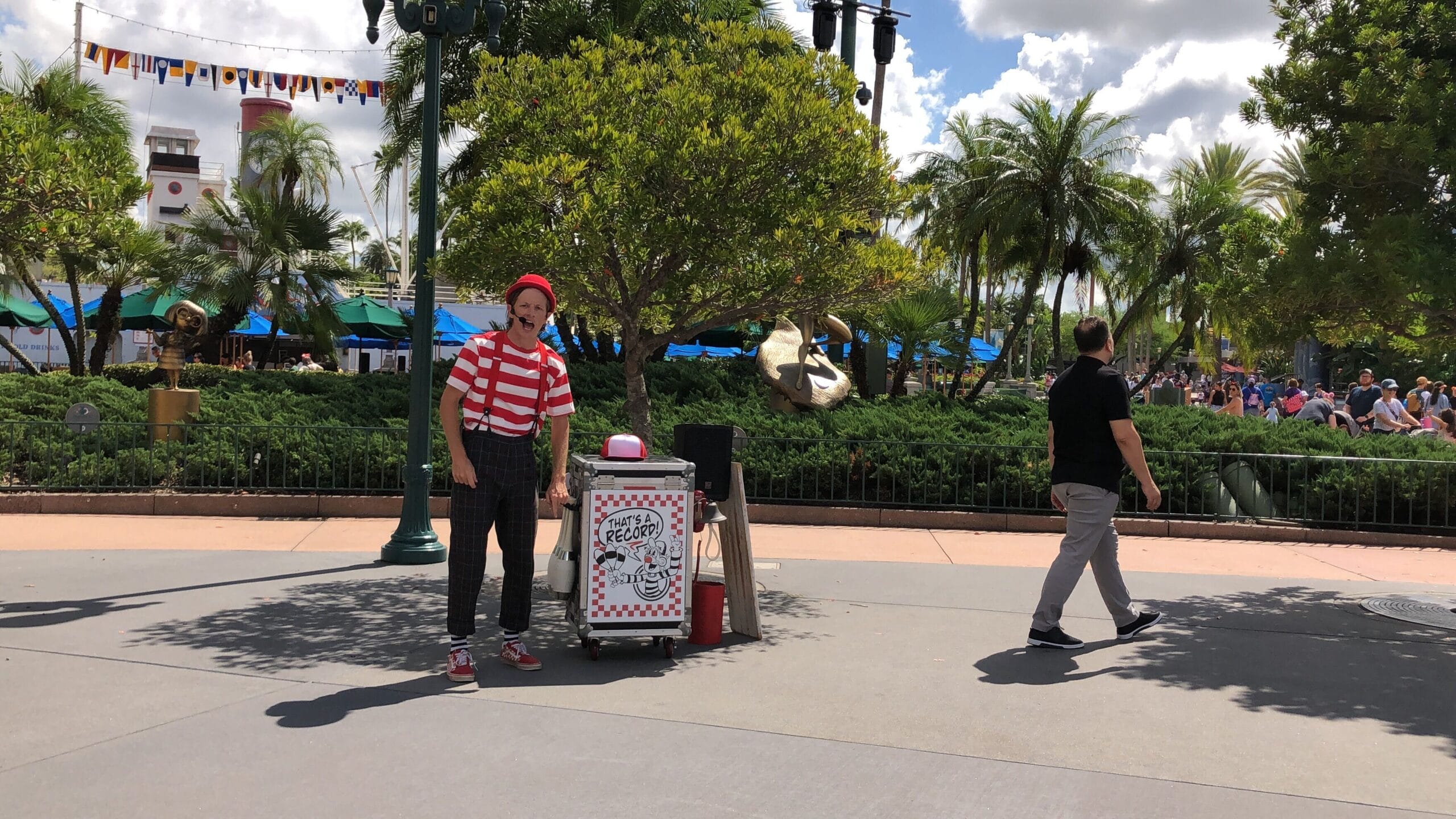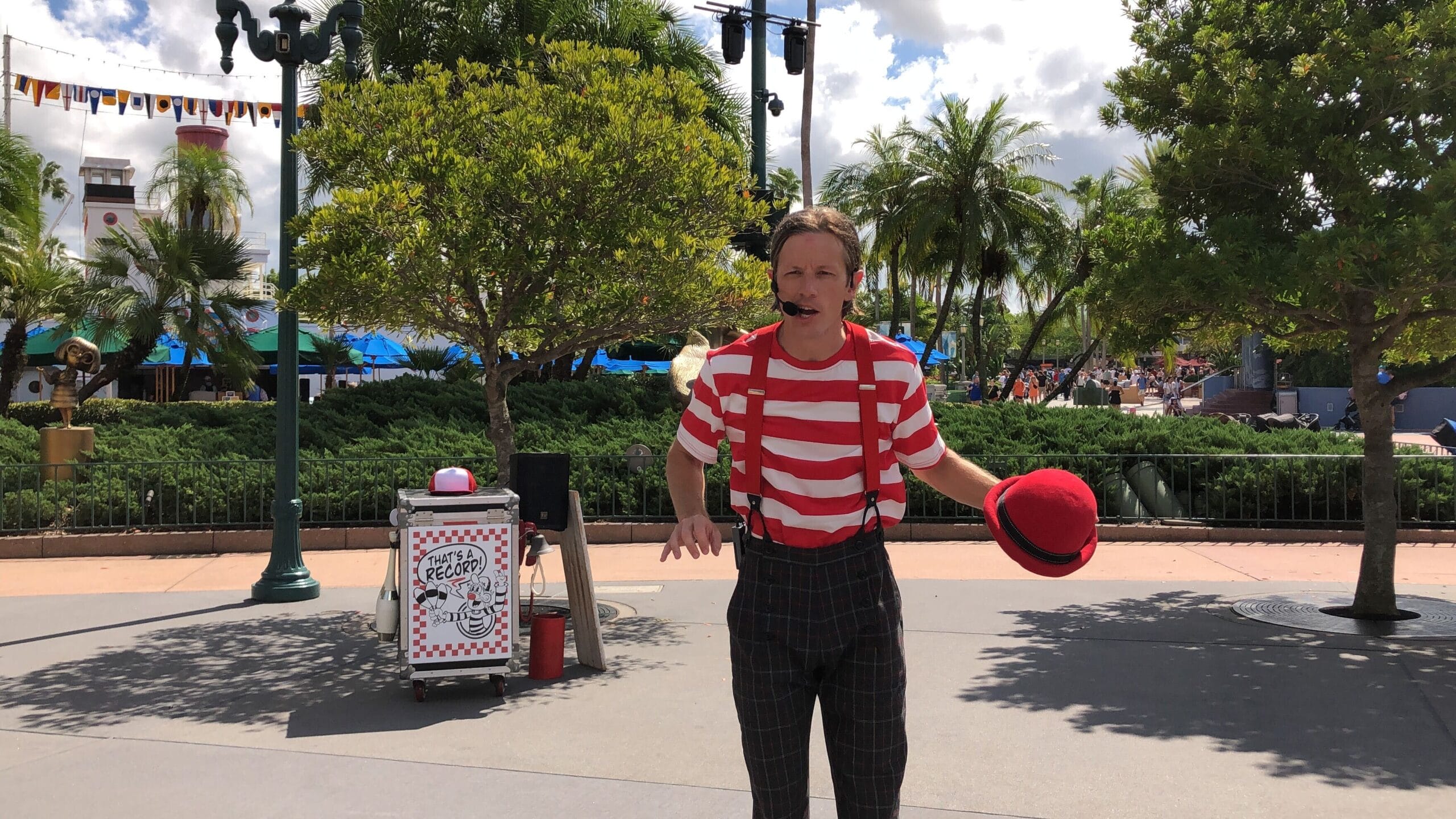 The performer introduces himself as Ben, and he explains that he has traveled to Disney’s Hollywood Studios with the goal of setting a world record. After meeting some of the nearby guests and performing a few tricks with his “juggling hat,” he breaks out some other props.