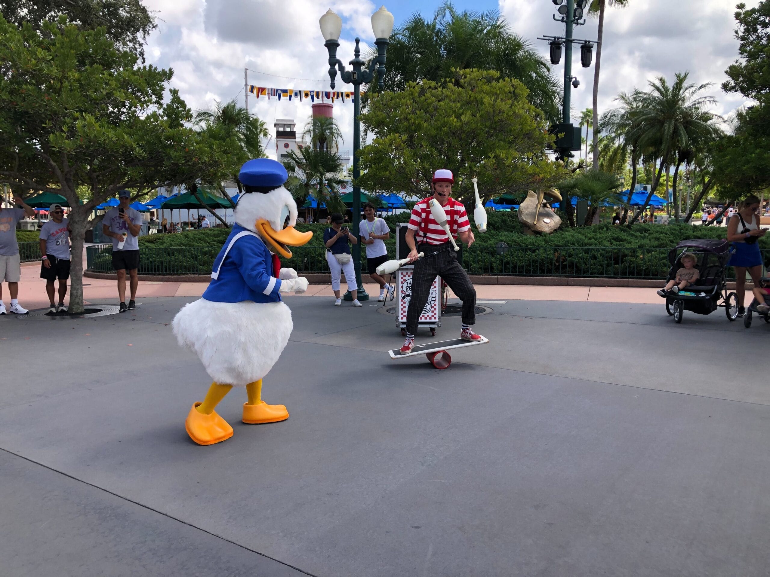 The performer juggles multiple props including balls and pins, but the feats are scattered between comedic skits and interactions with the crowd. There are also portions of the show where the performer encourages audience participation. For the show’s finale, he juggled three pins while also balancing on top of a board. Donald happened to be walking by and stopped to offer some encouragement, which seems to be a repeating segment with Donald’s appearances synced roughly around the performance schedule.