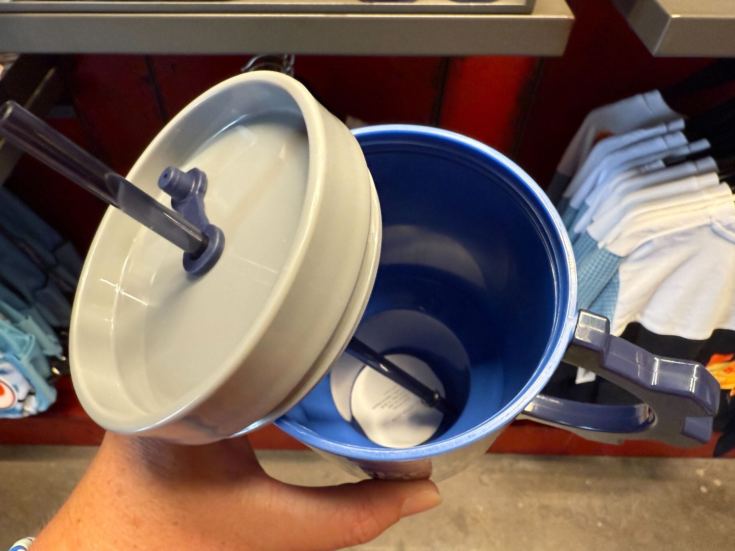The off-white lid screws off to reveal a dark blue inside, which matches the translucent navy straw and attached navy stopper.