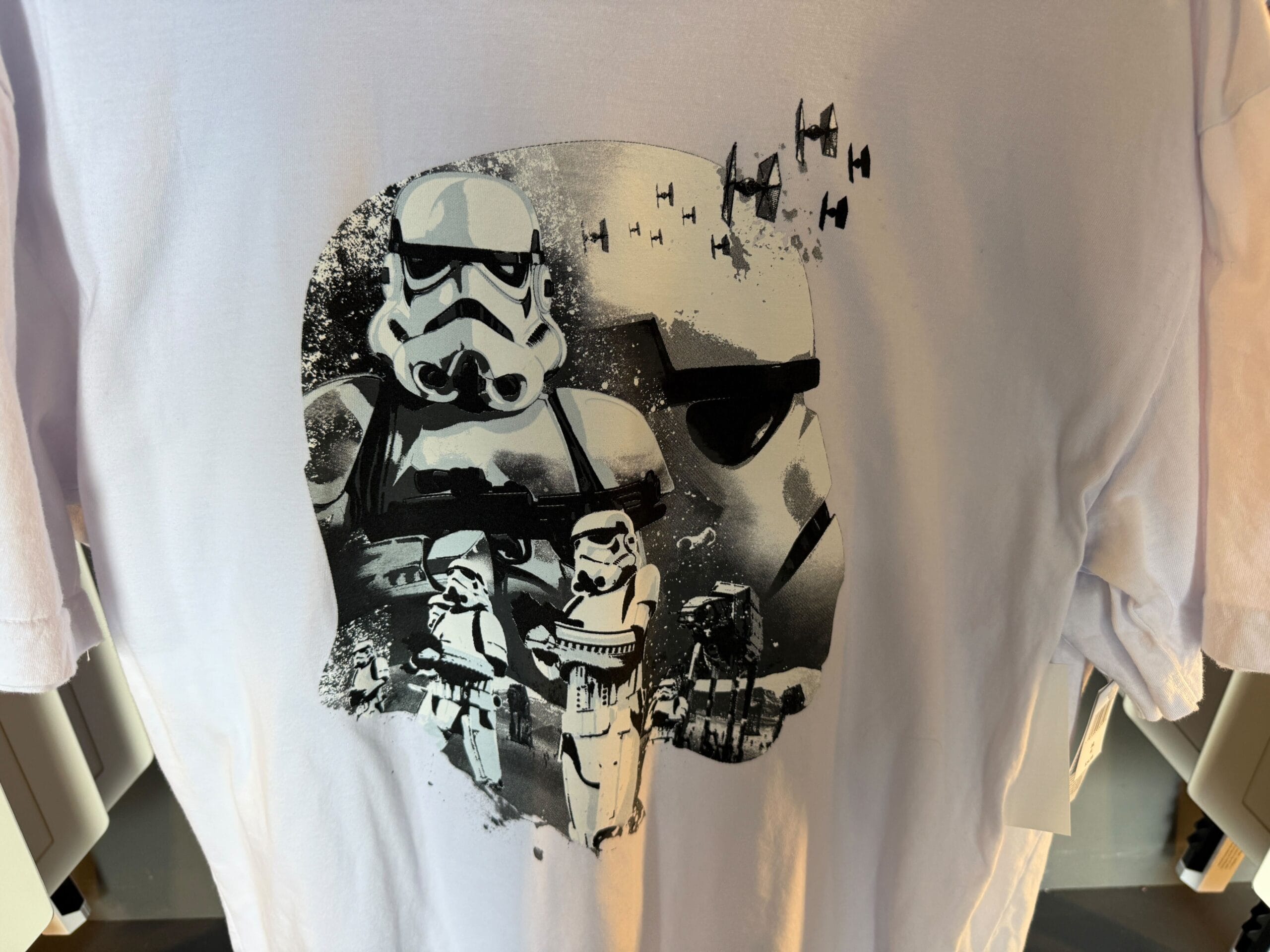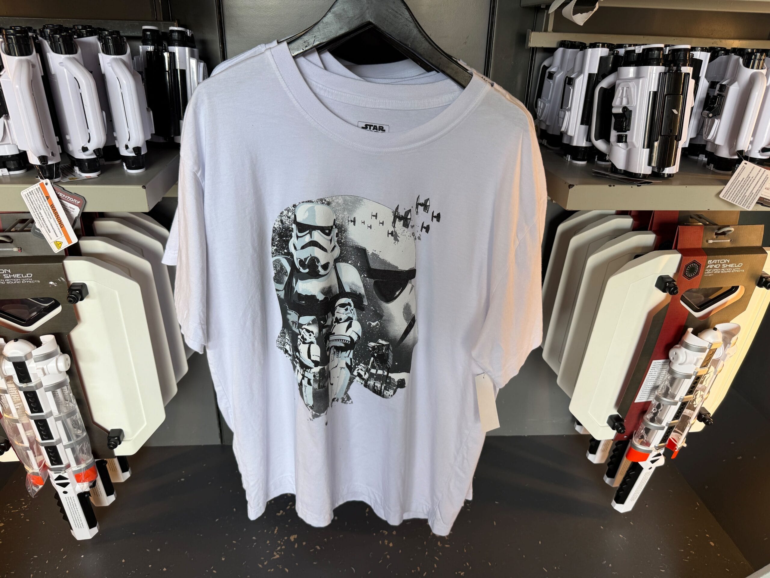 The First Order’s finest are represented on this new white shirt. A grayscale design of a Stormtrooper helmet profile contains additional images of Stormtroopers, First Order ships, and TIE fighters.