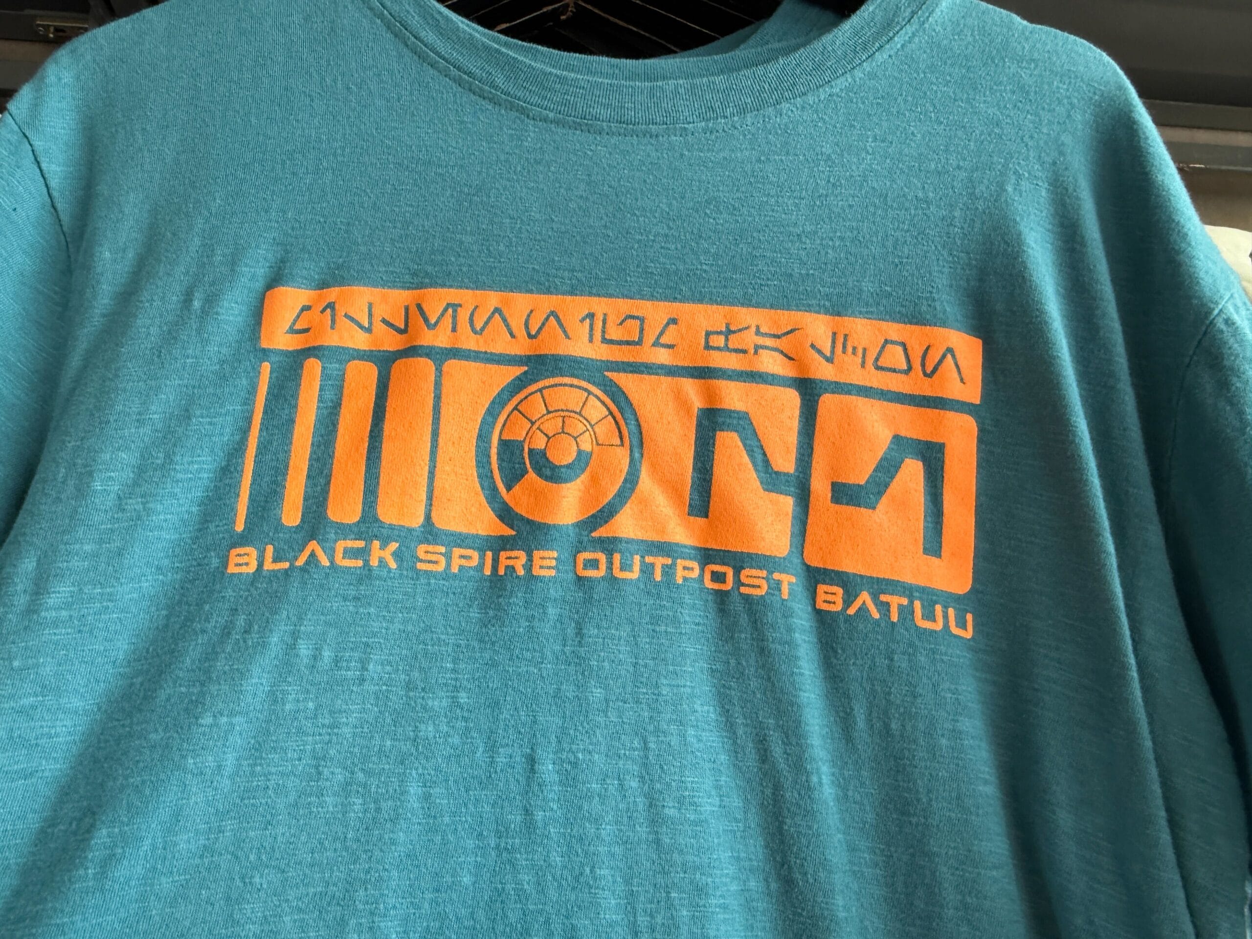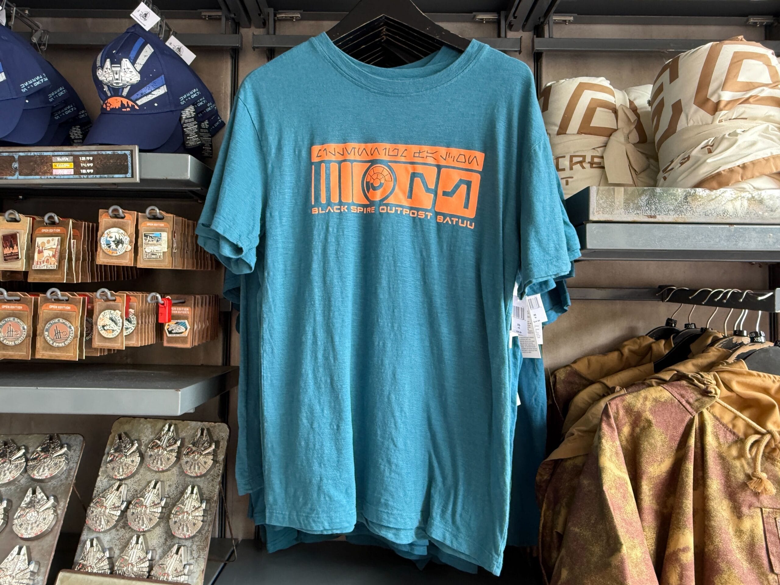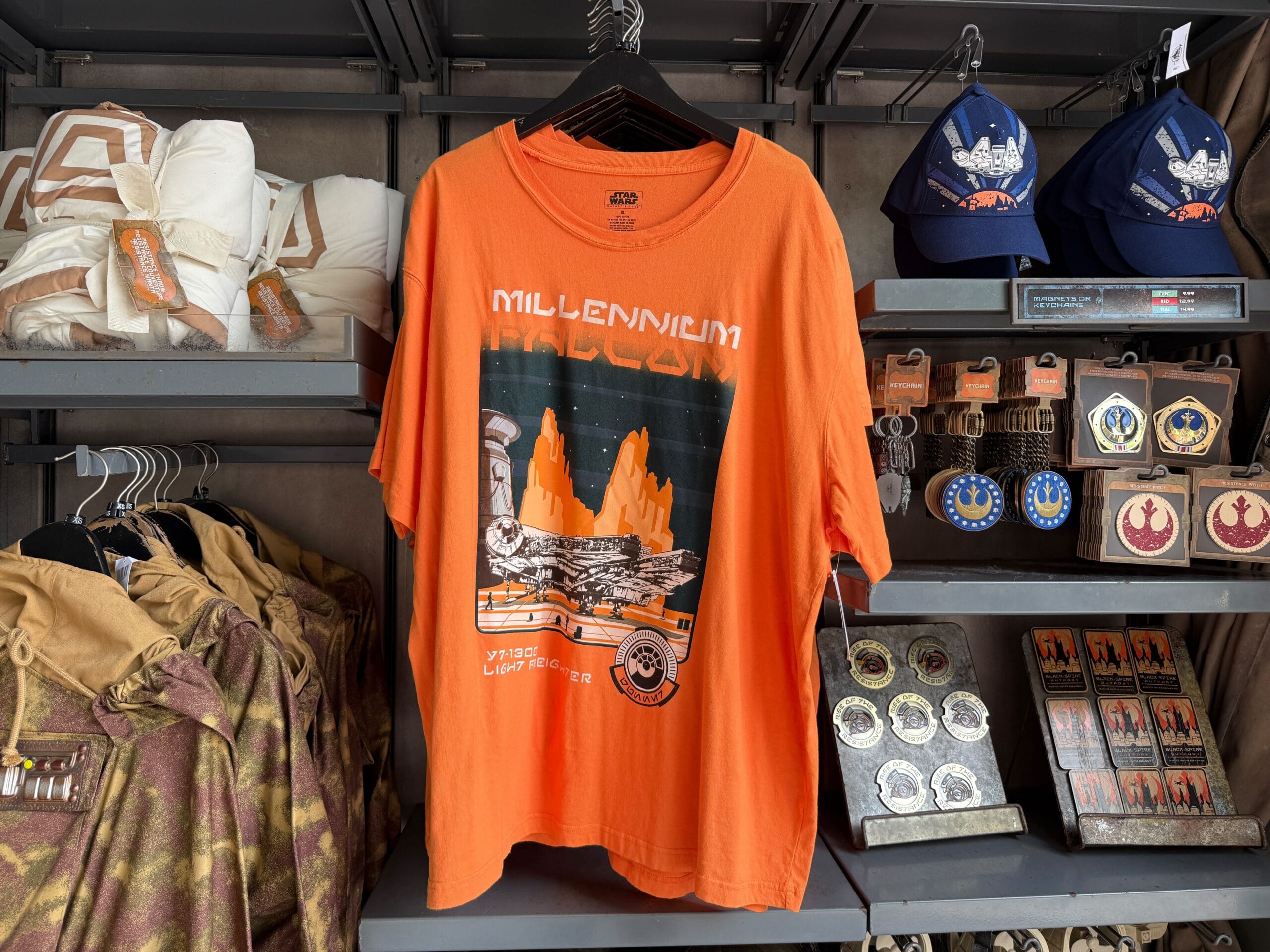 The Millennium Falcon cockpit badge design is also seen on this blue shirt with a geometric orange print and “Millennium Falcon” written in Aurebesh. The lower line of text reads “Black Spire Outpost Batuu” in English.