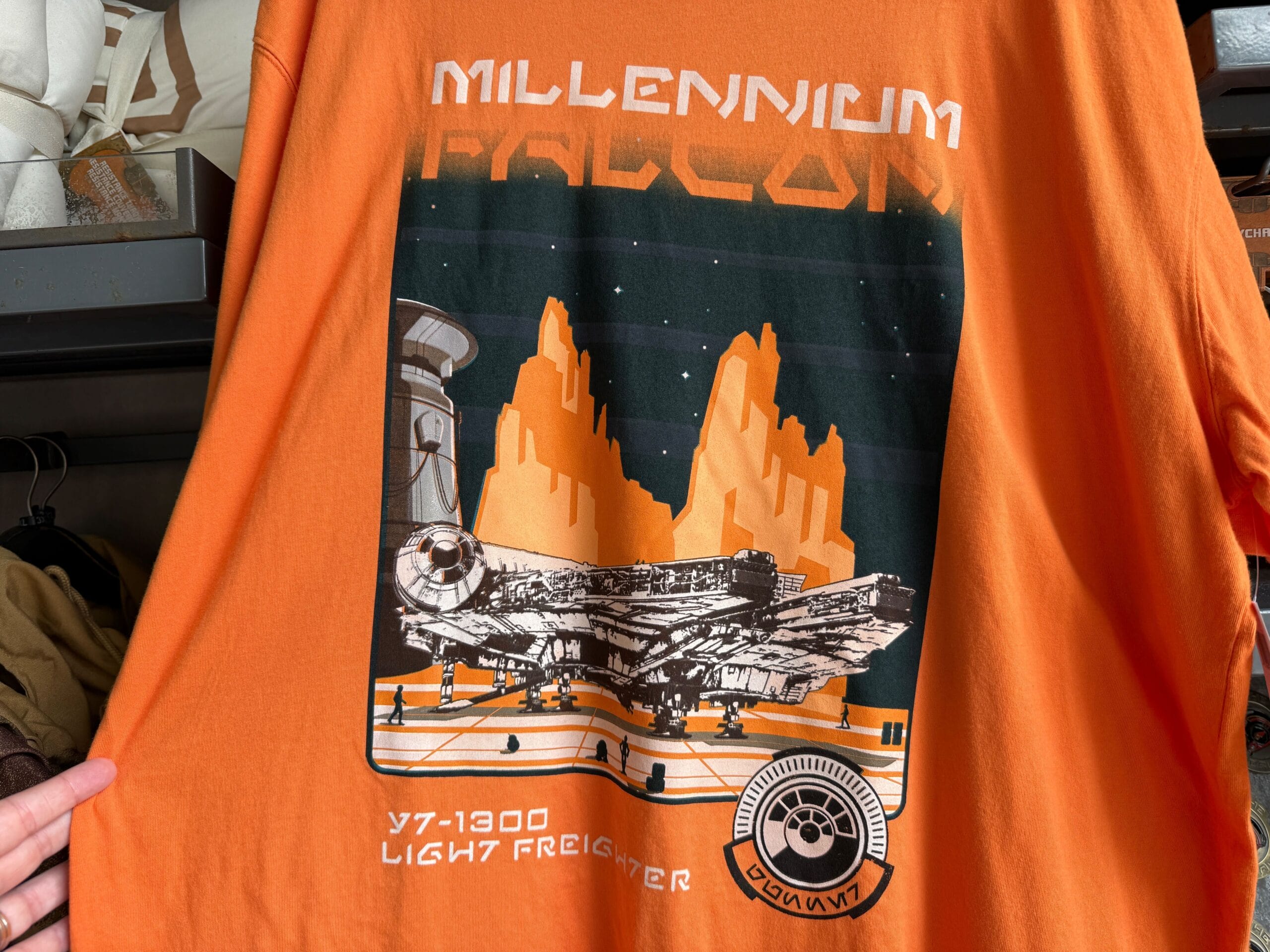 This bright orange shirt has a black, white, and orange design of the Millennium Falcon parked on a landing pad with rocks and a Black Spire Outpost structure behind it.