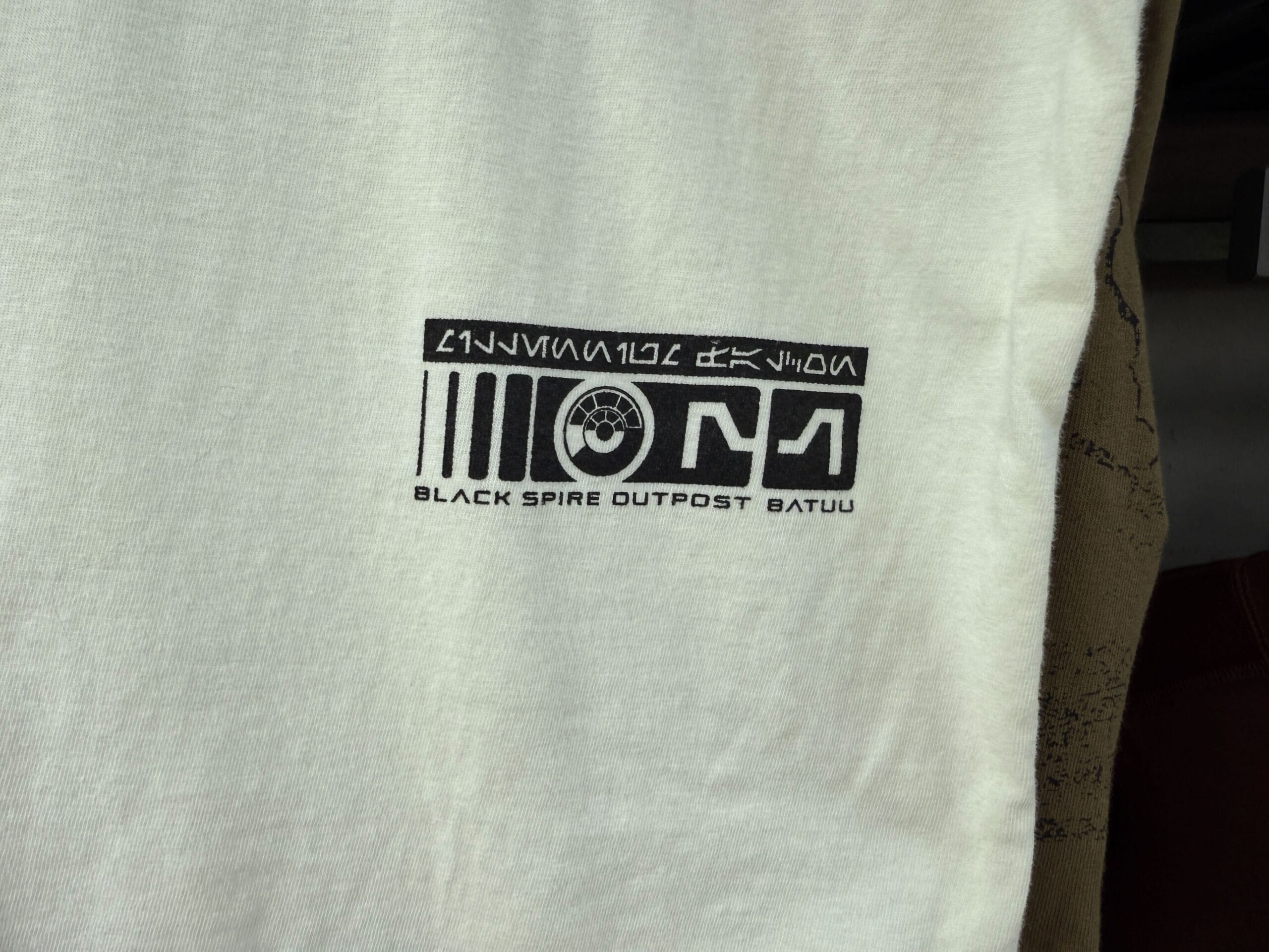 On the lower left, near the hip, is the same rectangular Millennium Falcon Aurebesh / Black Spire Outpost Batuu graphic, but printed in black.