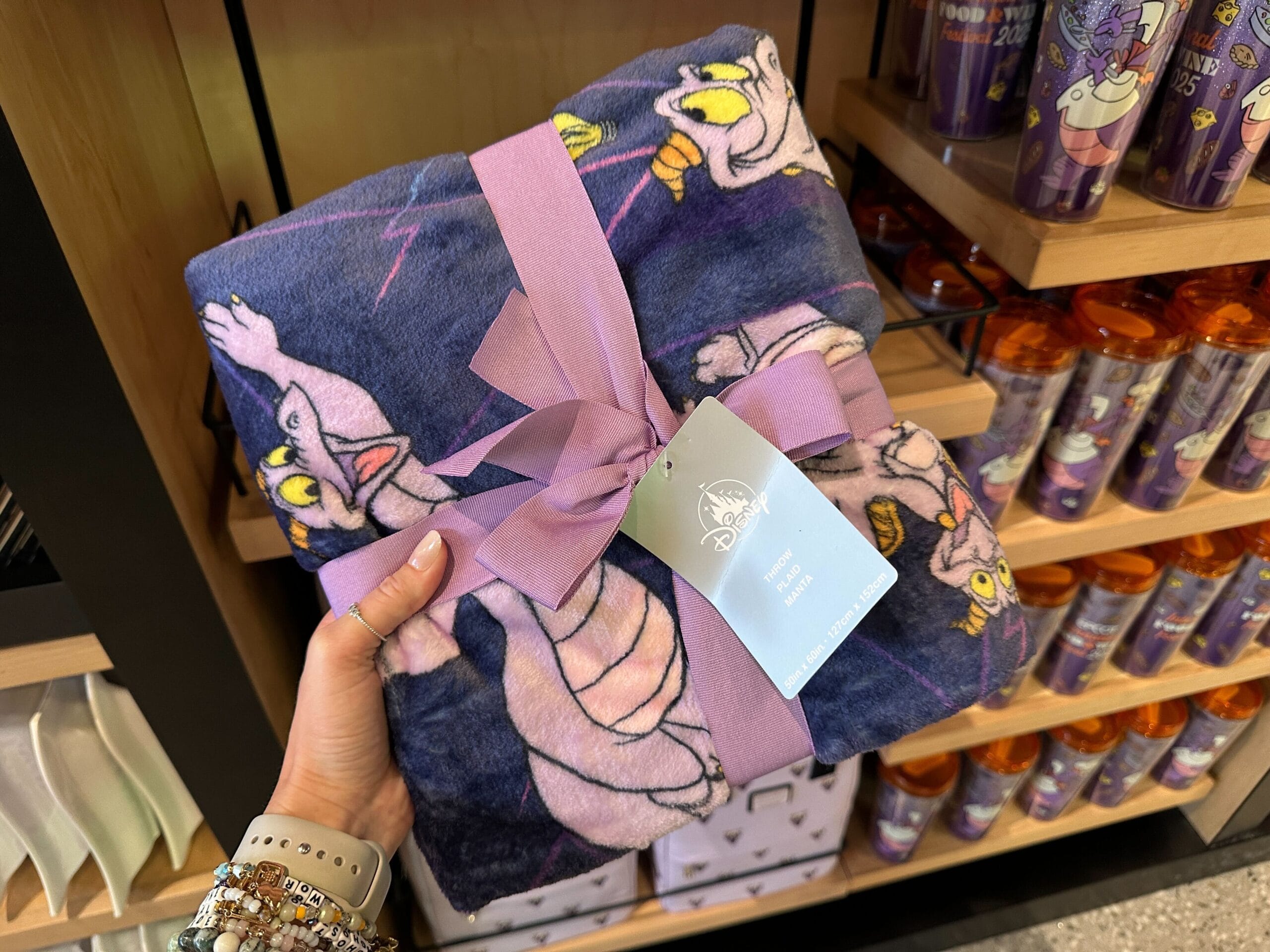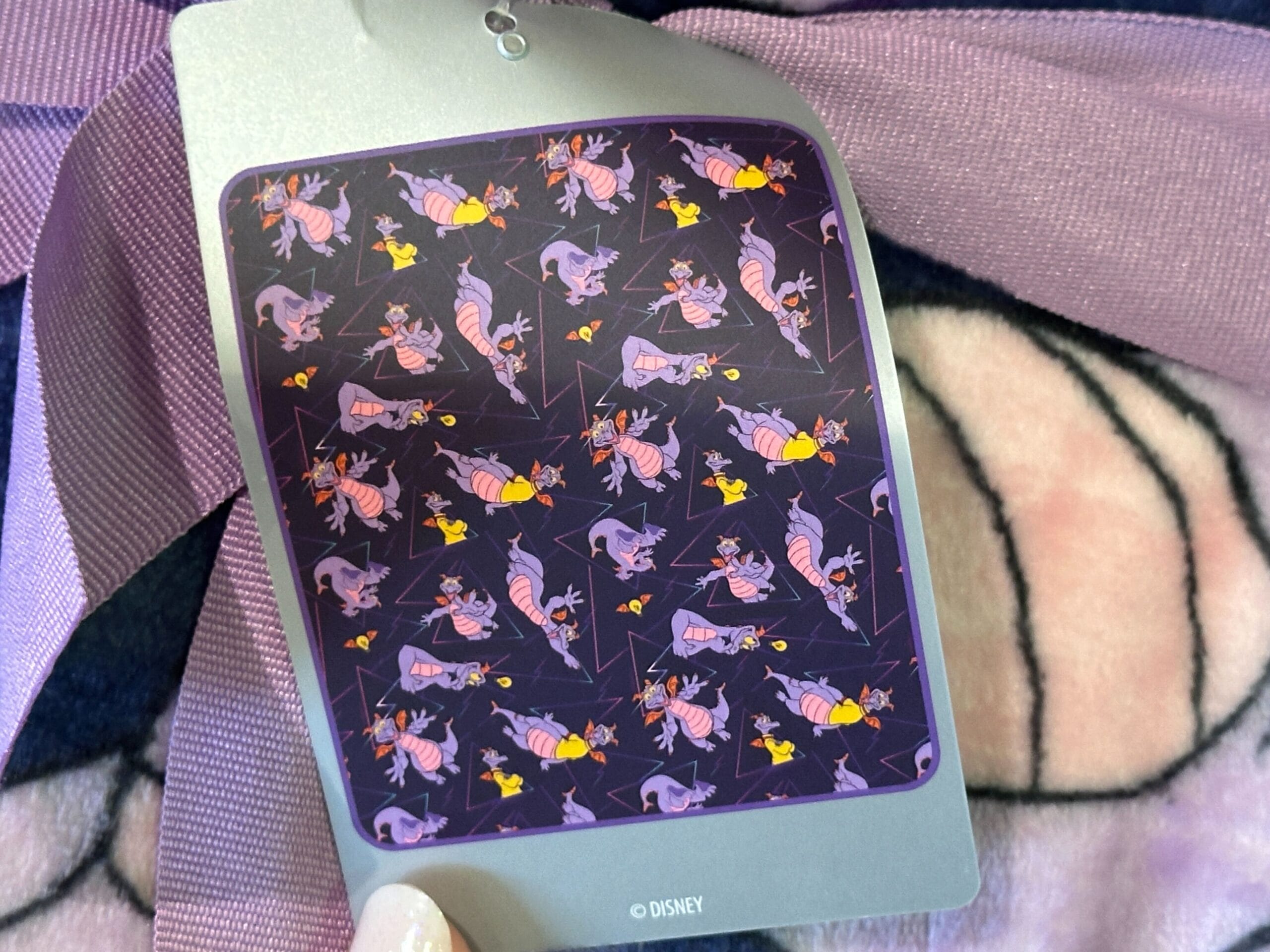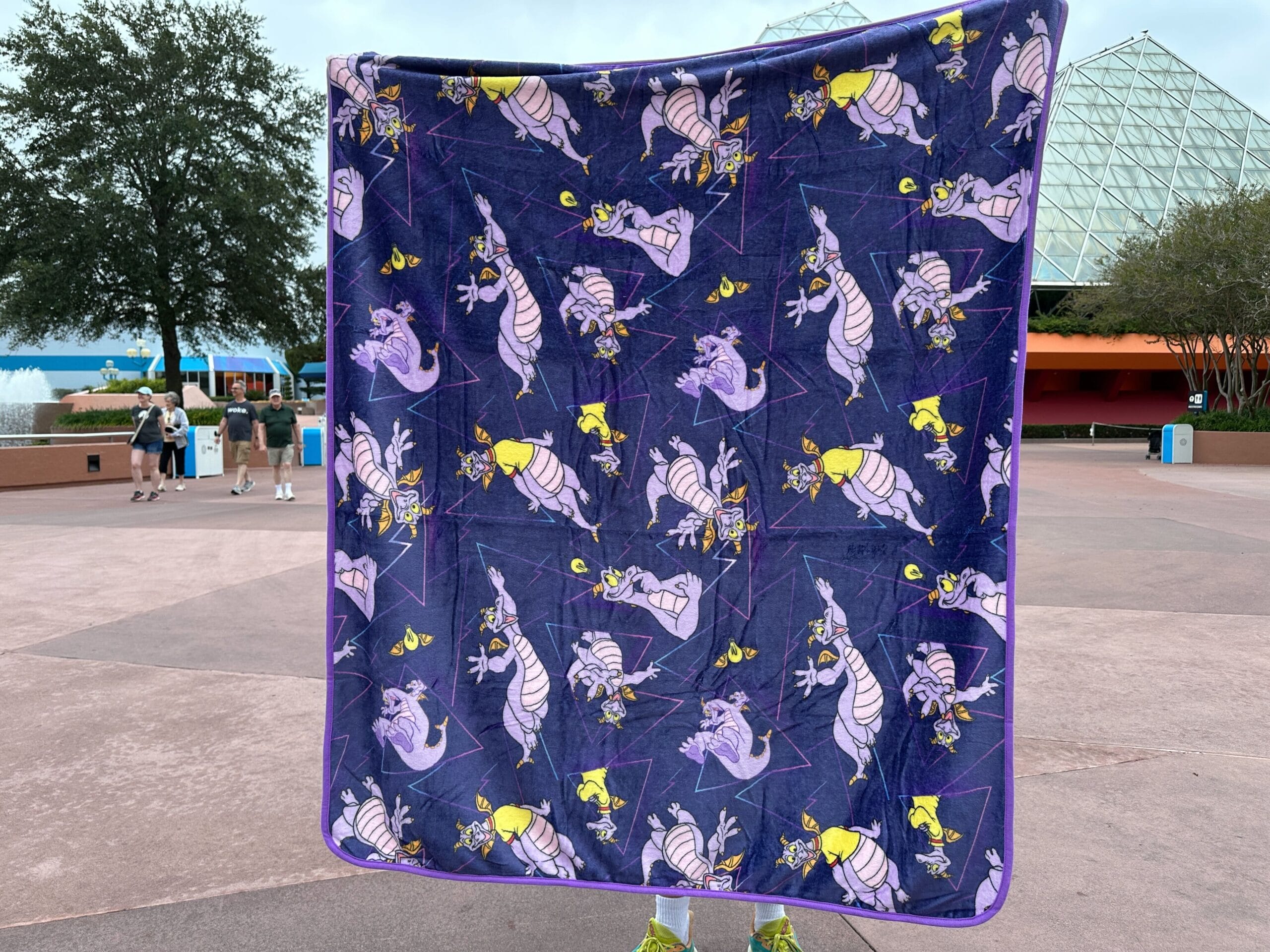 A new blanket featuring Figment has arrived in Creations Shop at EPCOT. It is a deep purple color with Figment in various poses. Some of the poses show him flying, jumping, and thinking. An 80’s style line pattern and lightbulbs with wings also cover the blanket. Both sides are the same pattern.