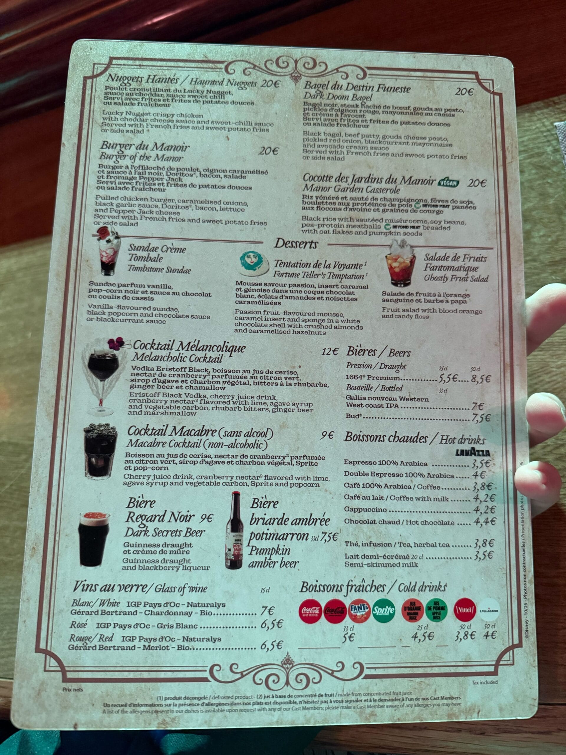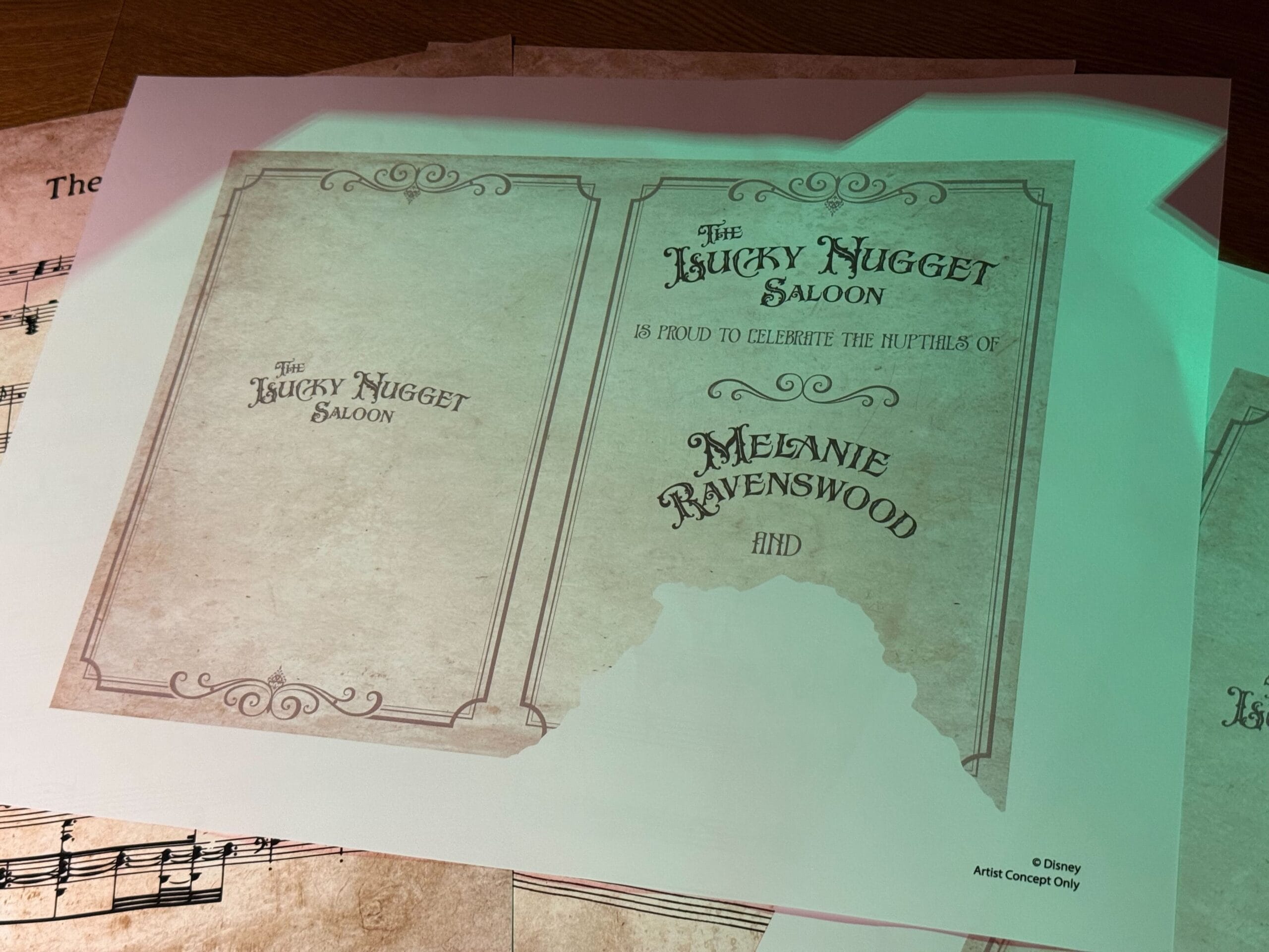 We got to see the designs up close during a media preview. Each has the groom’s name missing, representing the four dead grooms depicted in Phantom Manor’s stretching room. The way the menu is damaged represents the groom’s death — wet for the one that went over a waterfall, ripped for the one killed in a bear attack, burnt for the one who exploded, and torn one for the one who died in a sawmill.