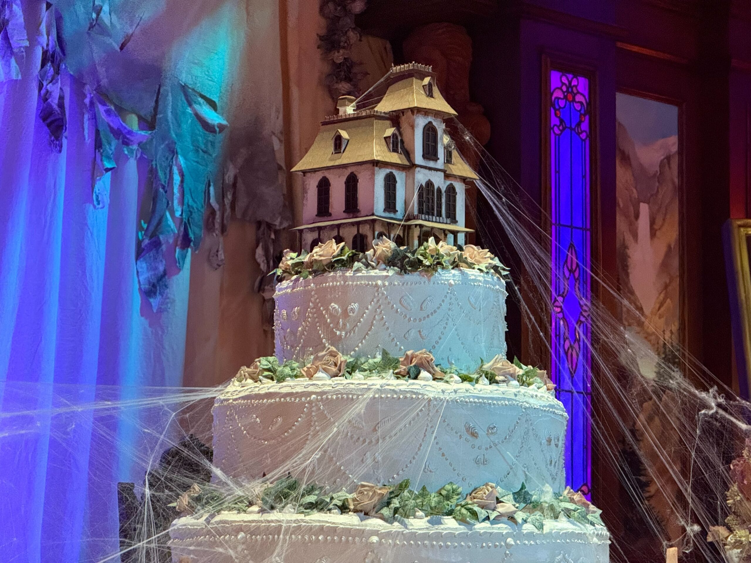 Blue atmospheric lightning illuminates the dining area and stage. More flowers and tattered drapes hang from the balcony. Cobwebs are on the light sconces. It took 256 hours of work to bring the space to life. 150 lights were changed.