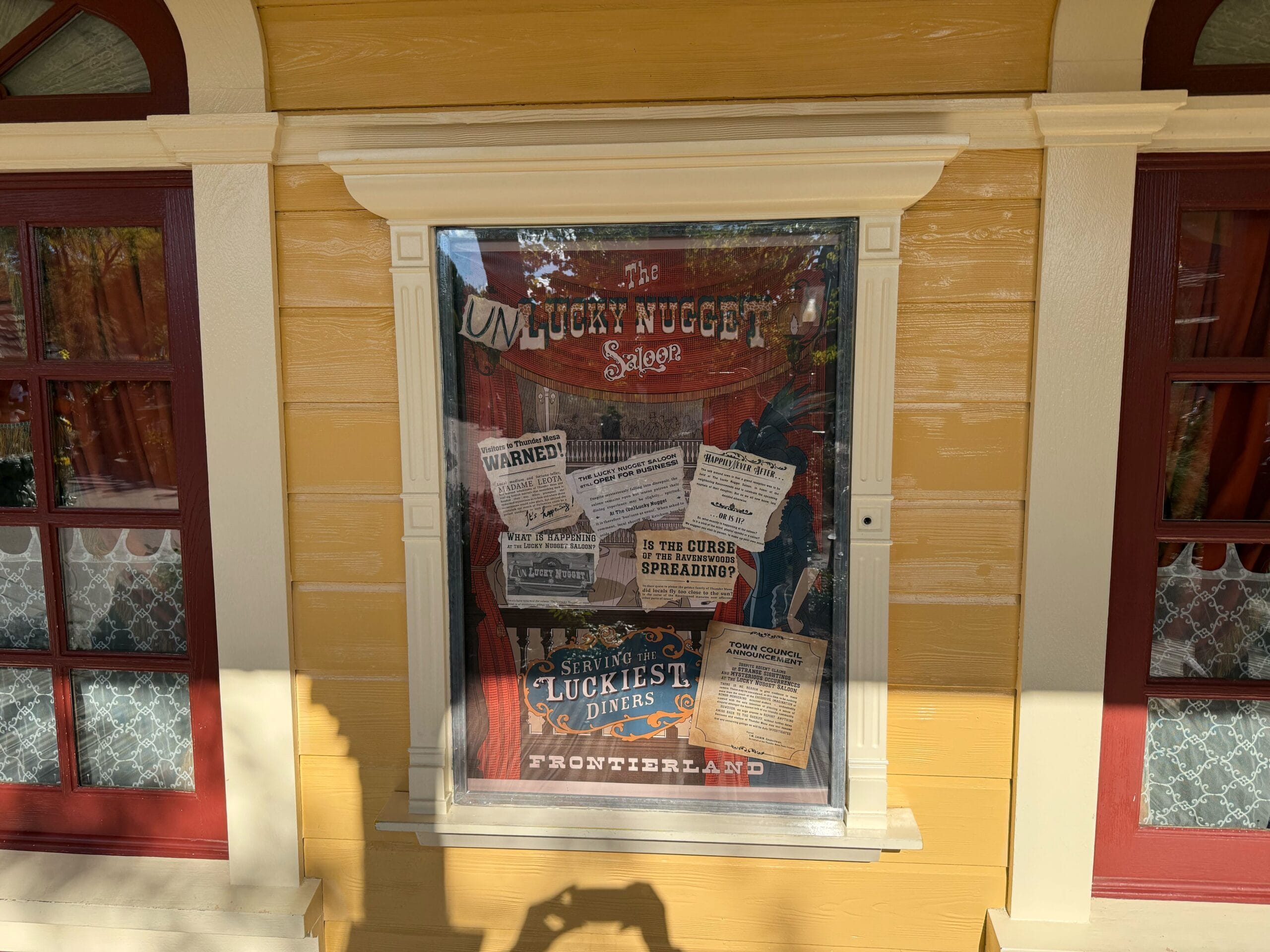 A poster outside seems to have been defaced with the addition of “Un” and various newspaper clippings. The titular Phantom of Phantom Manor is also pictured lurking on the saloon’s balcony.