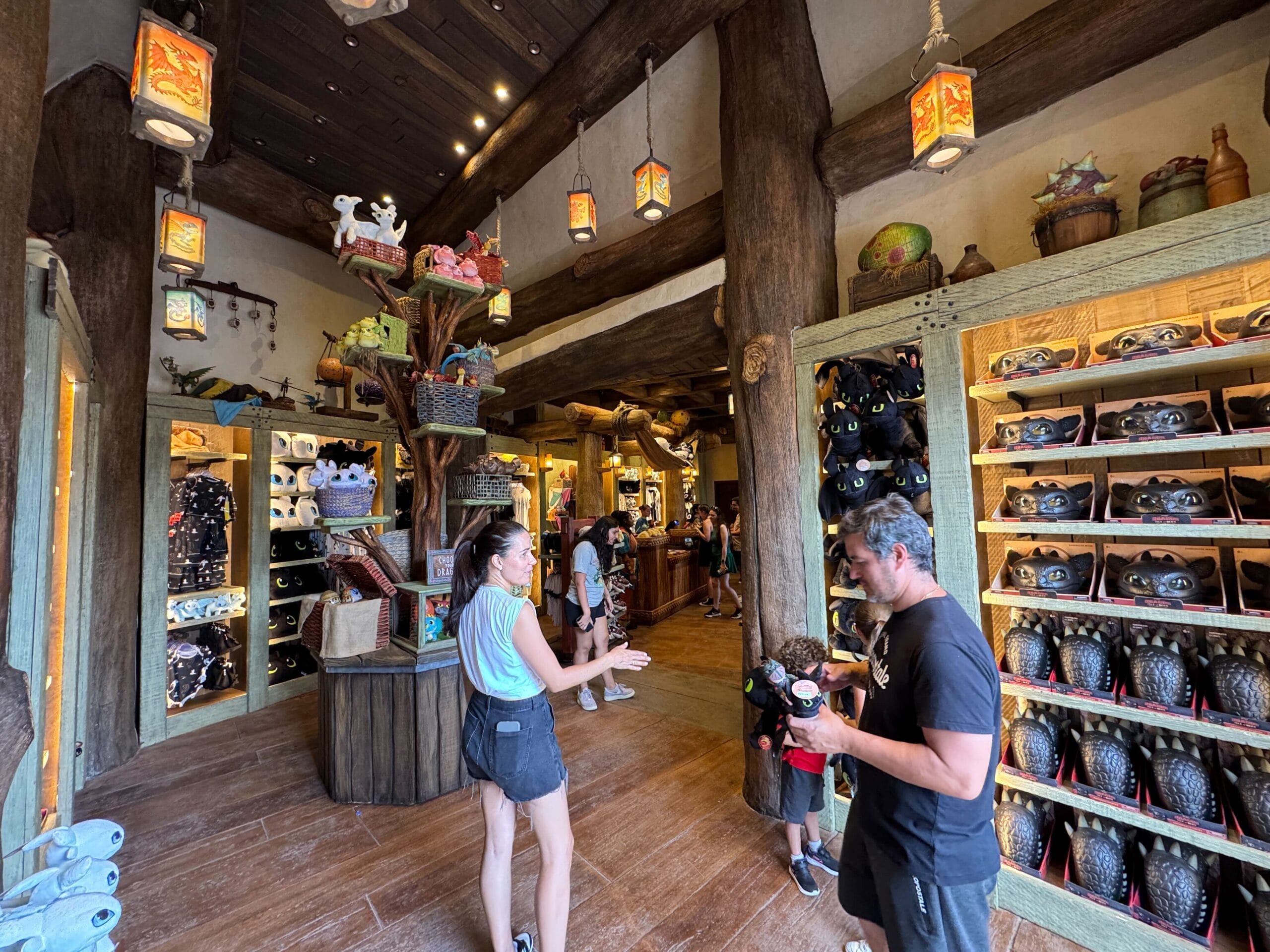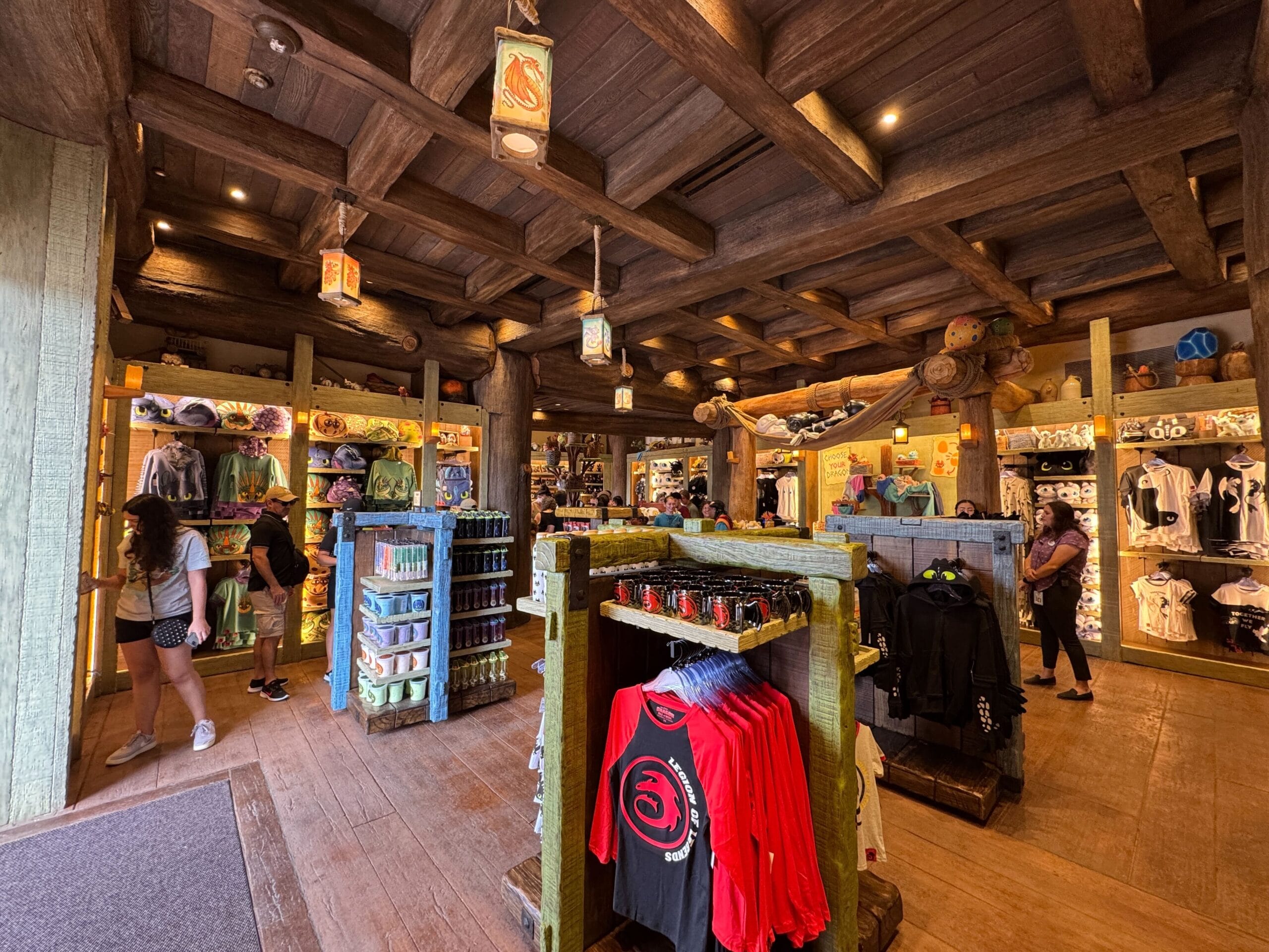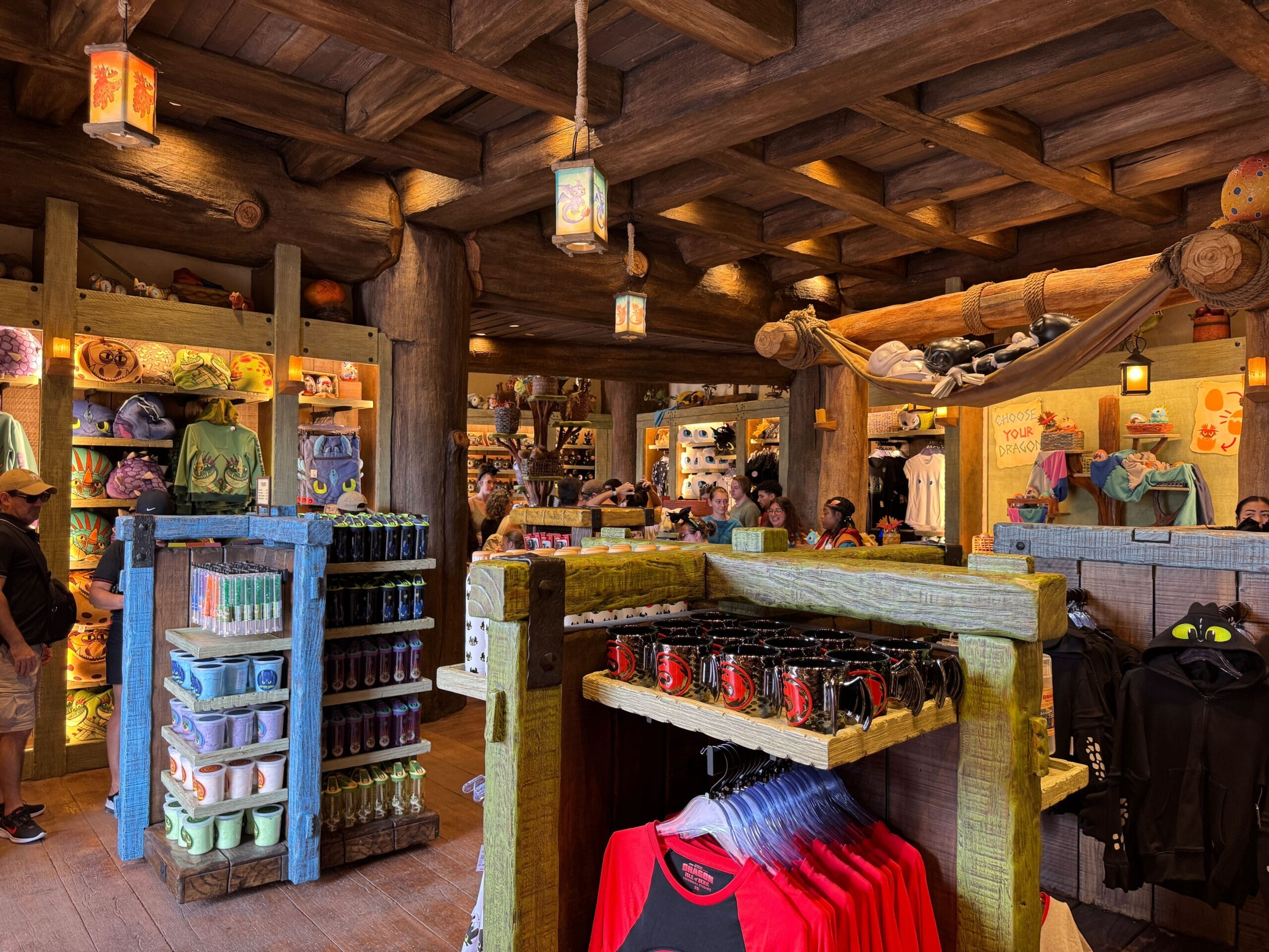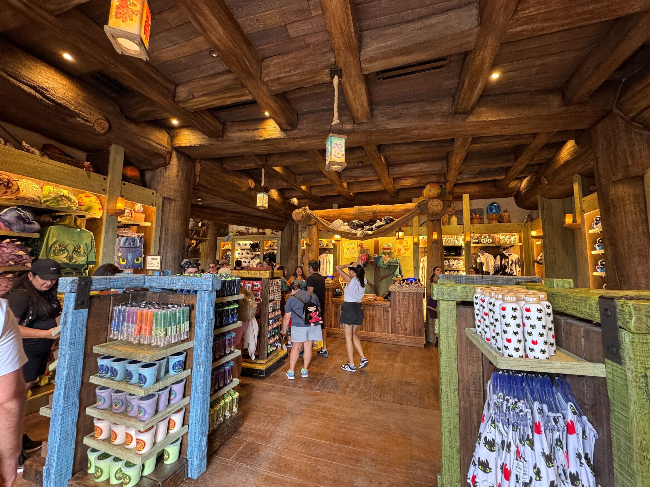 Upon entering Toothless’ Treasures, guests are welcomed with warm wooden tones and colorful shopping displays. Lanterns glow with images of dragons from the film, including Toothless, Meetlug, Hookfang, and Stormfly.