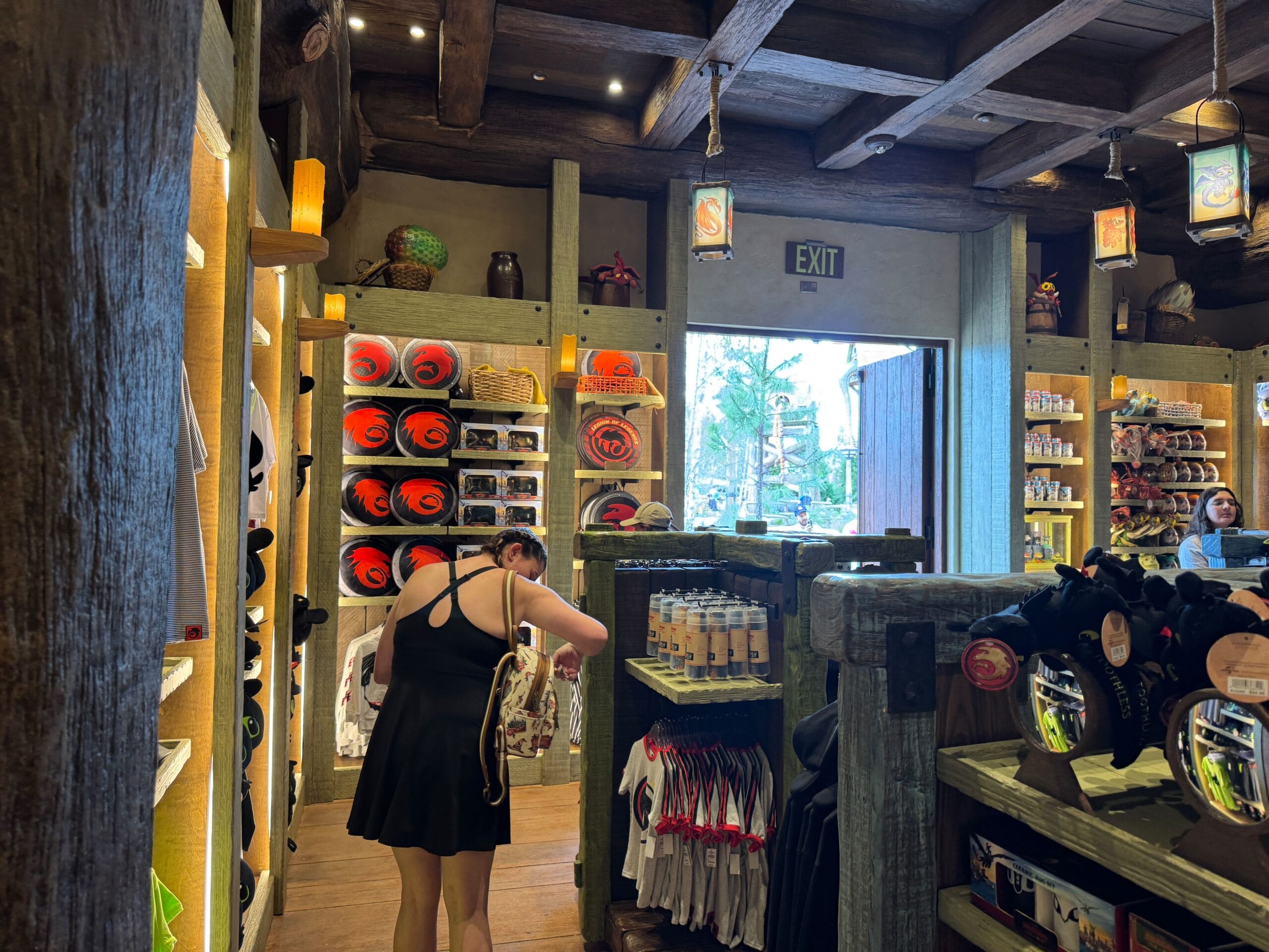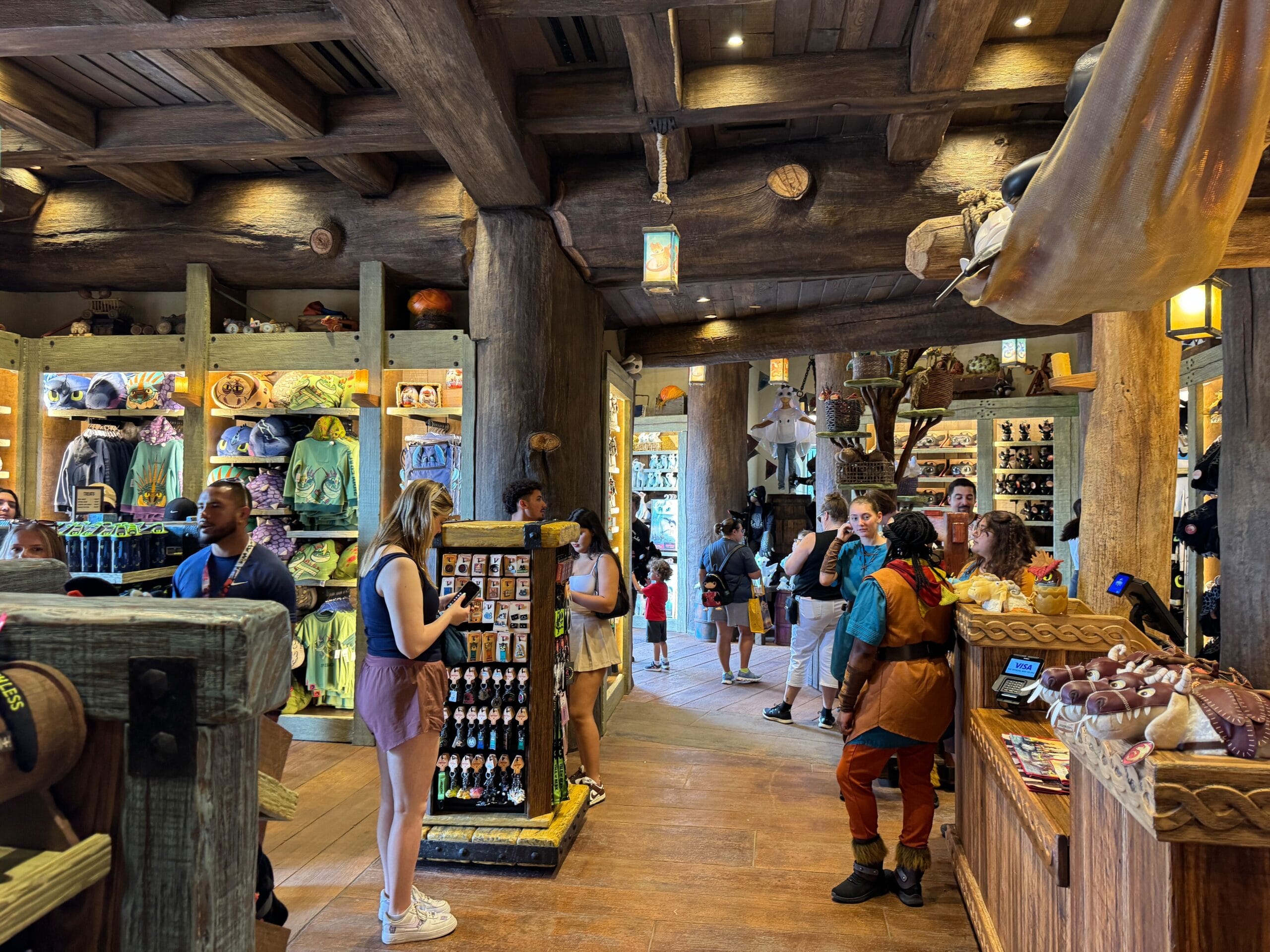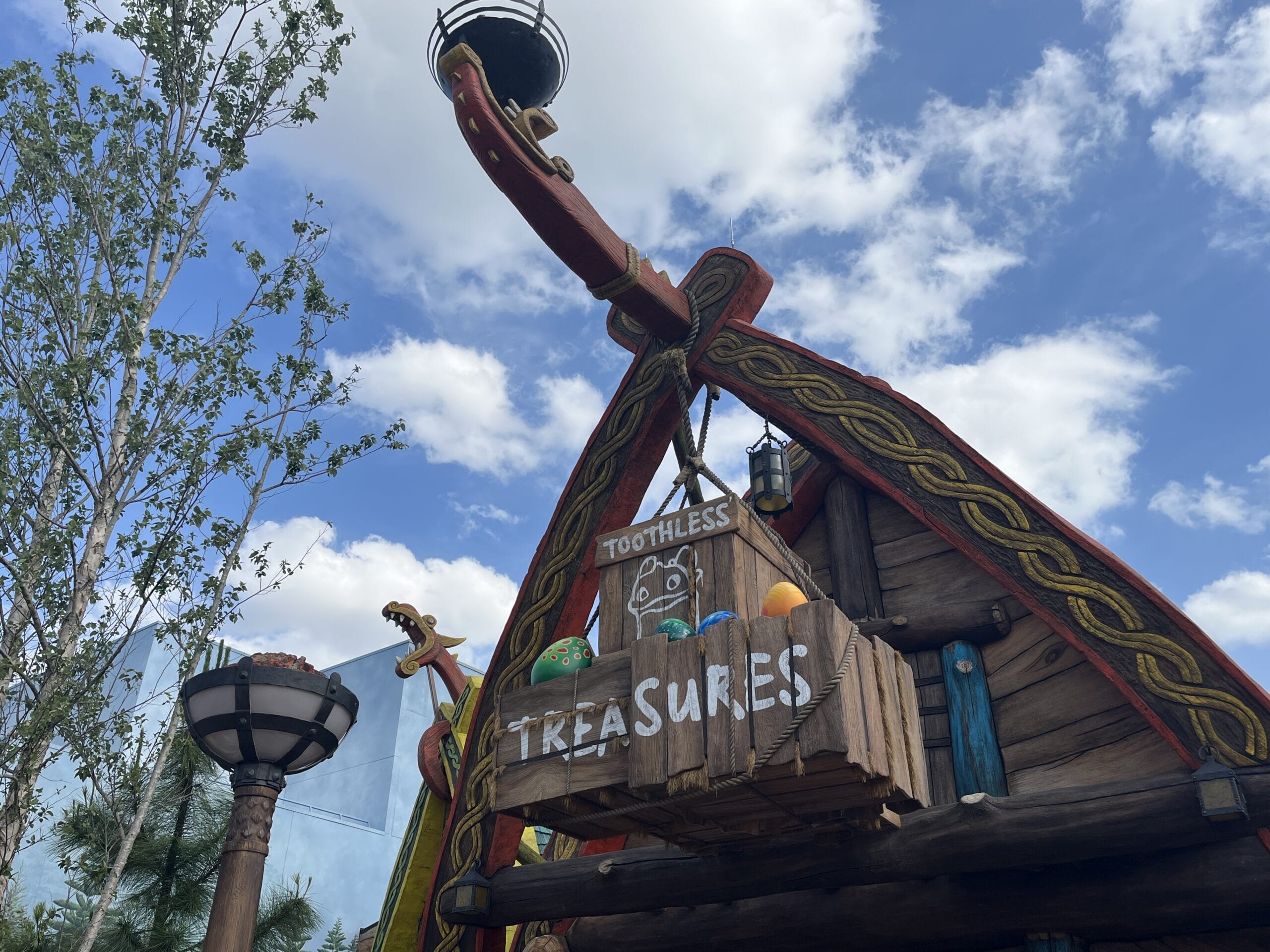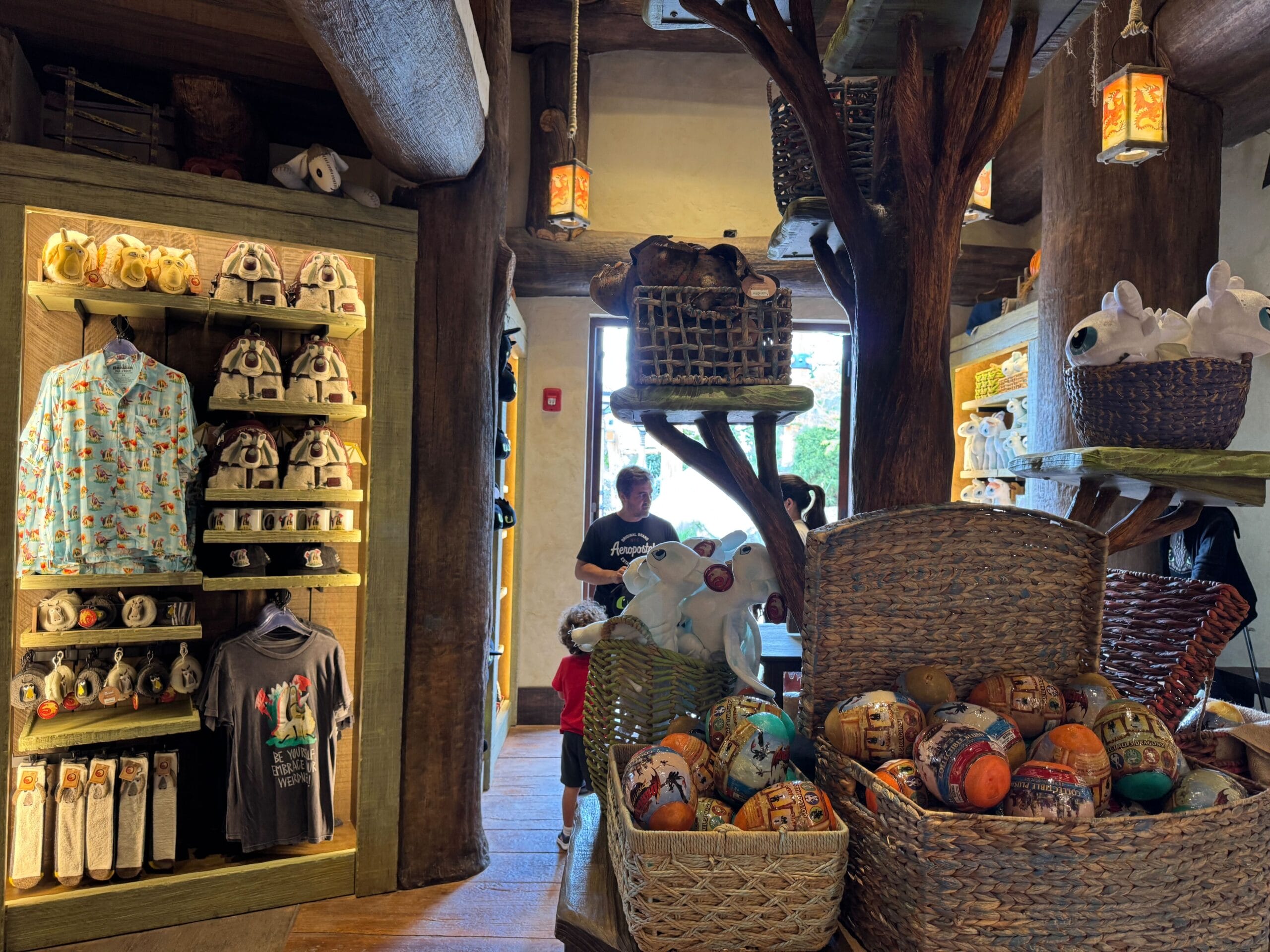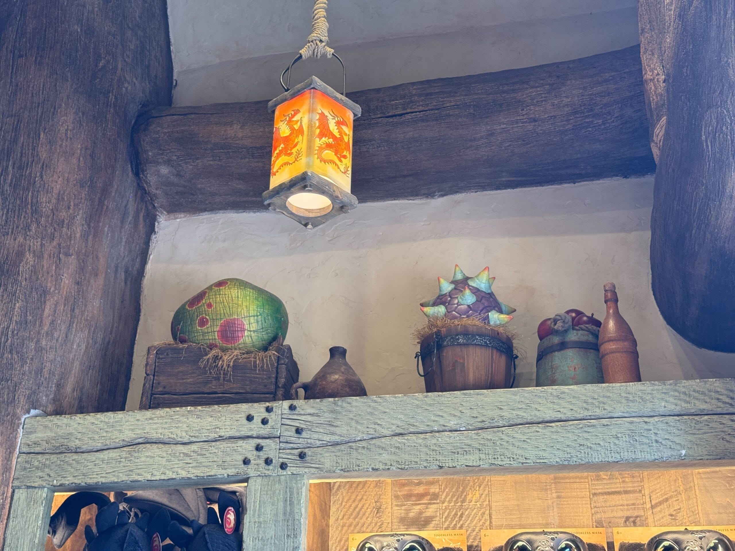 Upon entering Toothless’ Treasures, guests are welcomed with warm wooden tones and colorful shopping displays. Lanterns glow with images of dragons from the film, including Toothless, Meetlug, Hookfang, and Stormfly.