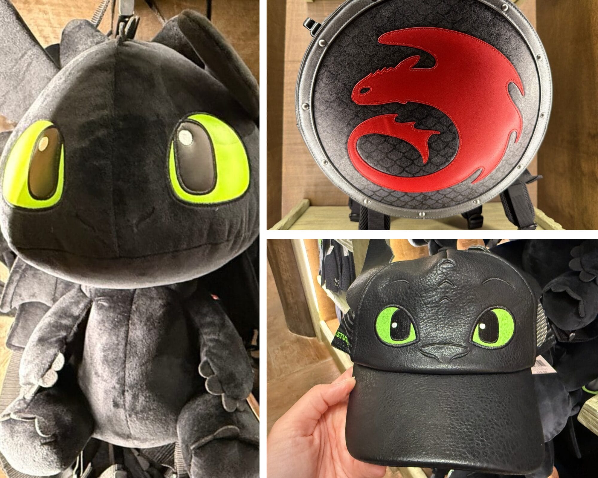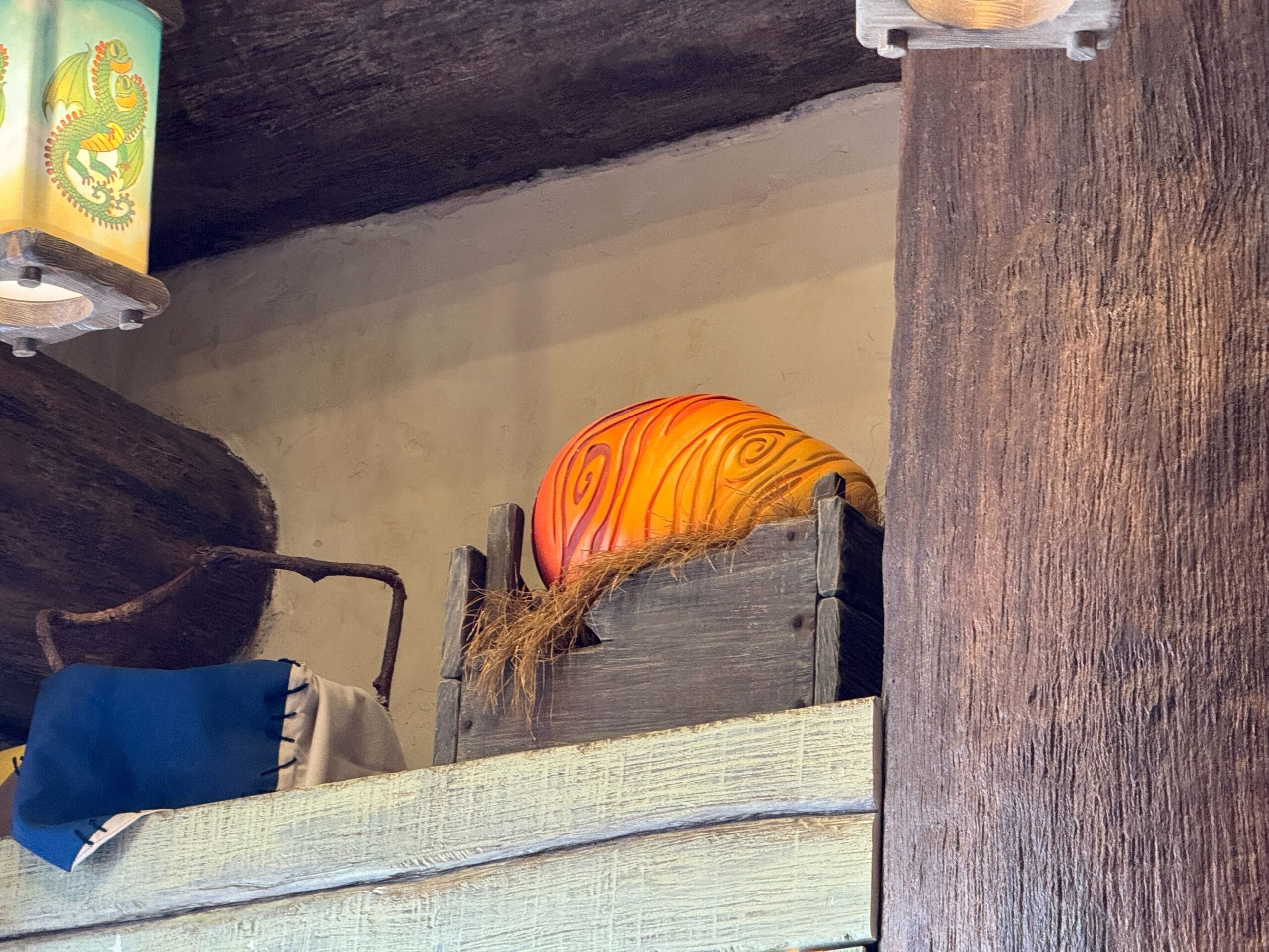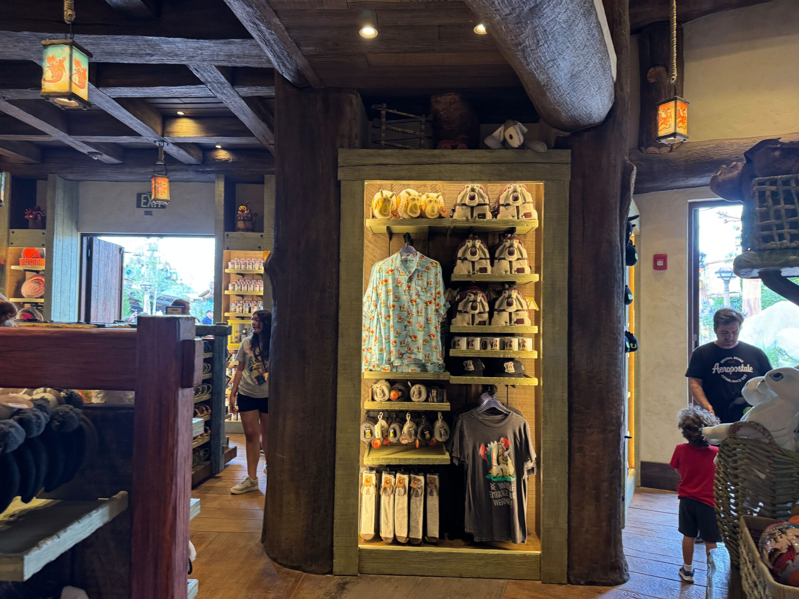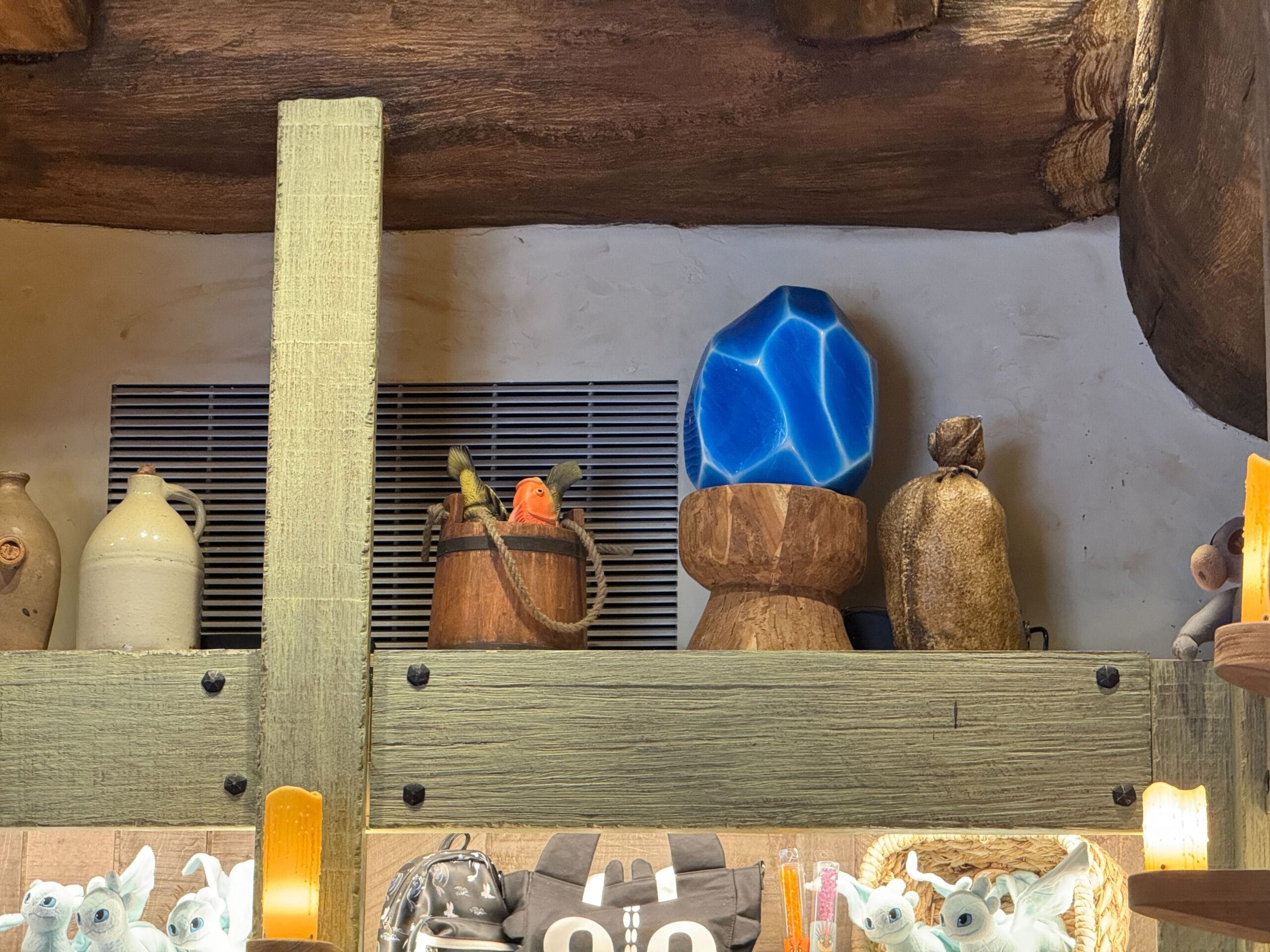 Upon entering Toothless’ Treasures, guests are welcomed with warm wooden tones and colorful shopping displays. Lanterns glow with images of dragons from the film, including Toothless, Meetlug, Hookfang, and Stormfly.