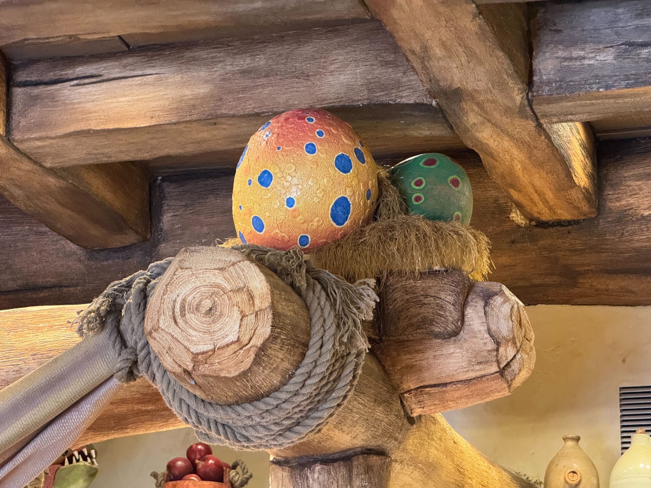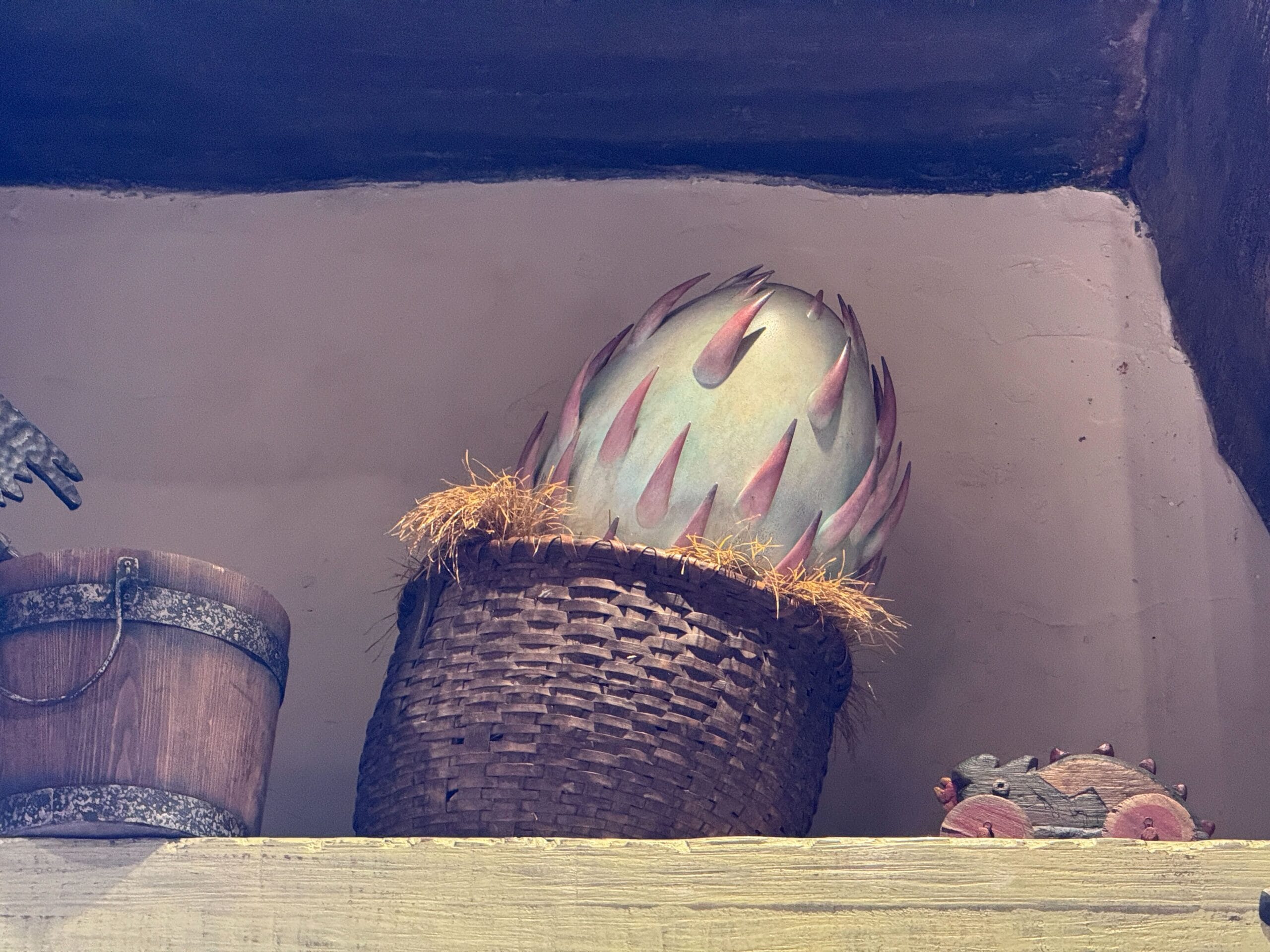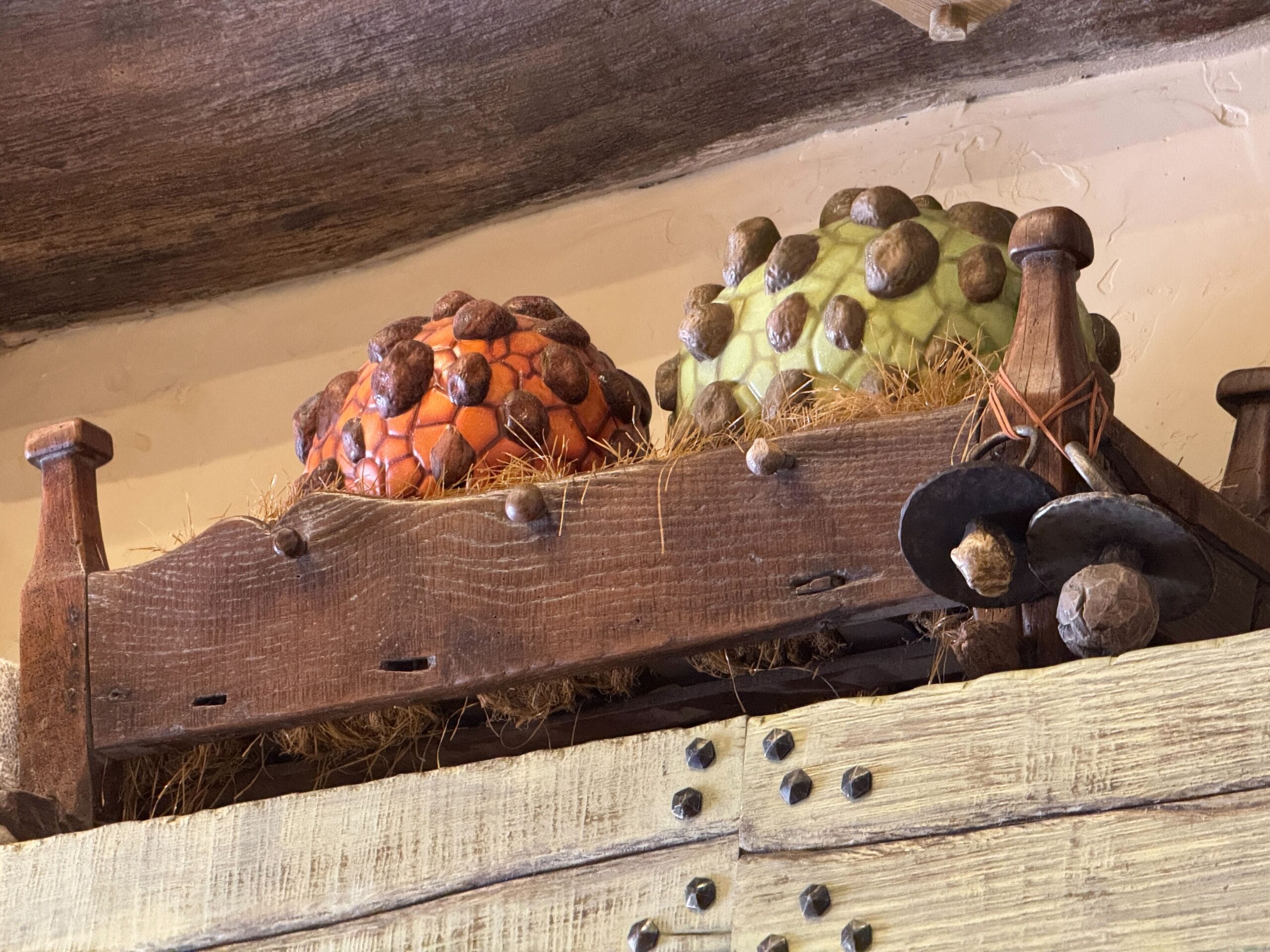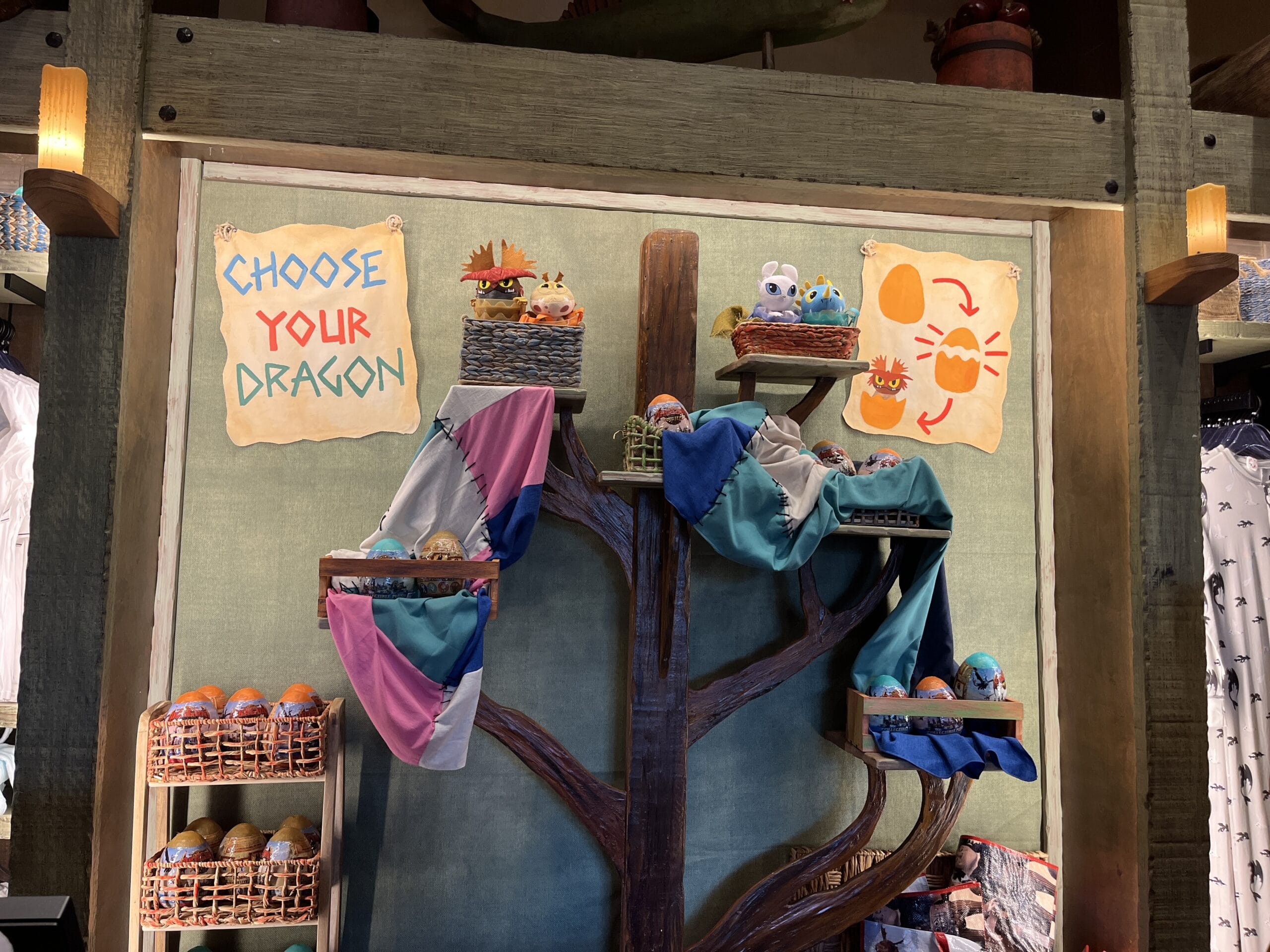 After choosing a colored egg, Team Members lead the ceremony with “I promise to take care of this dragon like a true Viking,” drumrolls, and assisted hatching. Several of the available dragons are displayed behind the counter.